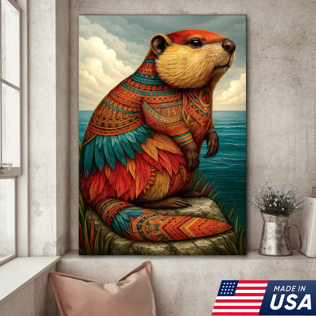 Tribal Beaver Canvas Wall Art, Native American Spirit Animal Design, Colorful Symbol of Strength and Creativity Nature Decor Gift