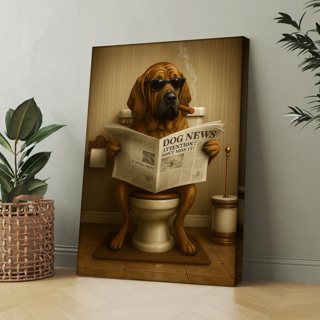 Funny Rustic Dog Bathroom Canvas – Bloodhound Smoking Reading ‘Dog News’ - Hunting Hunters Cabin Decor, Gift for Dad or Husband