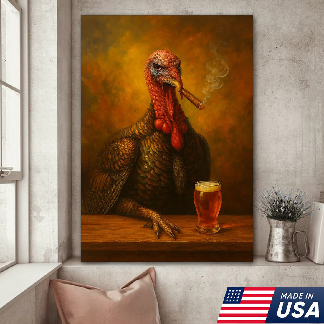 Funny Turkey Drinking Cocktail Glasses and Smoking Canvas – Rustic Farmhouse Wall Art