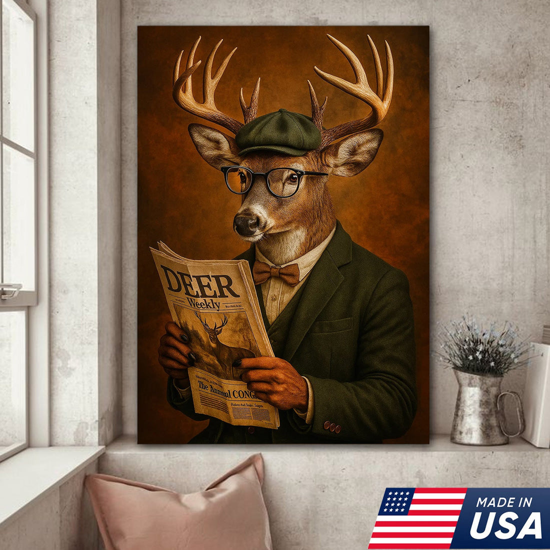 Funny Deer Gentleman Reading Newspaper Canvas – Rustic Hunting Lodge Wall Art