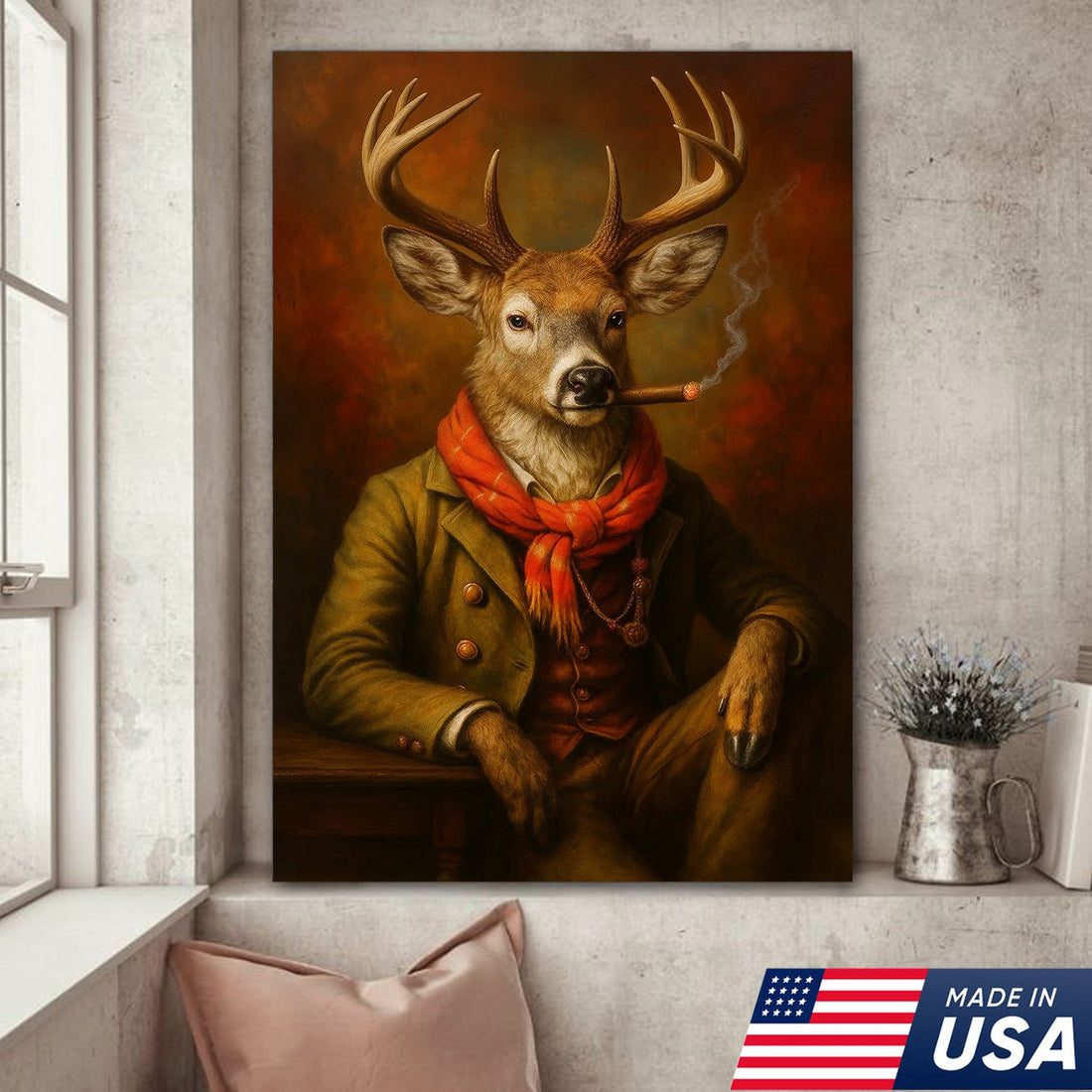 Vintage Deer Canvas Wall Art - Gentleman Stag with Smoking Wall Decor – Rustic Hunting Lodge
