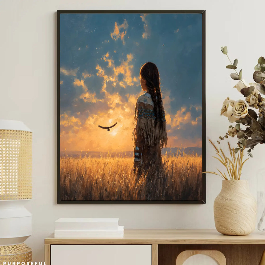 Native American Sunset Wall Art, Tribal Warrior and Eagle Canvas Poster