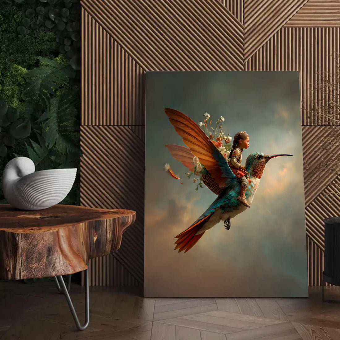 Fantasy Wall Art, Magical Child Riding Hummingbird with Flowers
