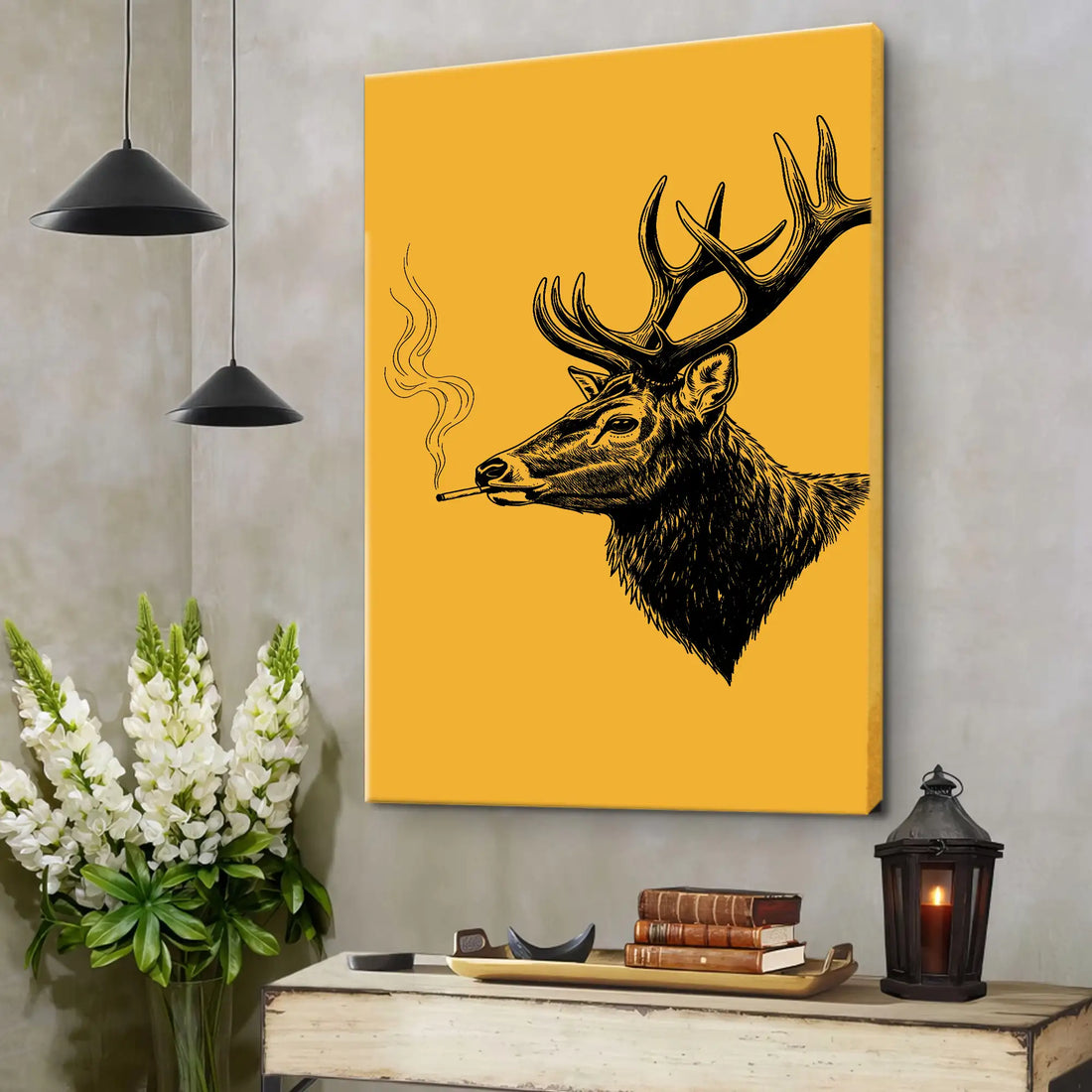 This striking wall art showcases a detailed illustration of a stag holding a cigarette, a...
