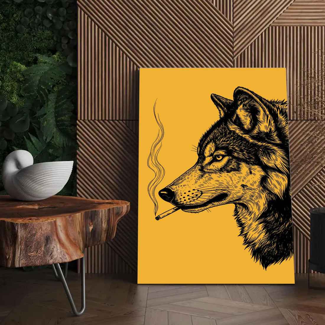 This bold wall art portrays a wolf sketched in fine detail, holding a cigarette with...