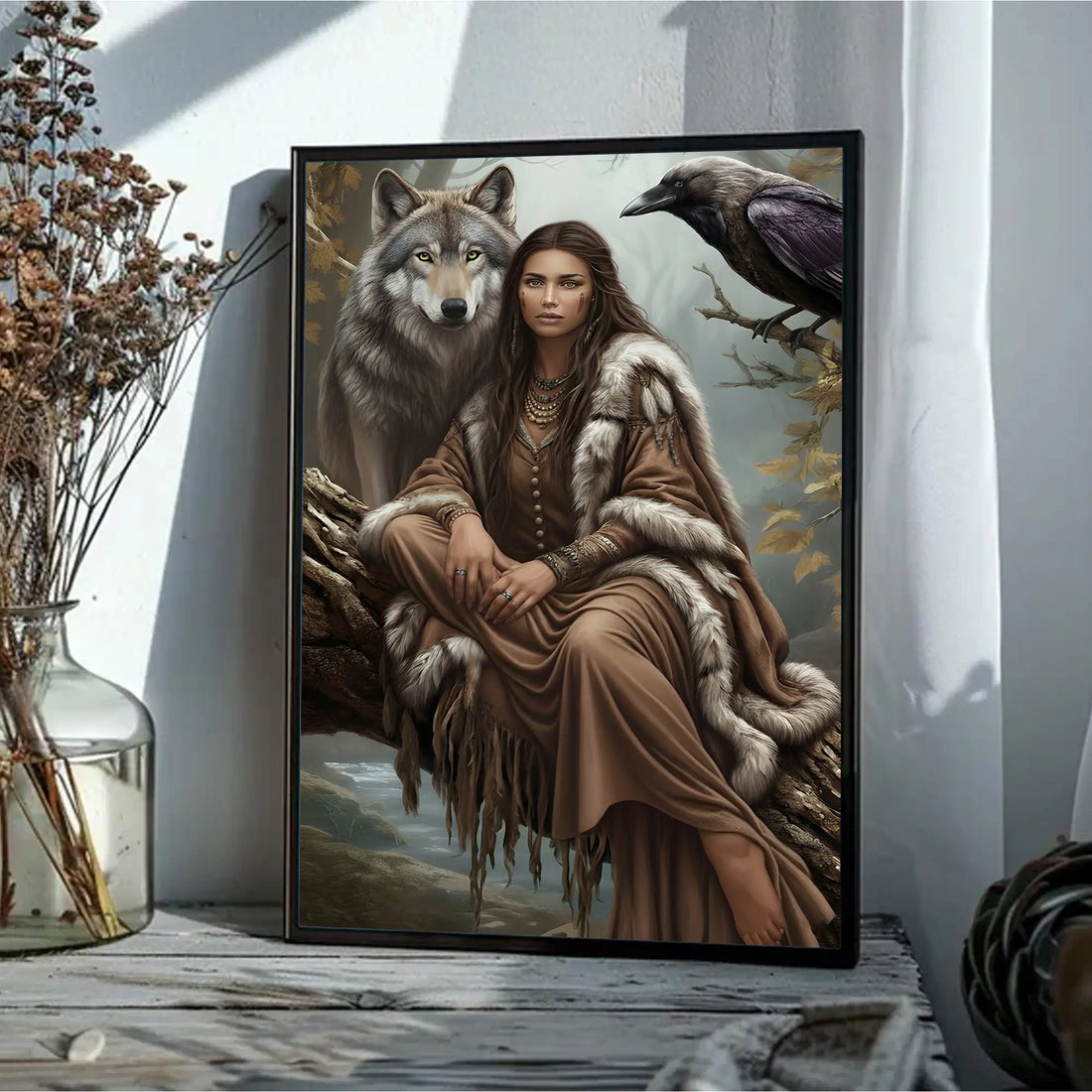 Native American Wall Art, Woman with Wolf and Raven, Spiritual Canvas Decor