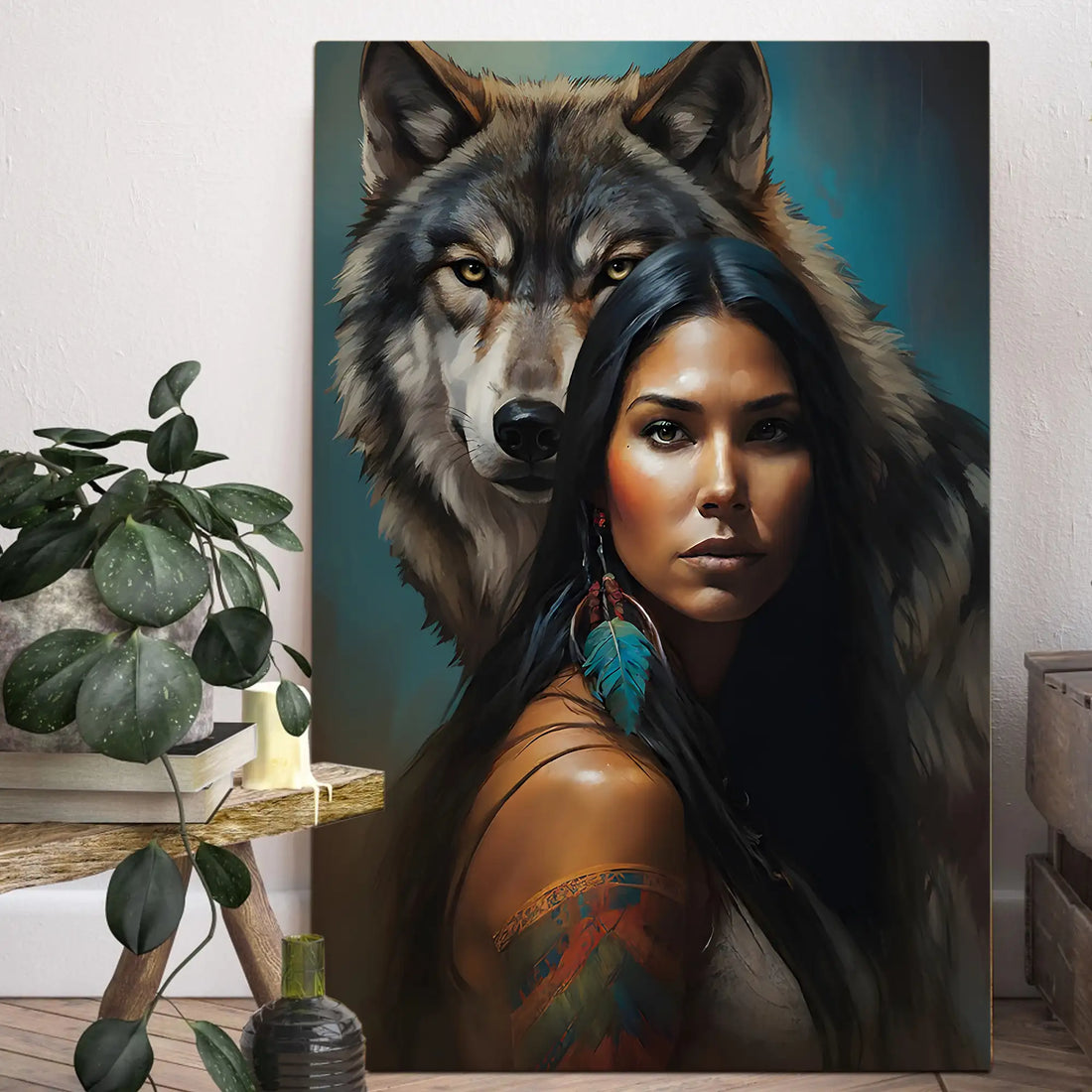 Woman with Wolf Spirit, Tribal Feather Canvas Decor