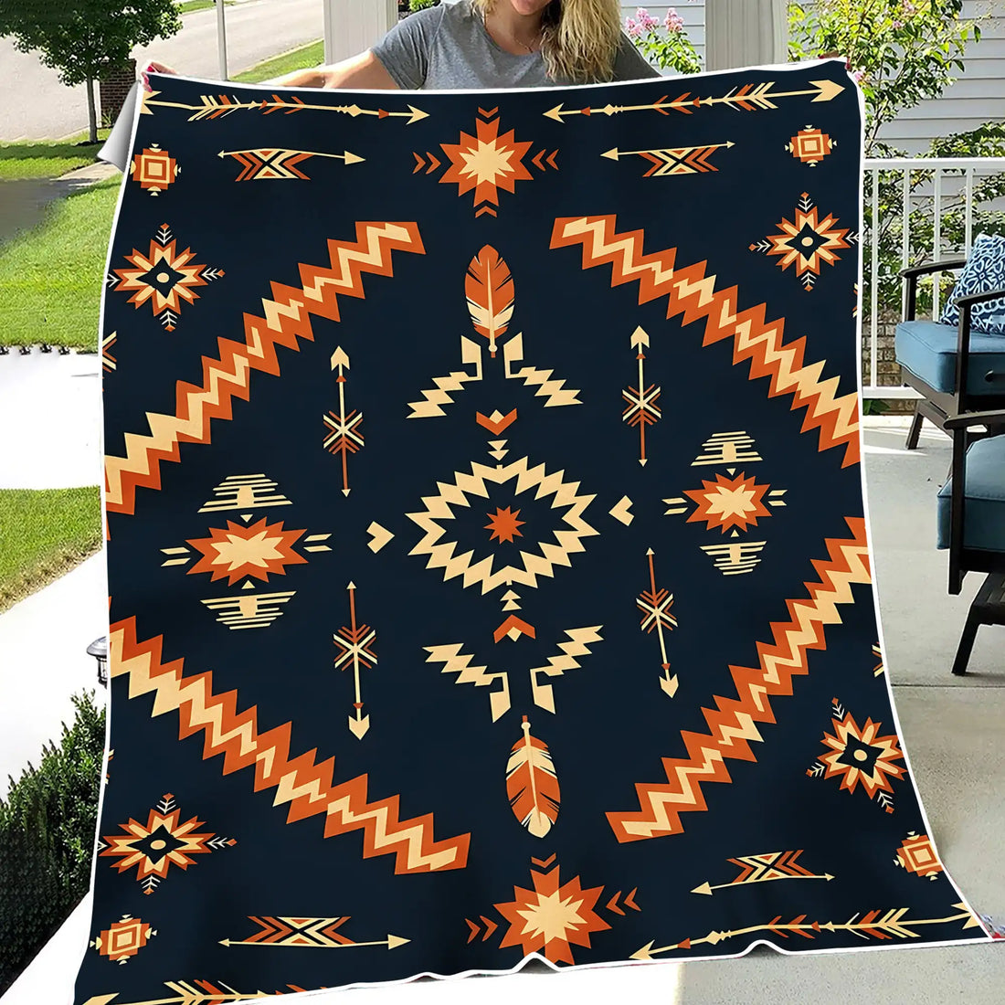 This blanket features a bold Native America design with striking arrows, feathers, and geometric star...