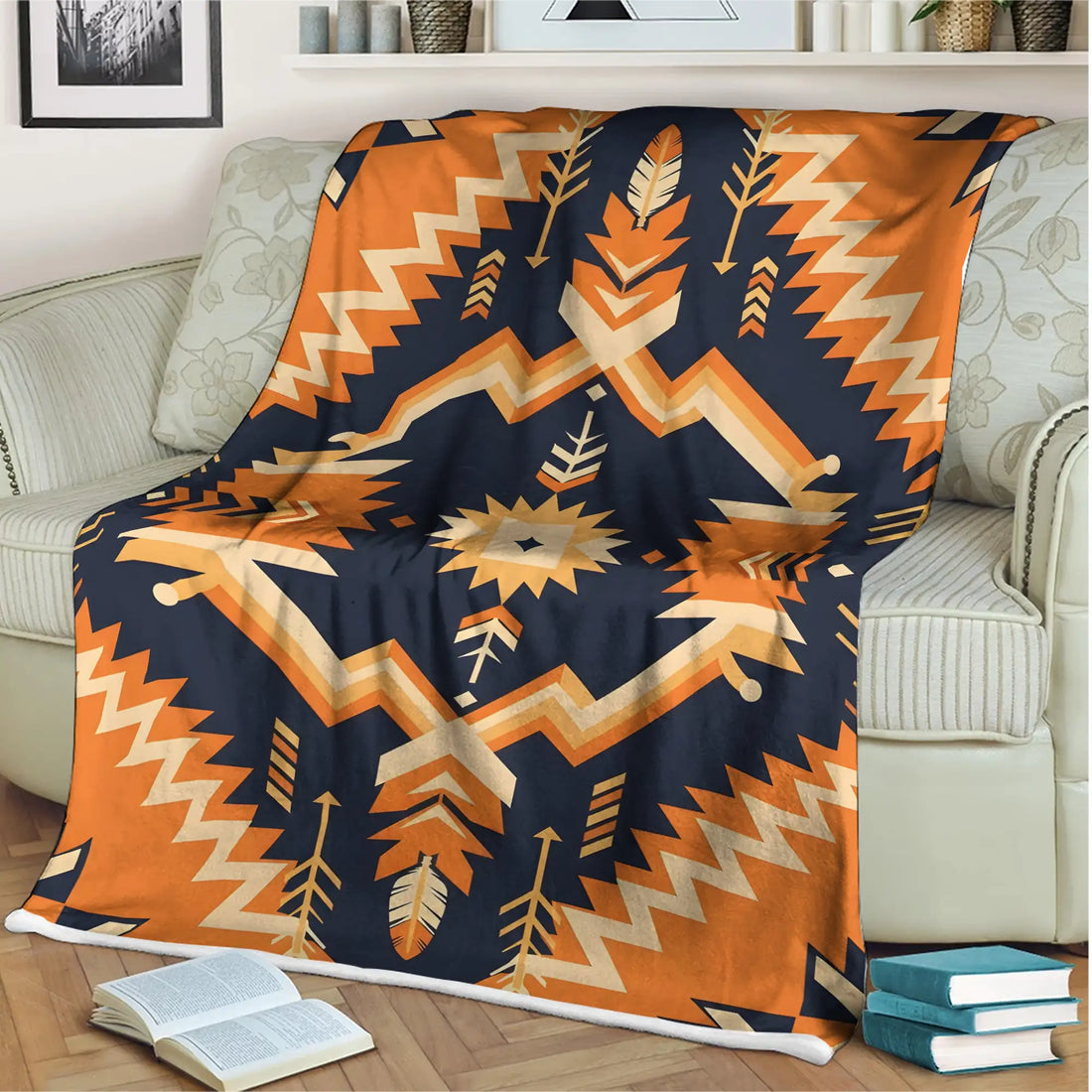 This fleece blanket showcases a striking Native America geometric tribal pattern in bold orange, navy,...