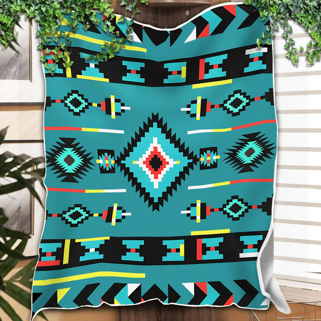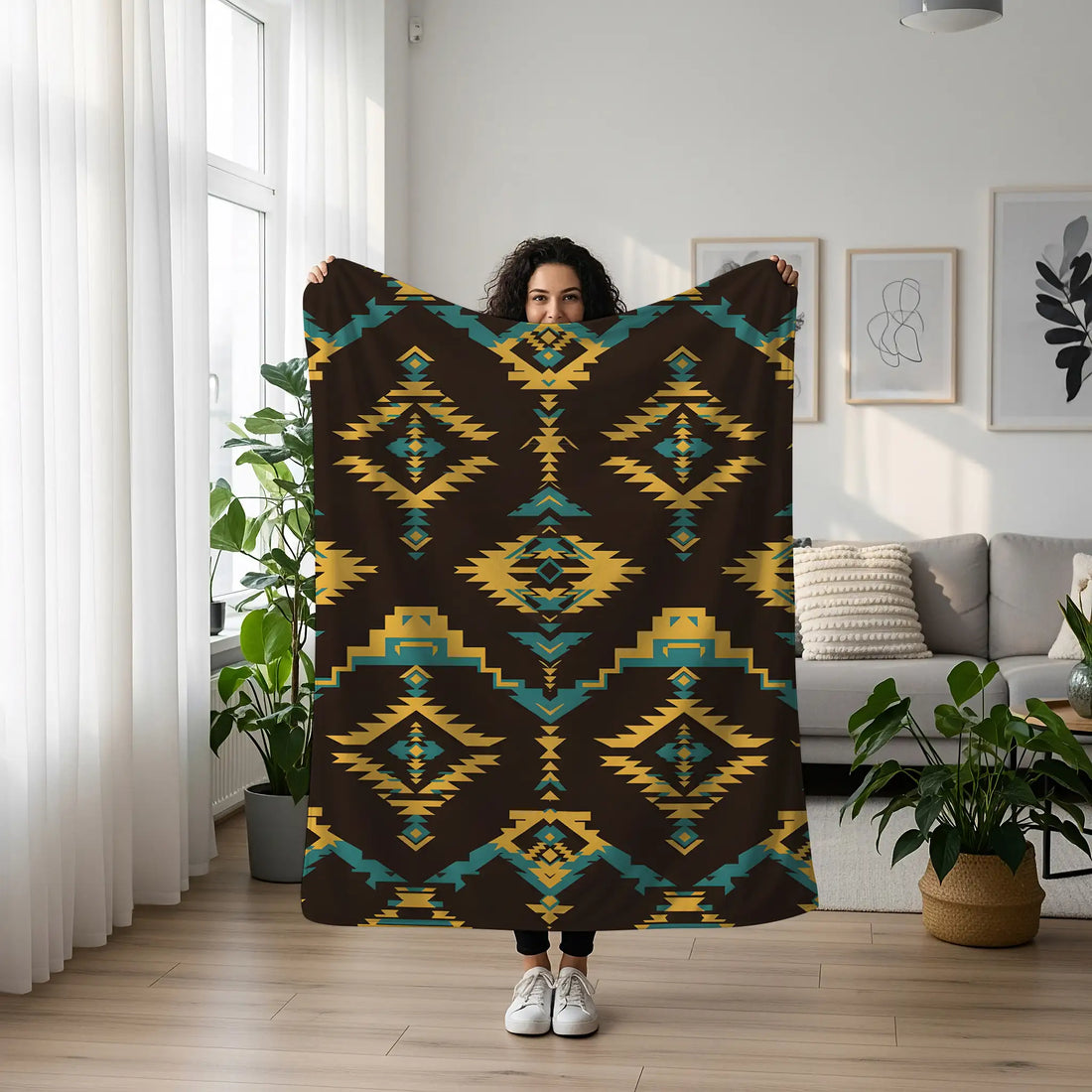 This blanket showcases a bold tribal geometric pattern inspired by Native America heritage, featuring striking...