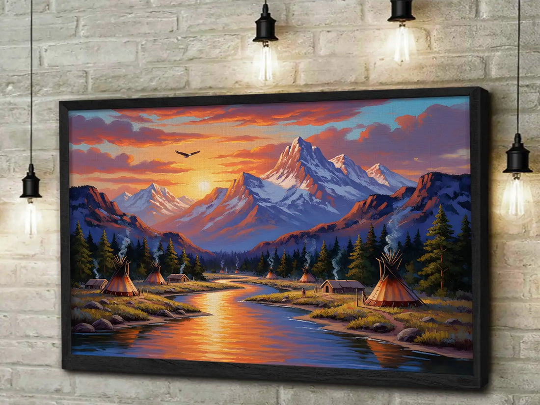 Native American Mountain Sunset Canvas Wall Art, Majestic Peaks Landscape