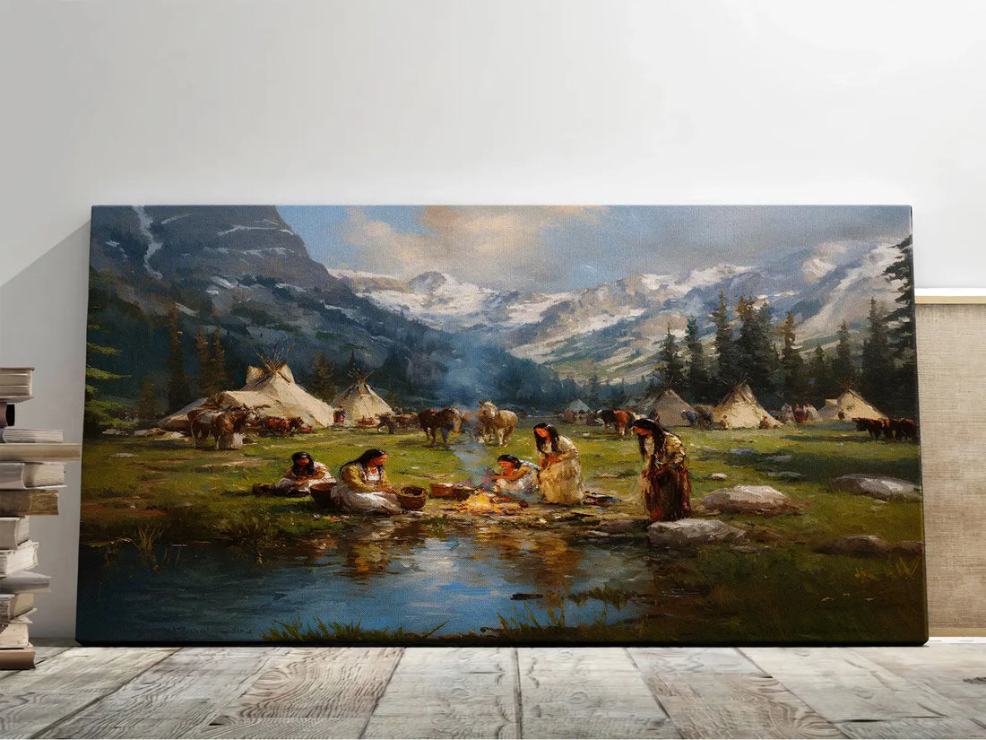 Native American Village Wall Art, Tribal Life Canvas Poster, Mountain Camp Scene
