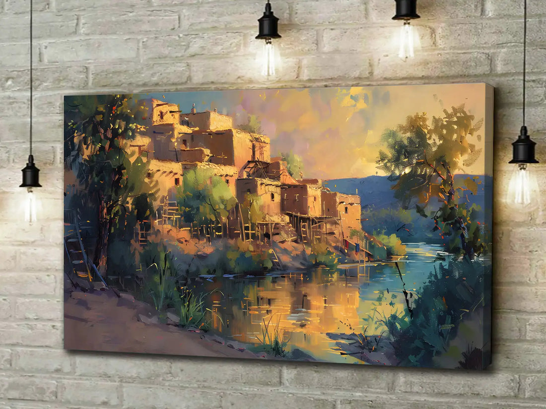 Pueblo Village by the River, Indigenous Canvas Wall Art