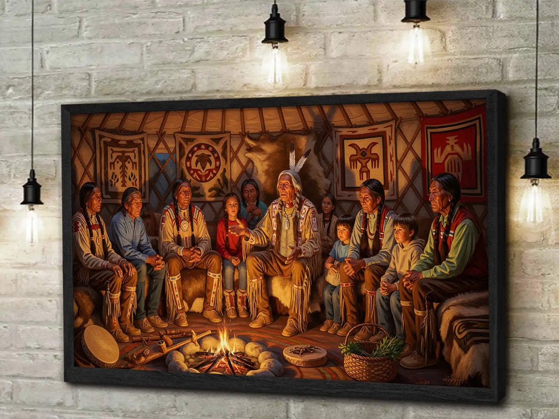 Native American Family Campfire Gathering, Indigenous Canvas Wall Art