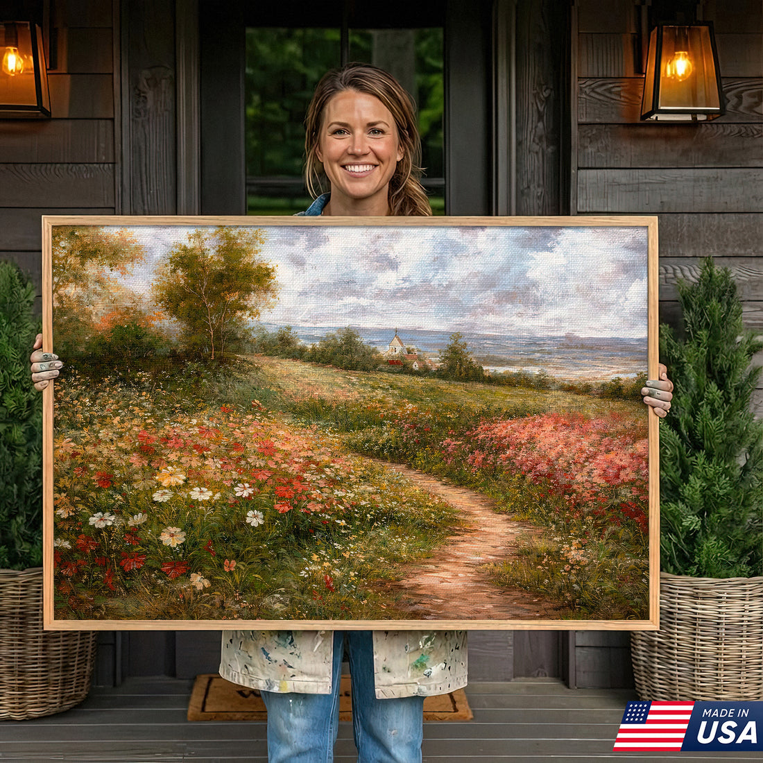 Country Path Floral Landscape Framed Canvas β Quiet Countryside Scene