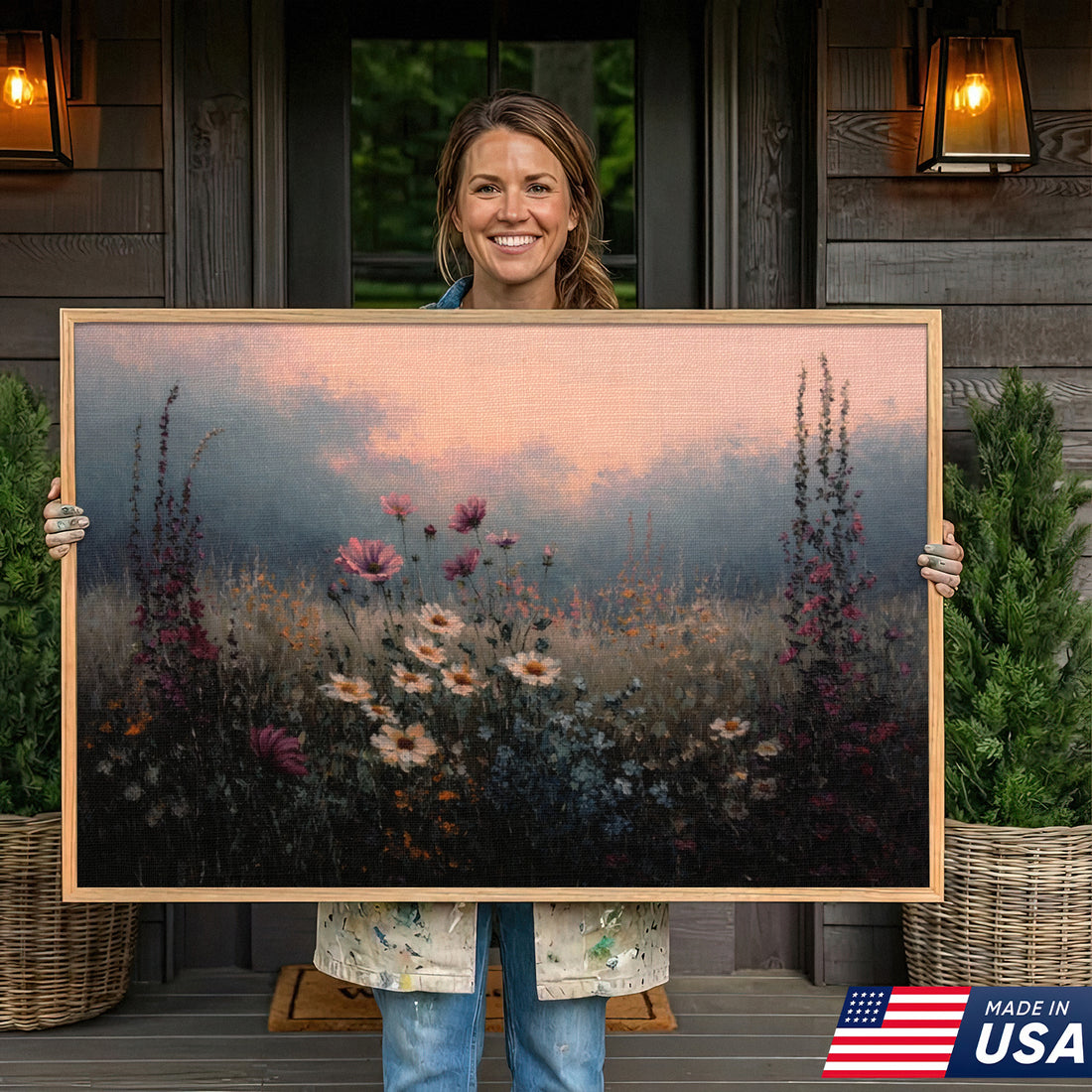 Golden Hour Wild Meadow Framed Canvas β Soft Sunset Landscape