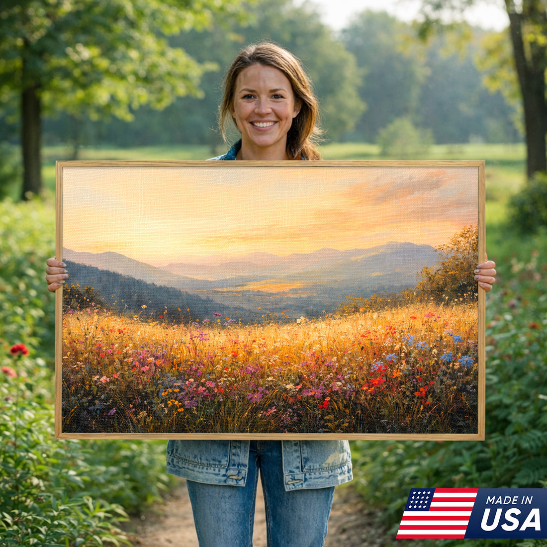 Sunlit Valley Floral Landscape Framed Canvas β Pastoral Bloom