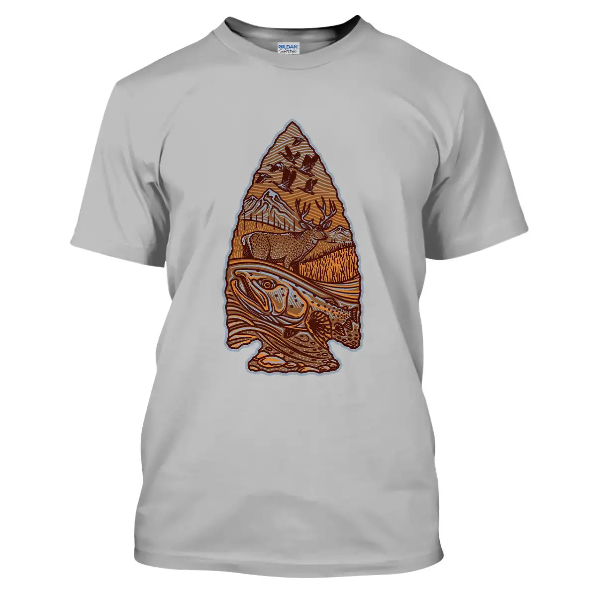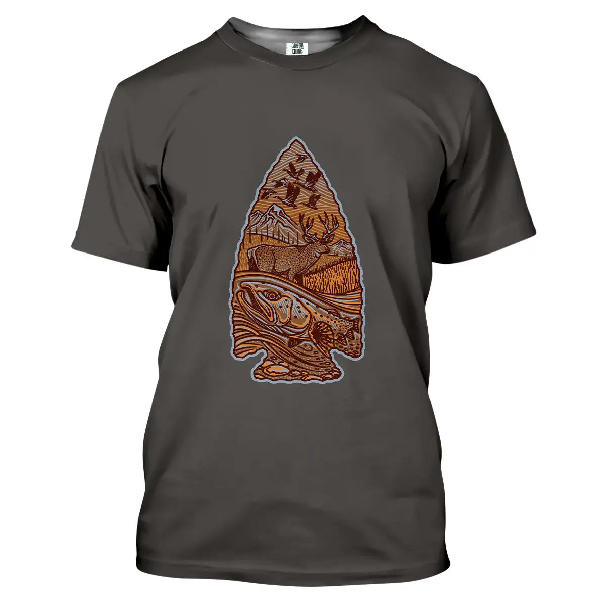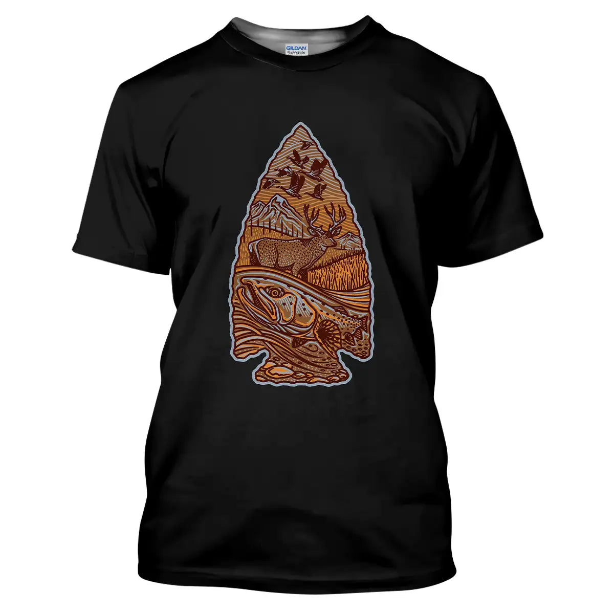 Arrowhead landscape tee with elk and trout, rugged everyday comfort.