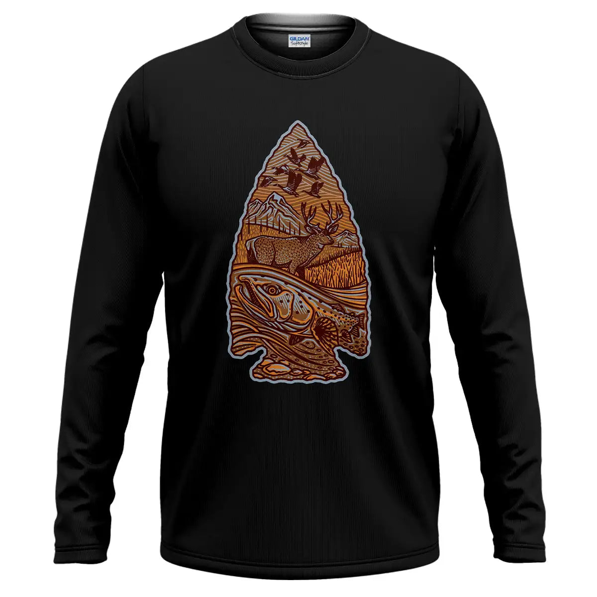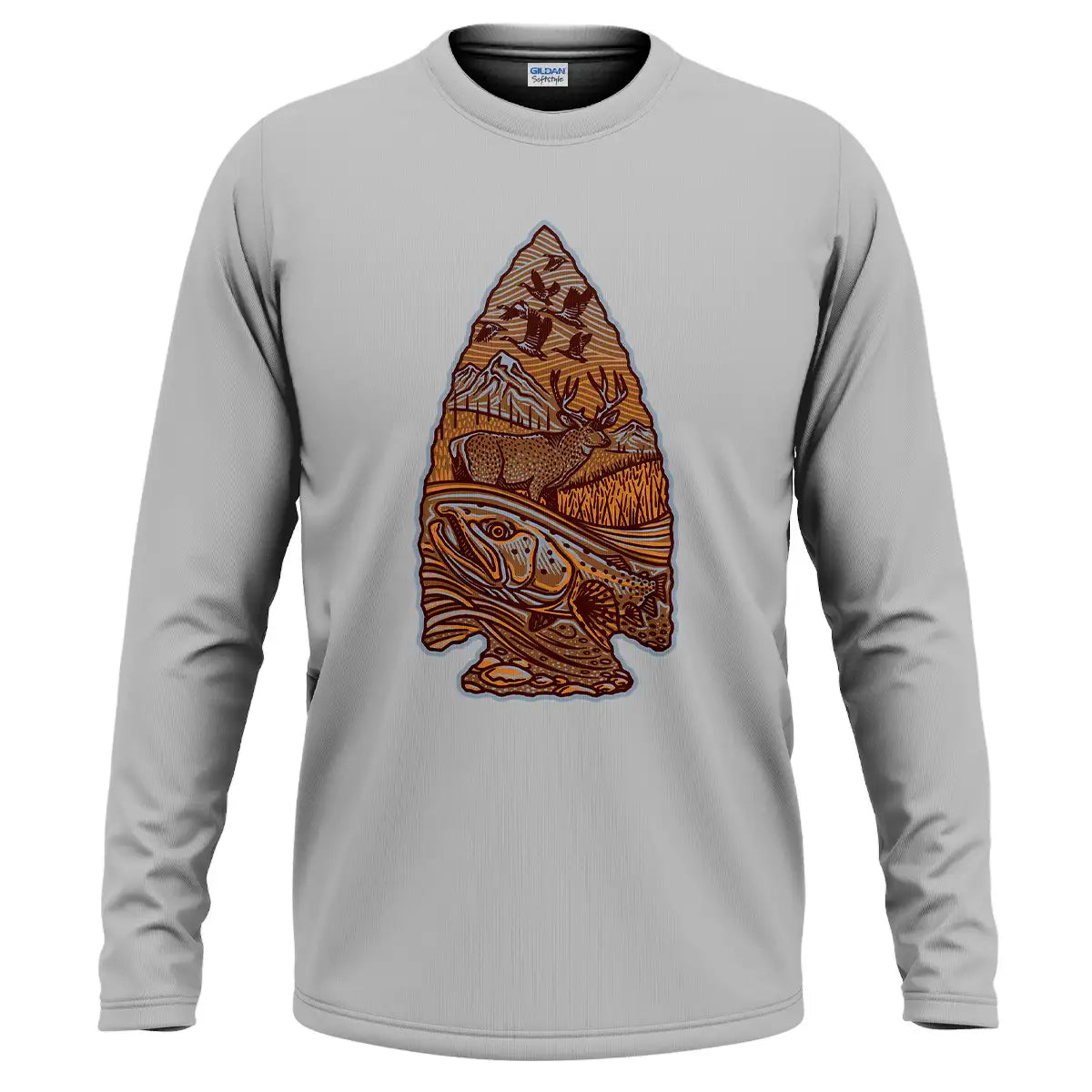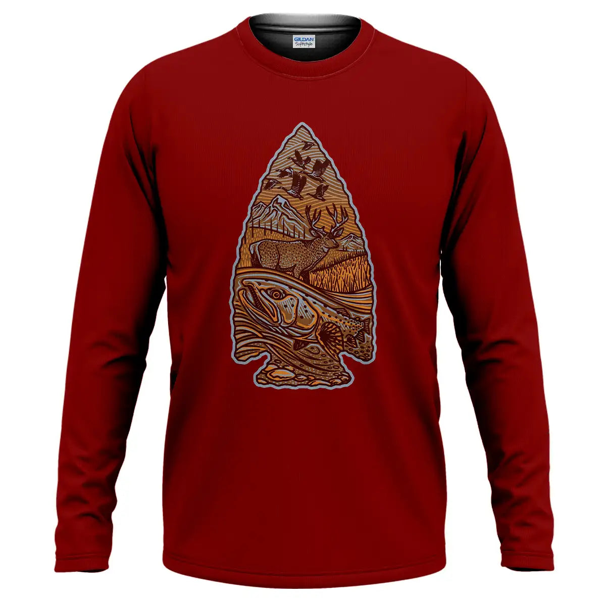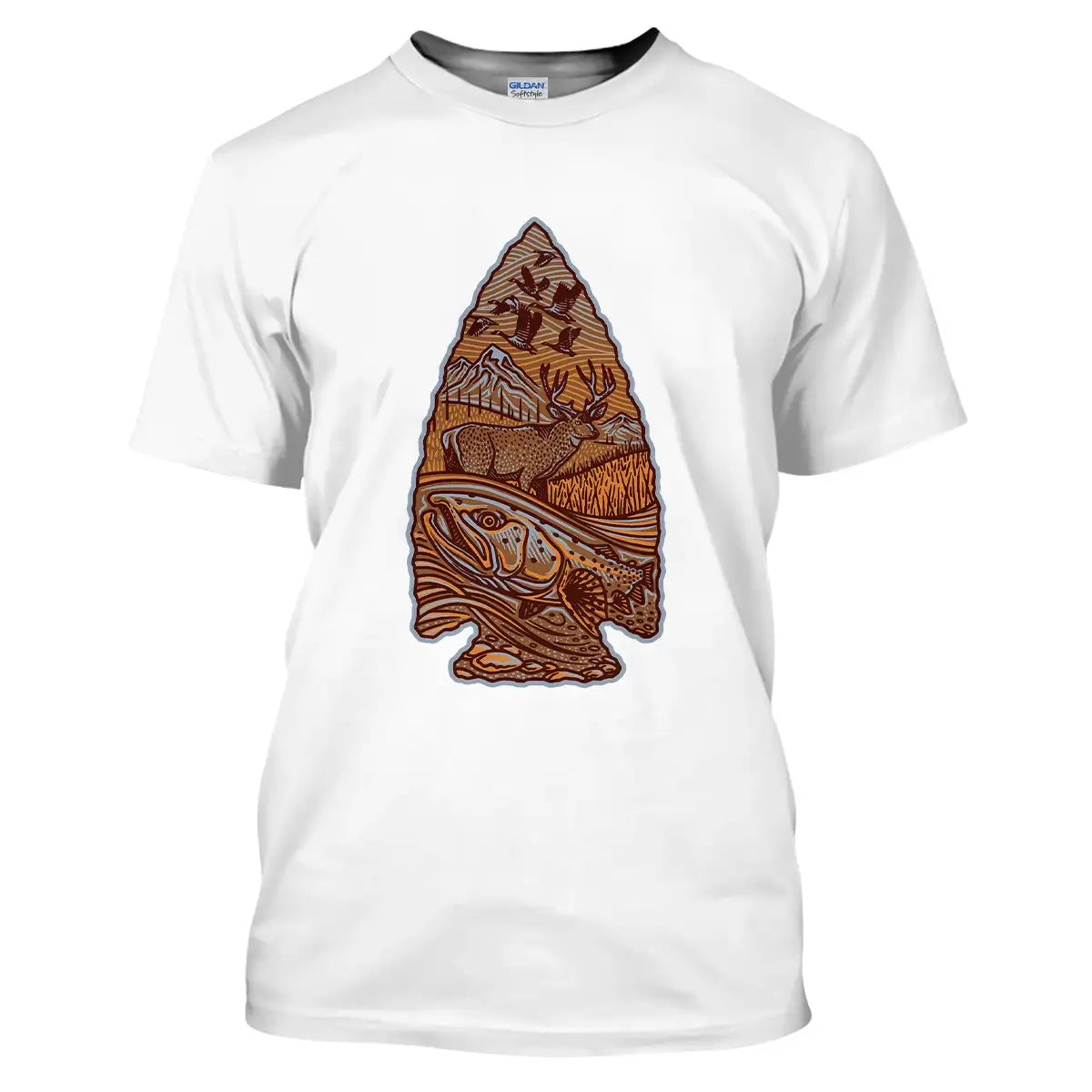 Along the Rockies and Plateau homelands of the Blackfoot and Nez Perce, the arrowhead marks protection, skill, and gratitude for the hunt. This design frames a high ridge with elk, circling birds, and a river trout within one flint outline, honoring how land and water feed family. Made for real life, the fabric feels soft and breathable, the fit runs true, and the print keeps detail after many washes so you stop tugging, itching, and worrying over fade. Wear it for campfires, trail days, or weekends in town. Carry a promise to take what you need and give thanks back.
