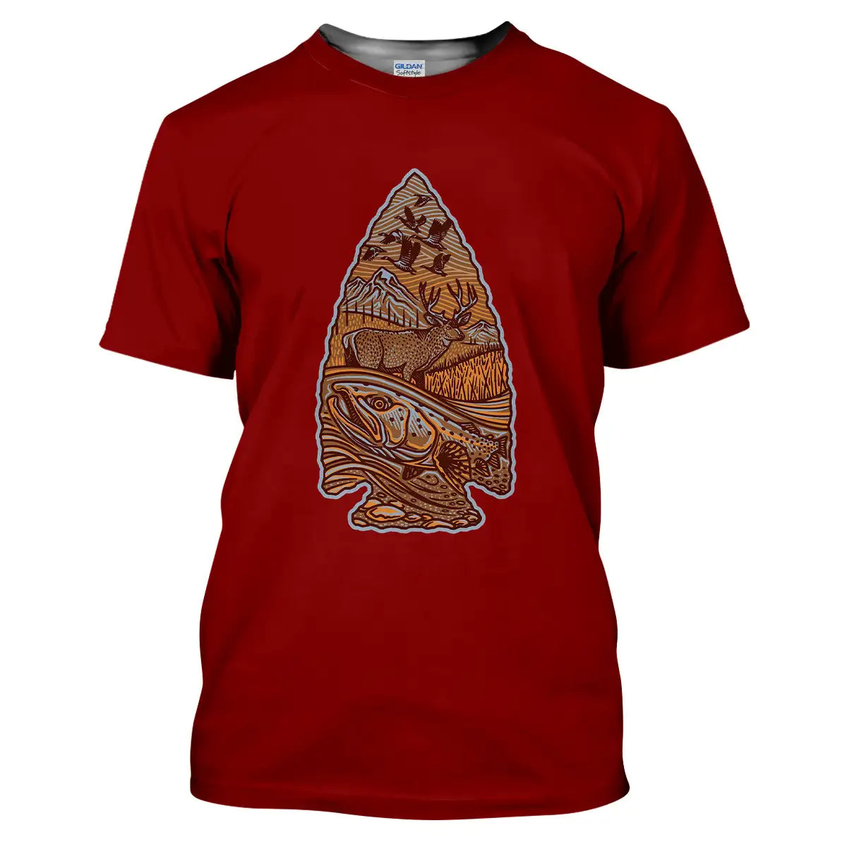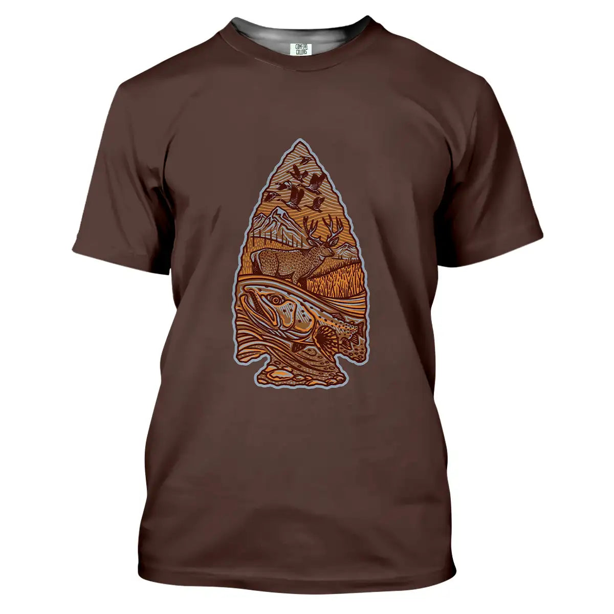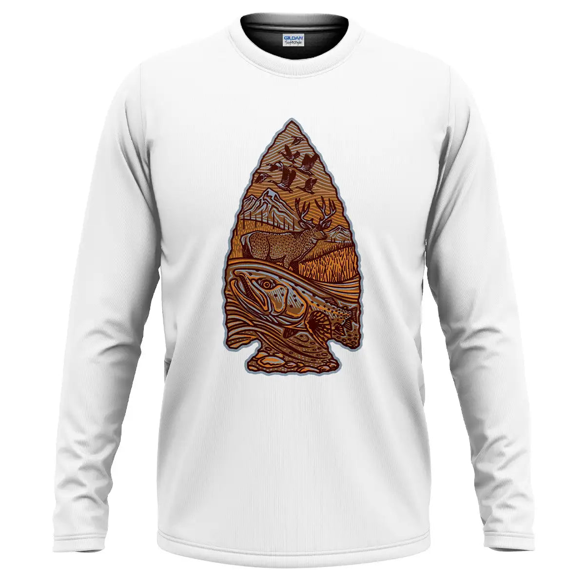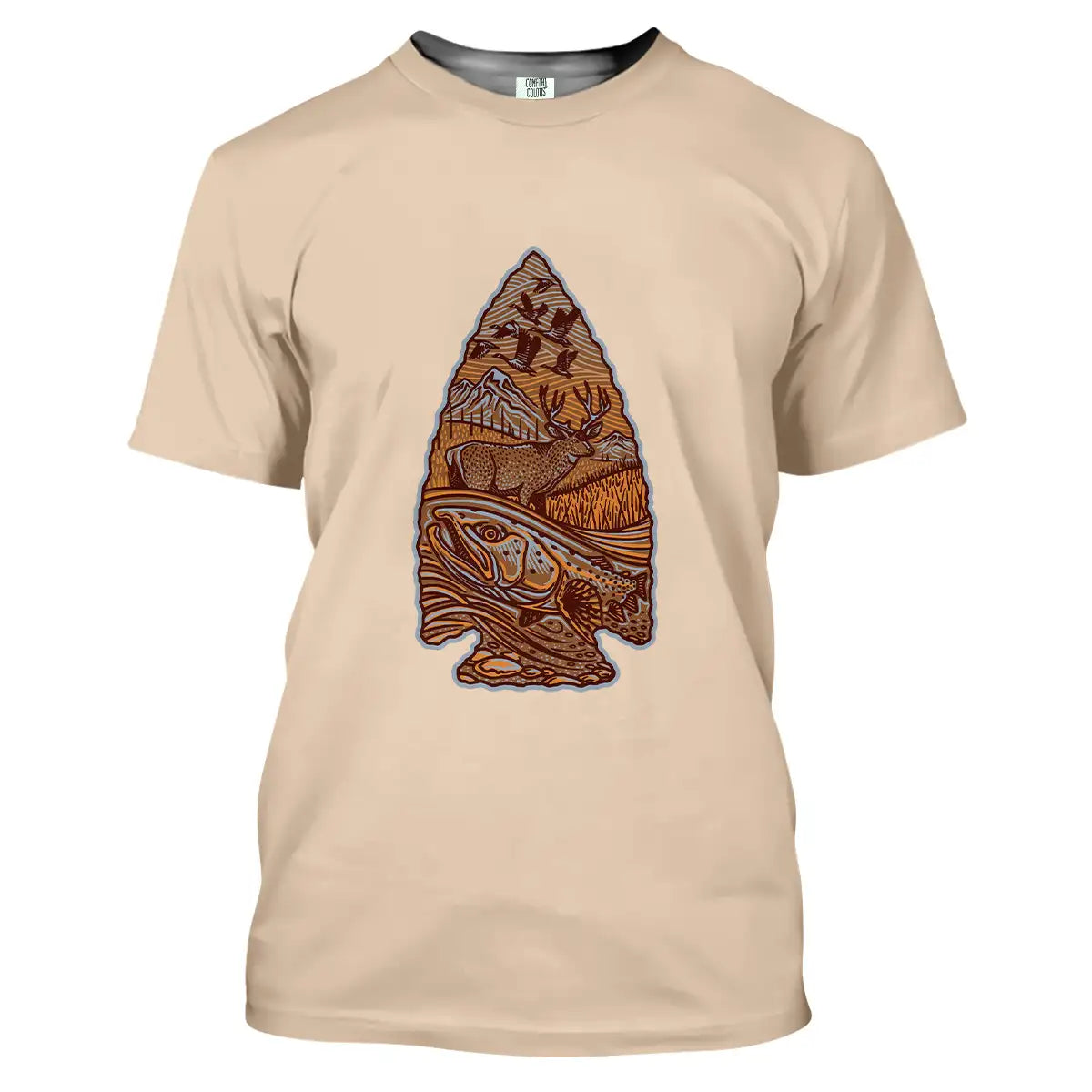 Along the Rockies and Plateau homelands of the Blackfoot and Nez Perce, the arrowhead marks protection, skill, and gratitude for the hunt. This design frames a high ridge with elk, circling birds, and a river trout within one flint outline, honoring how land and water feed family. Made for real life, the fabric feels soft and breathable, the fit runs true, and the print keeps detail after many washes so you stop tugging, itching, and worrying over fade. Wear it for campfires, trail days, or weekends in town. Carry a promise to take what you need and give thanks back.