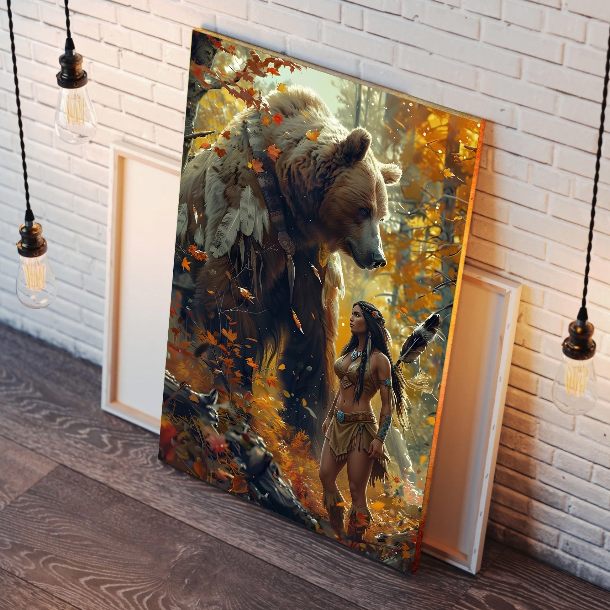 Autumn Forest Poster With Tribal Woman and Bear Spirit Native America Canvas