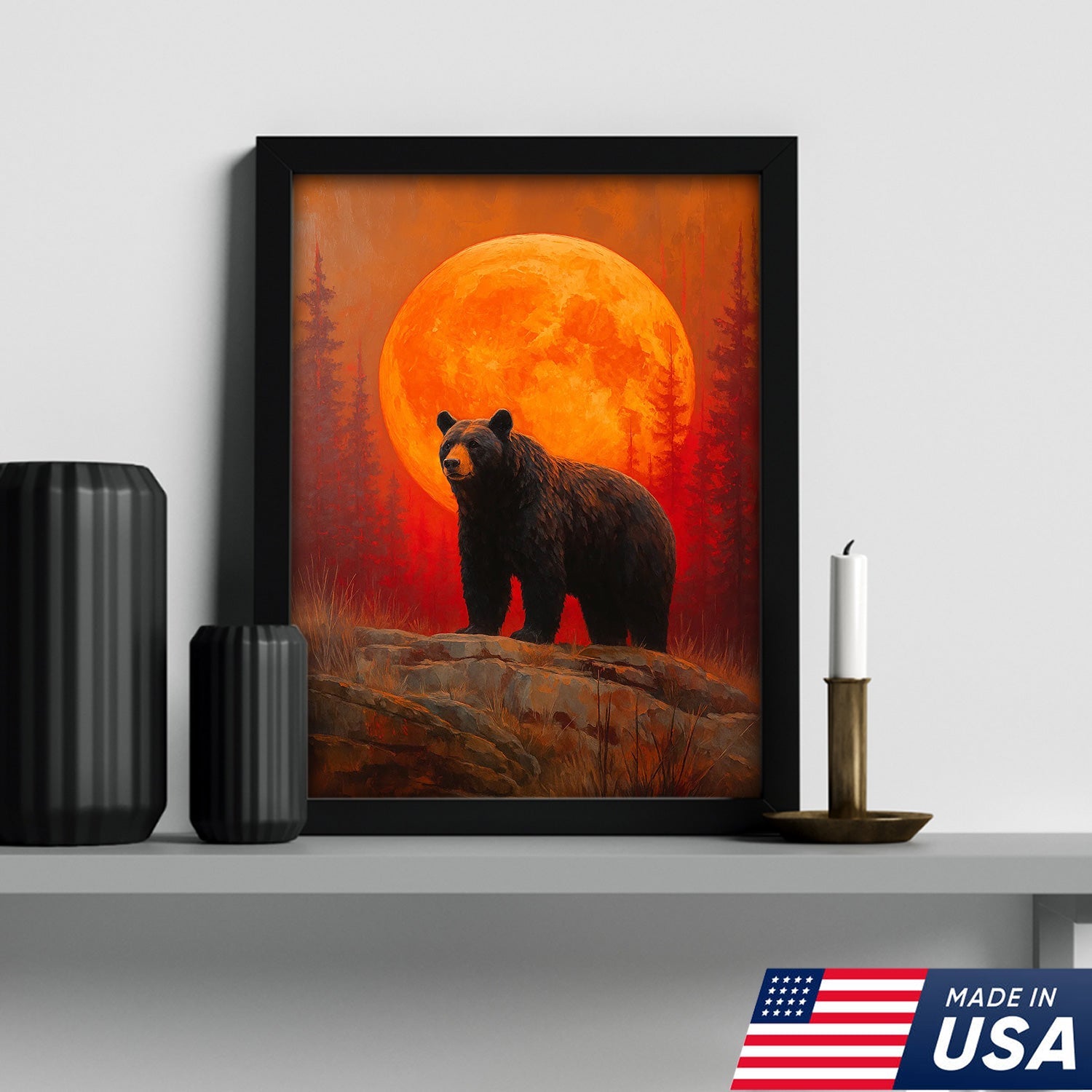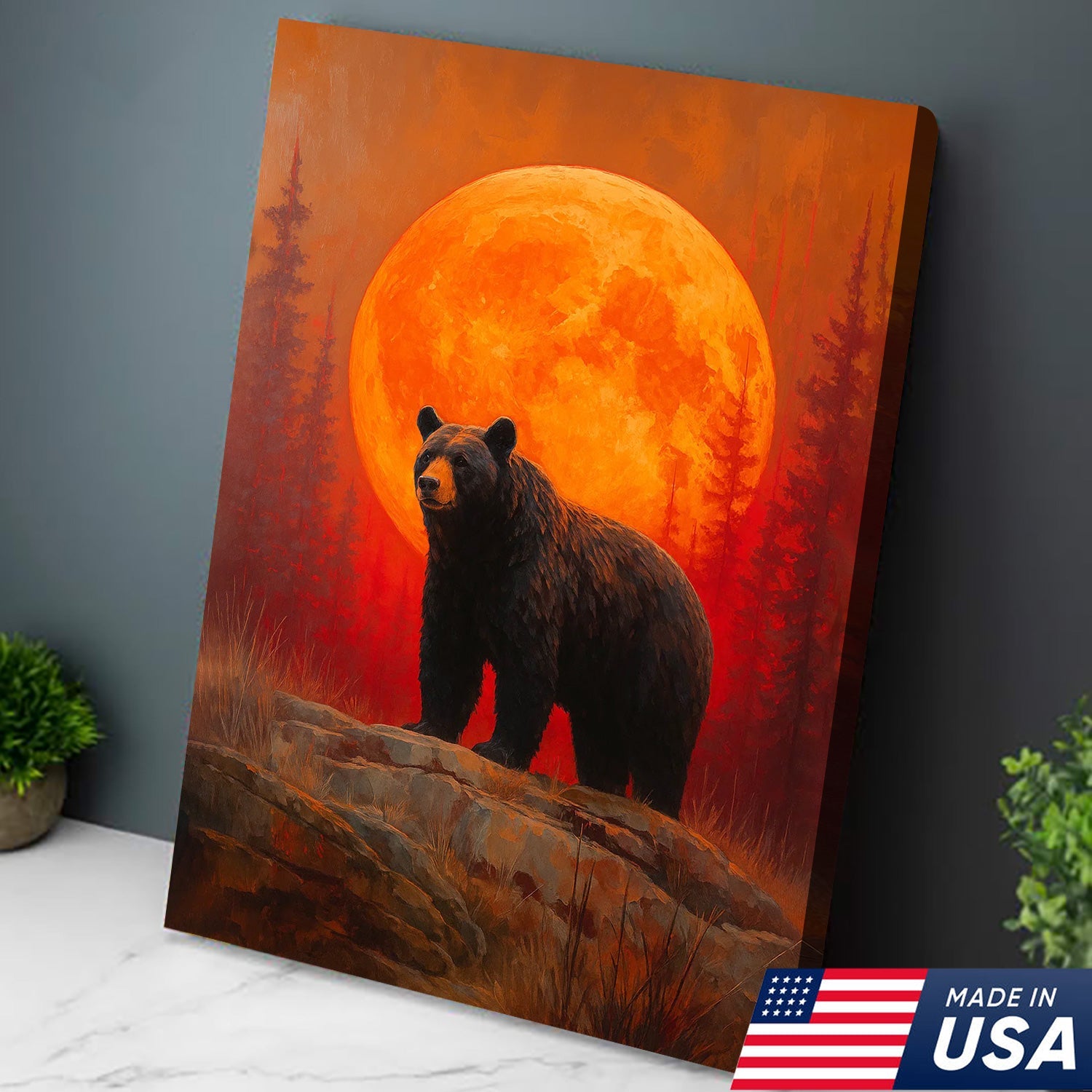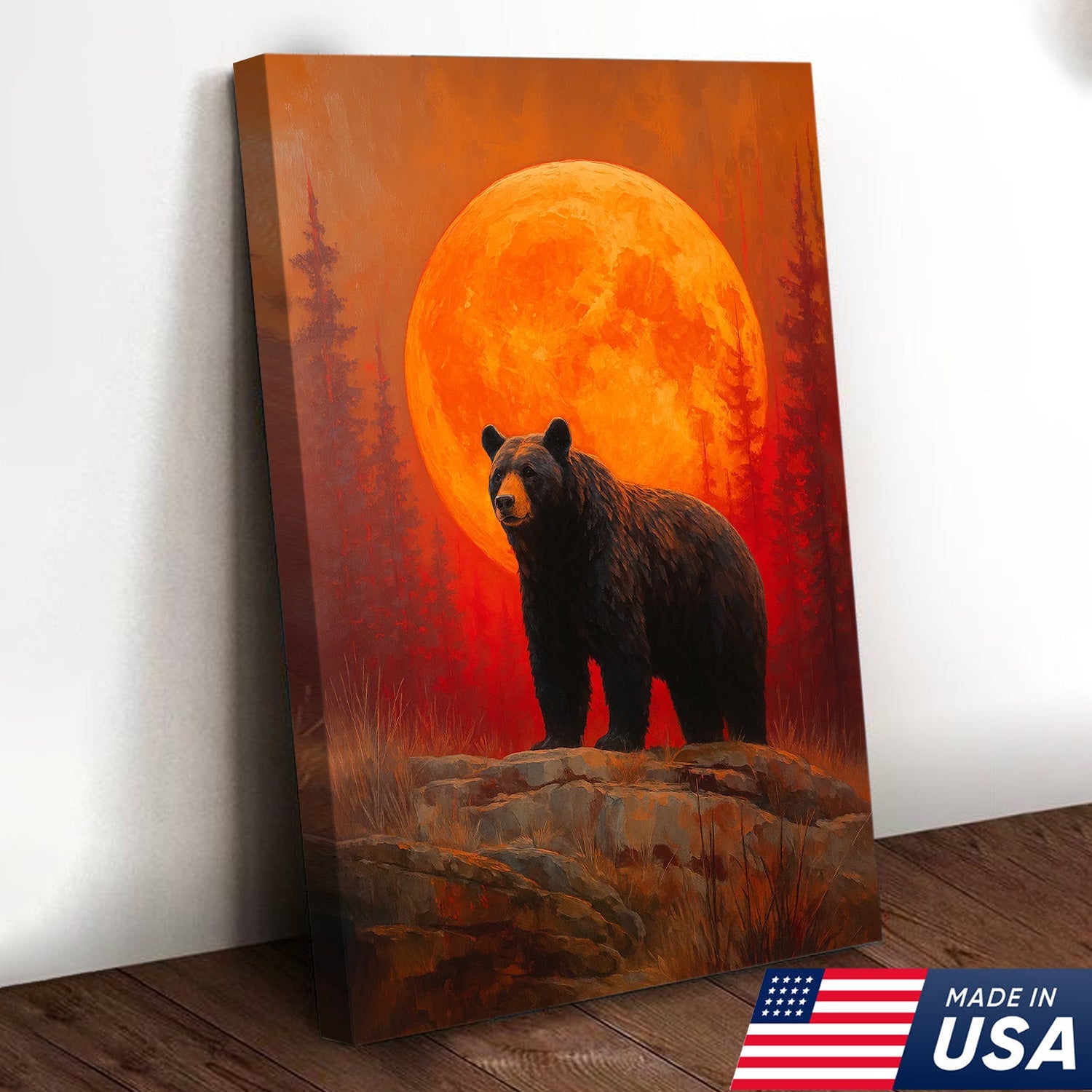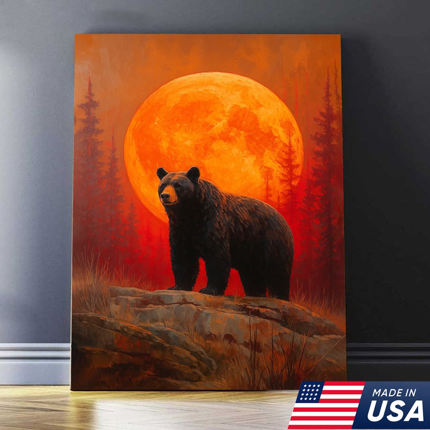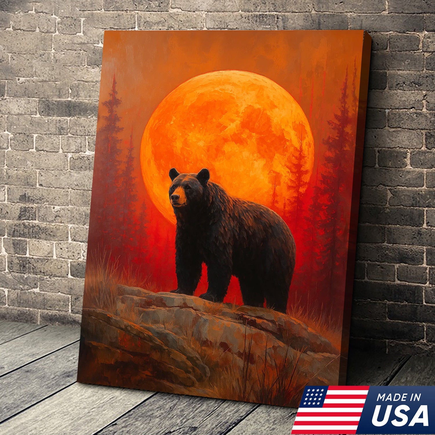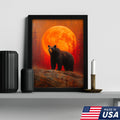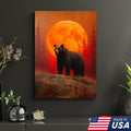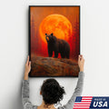 Bear Canvas Wall Art – Majestic Black Bear with Fiery Orange Full Moon – Rustic Wildlife Lodge & Cabin Decor