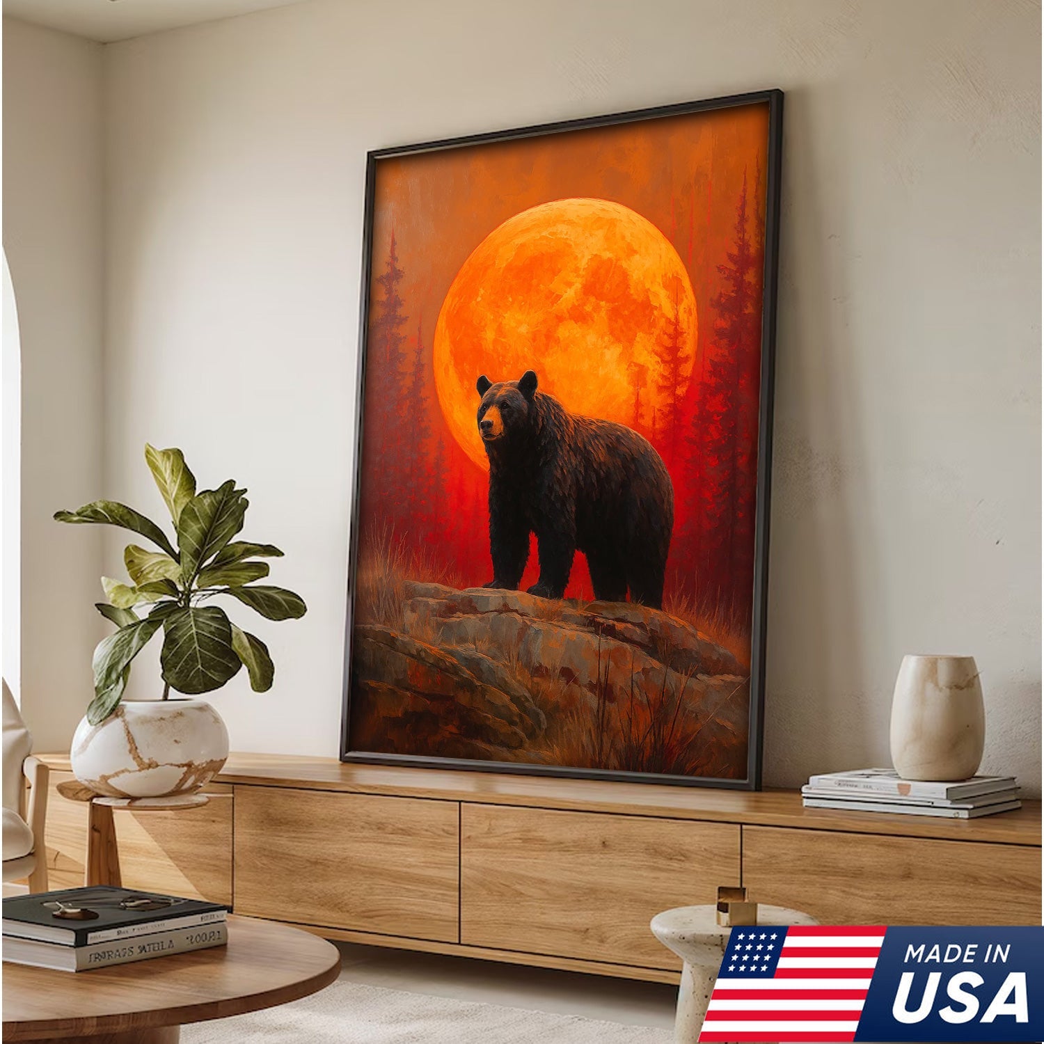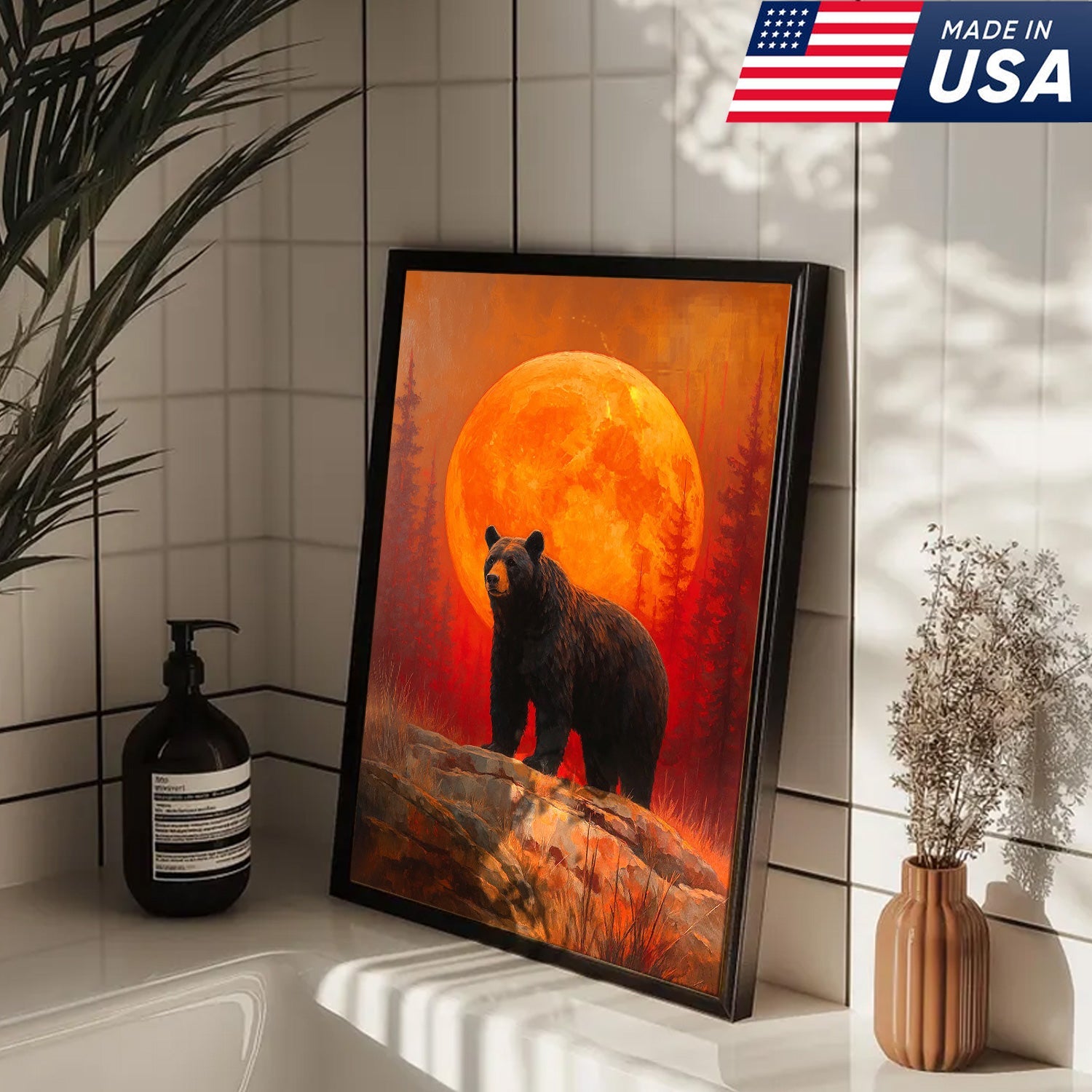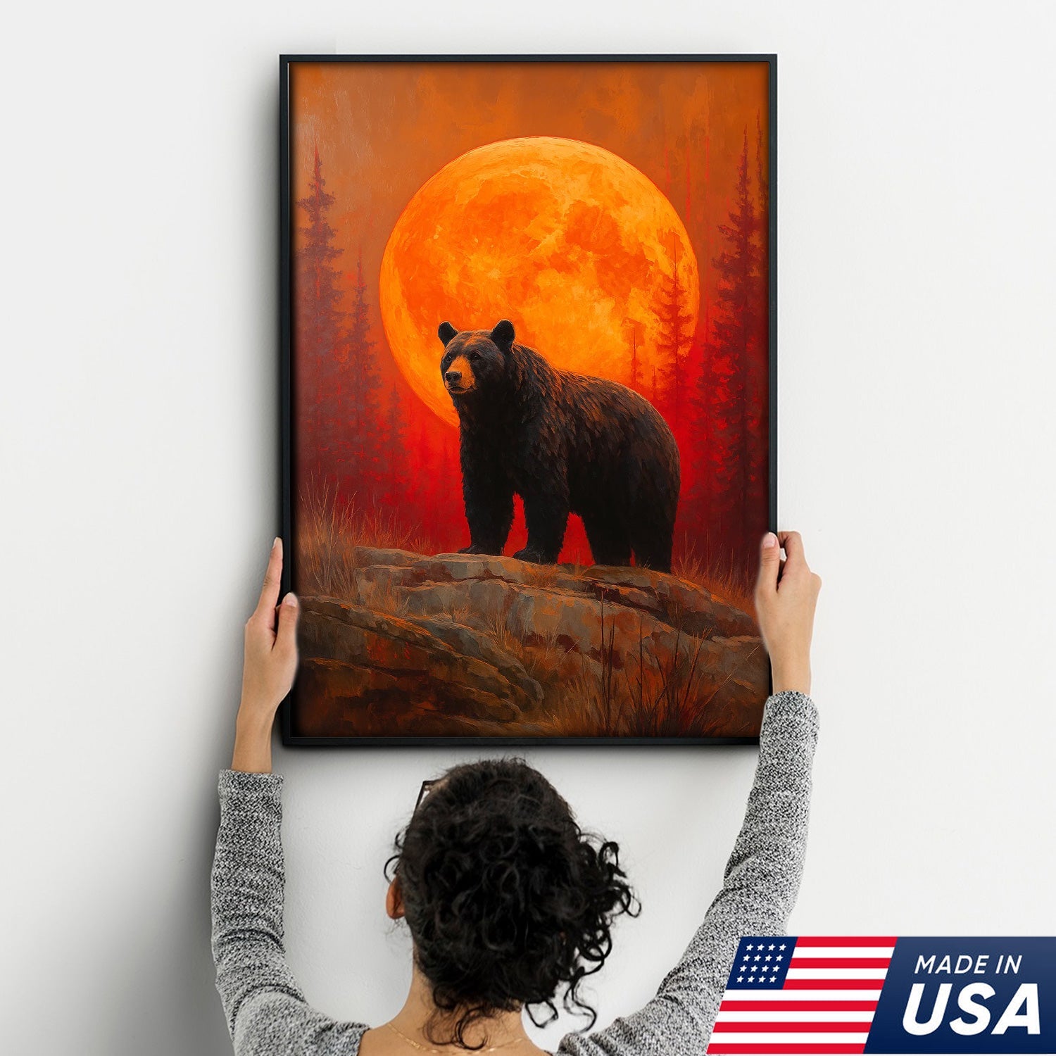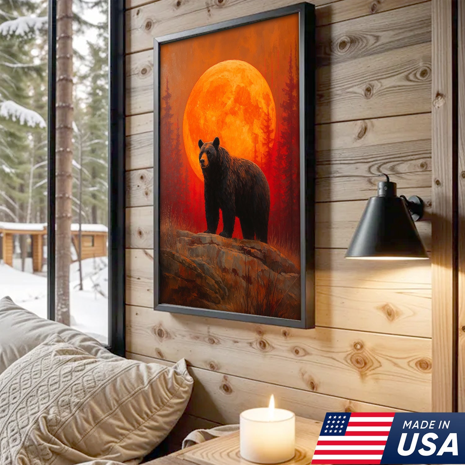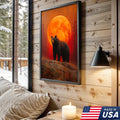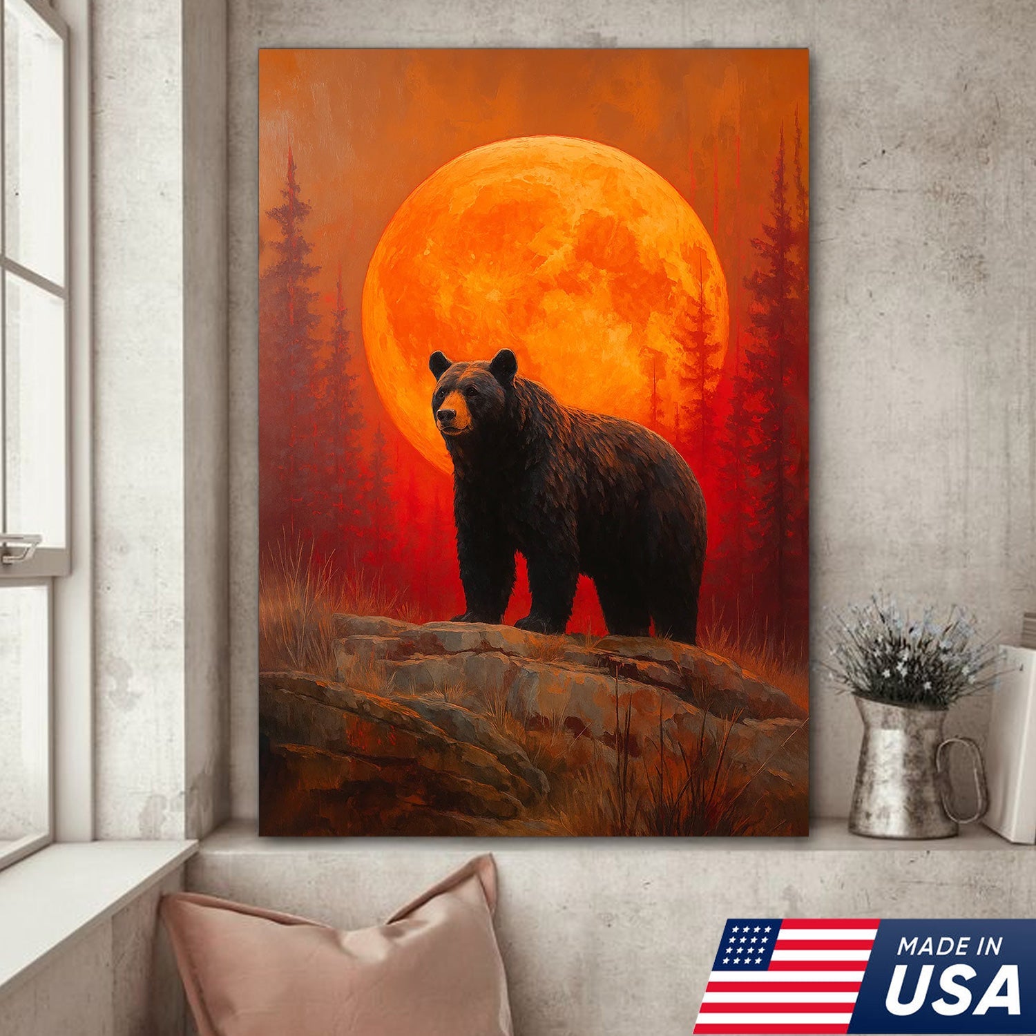 Bear Canvas Wall Art – Majestic Black Bear with Fiery Orange Full Moon – Rustic Wildlife Lodge & Cabin Decor