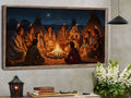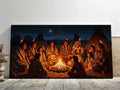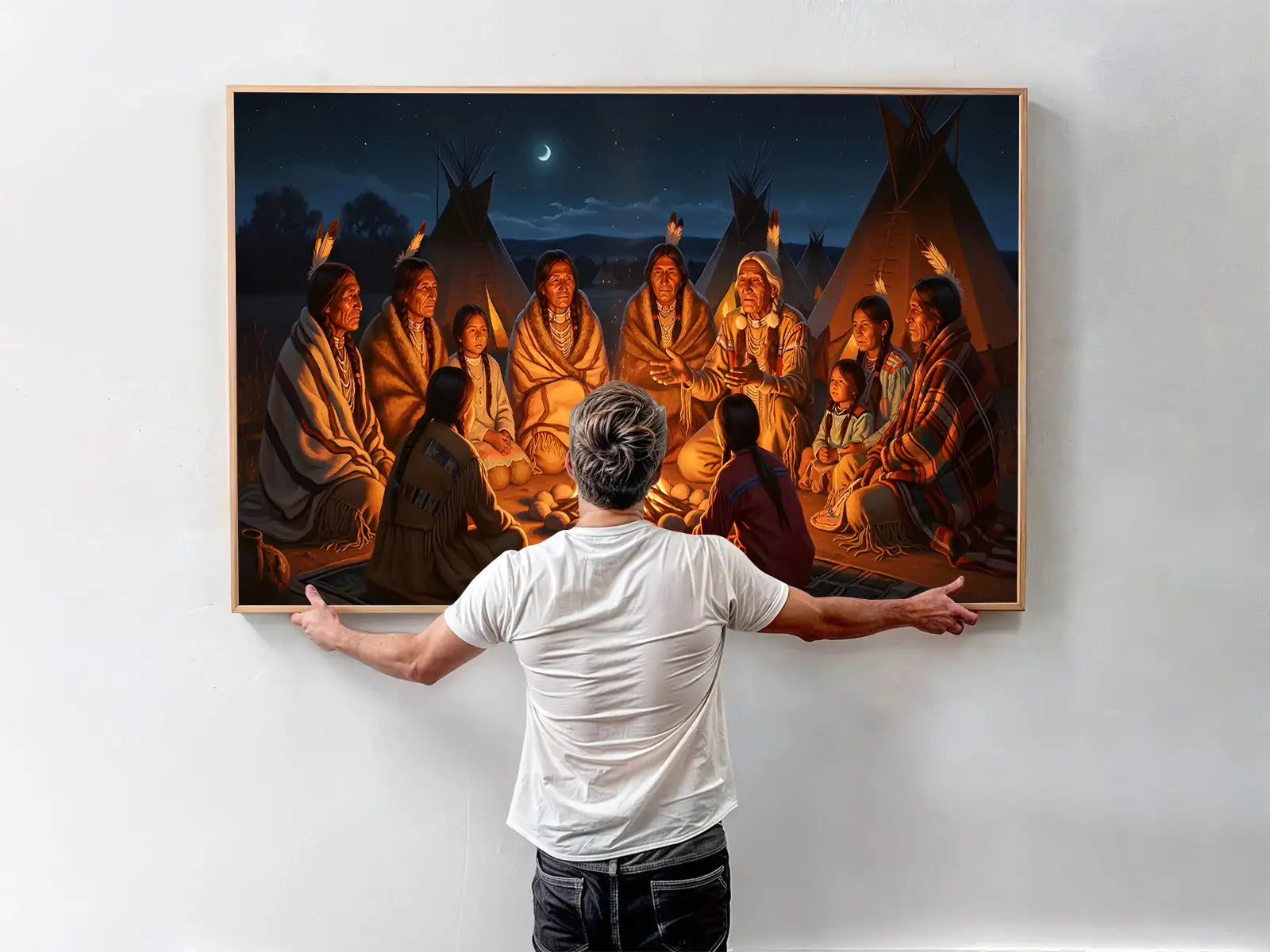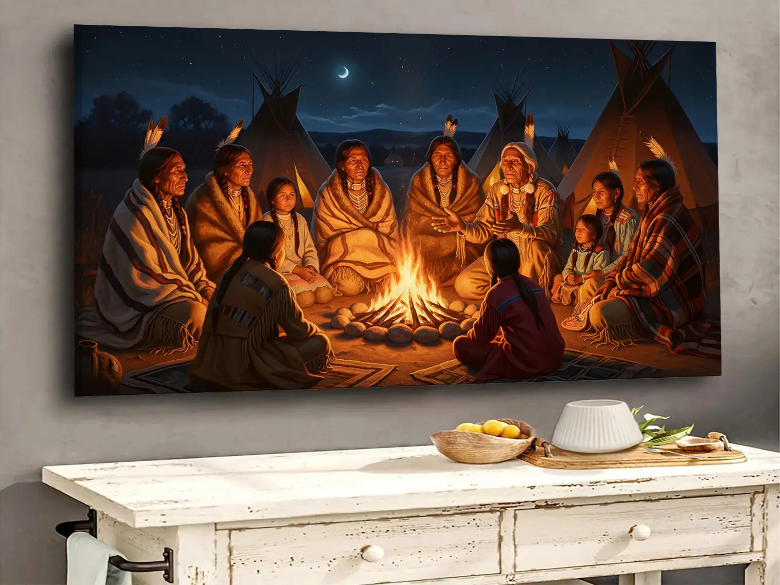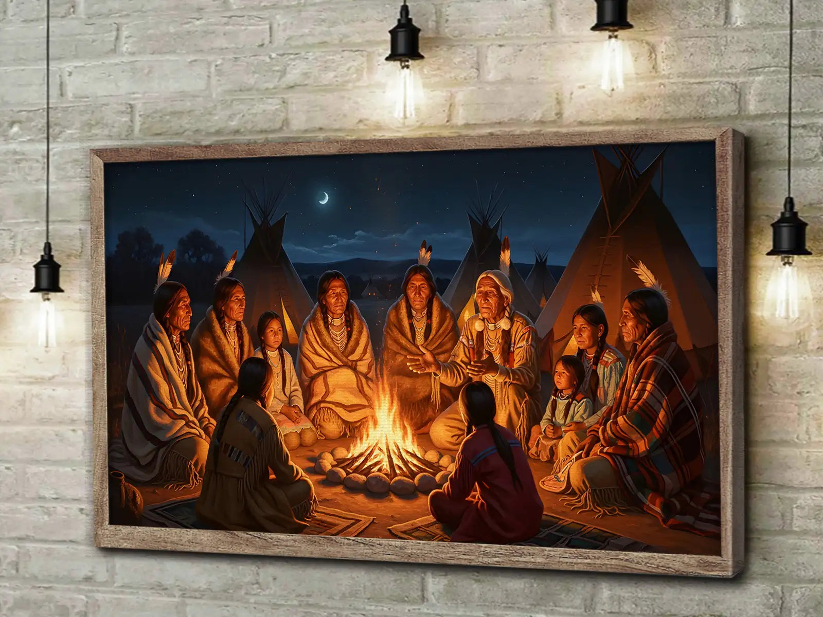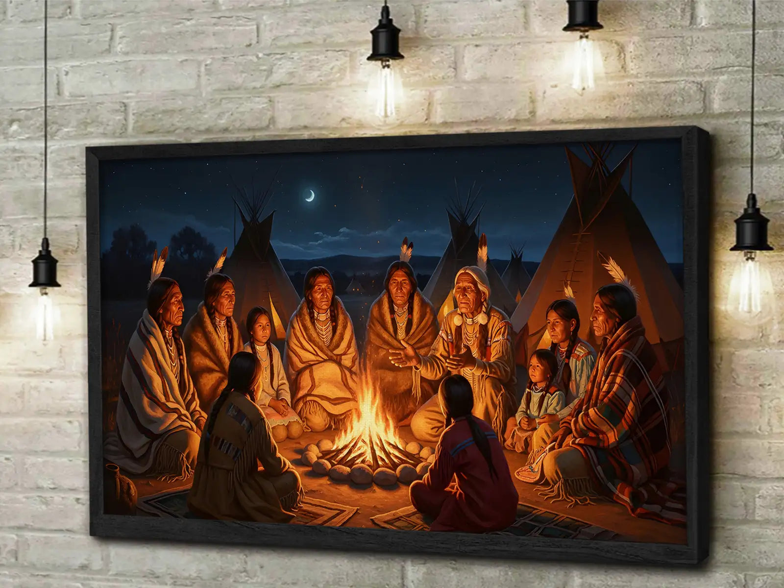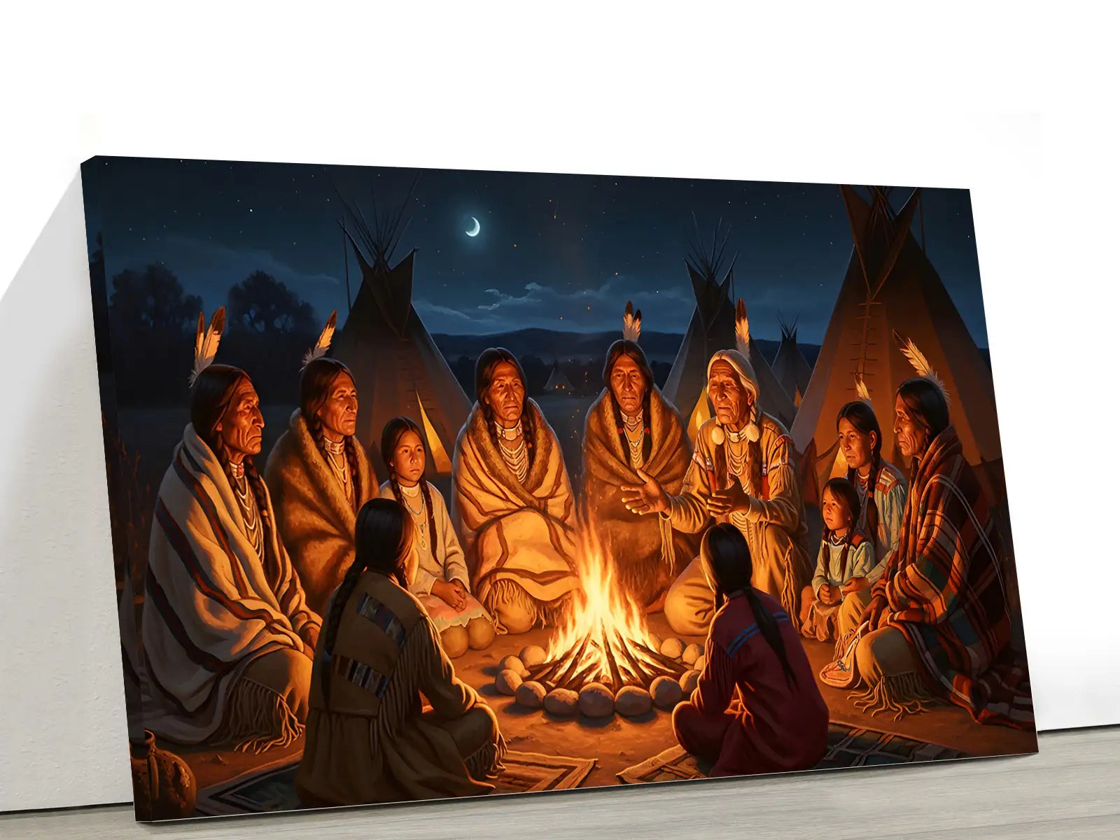 This Indigenous canvas wall art portrays a moving scene of a Native American family gathered around a warm campfire beneath the night sky. The glowing fire illuminates elders and children as stories are shared, symbolizing tradition, wisdom, and unity. The tepees in the background connect the artwork to tribal heritage and community life, while the crescent moon adds a sense of spiritual presence. Crafted with attention to detail, this canvas captures the spirit of storytelling and cultural preservation. Perfect for living rooms, studies, or as a meaningful gift, it brings history, strength, and beauty into your home.