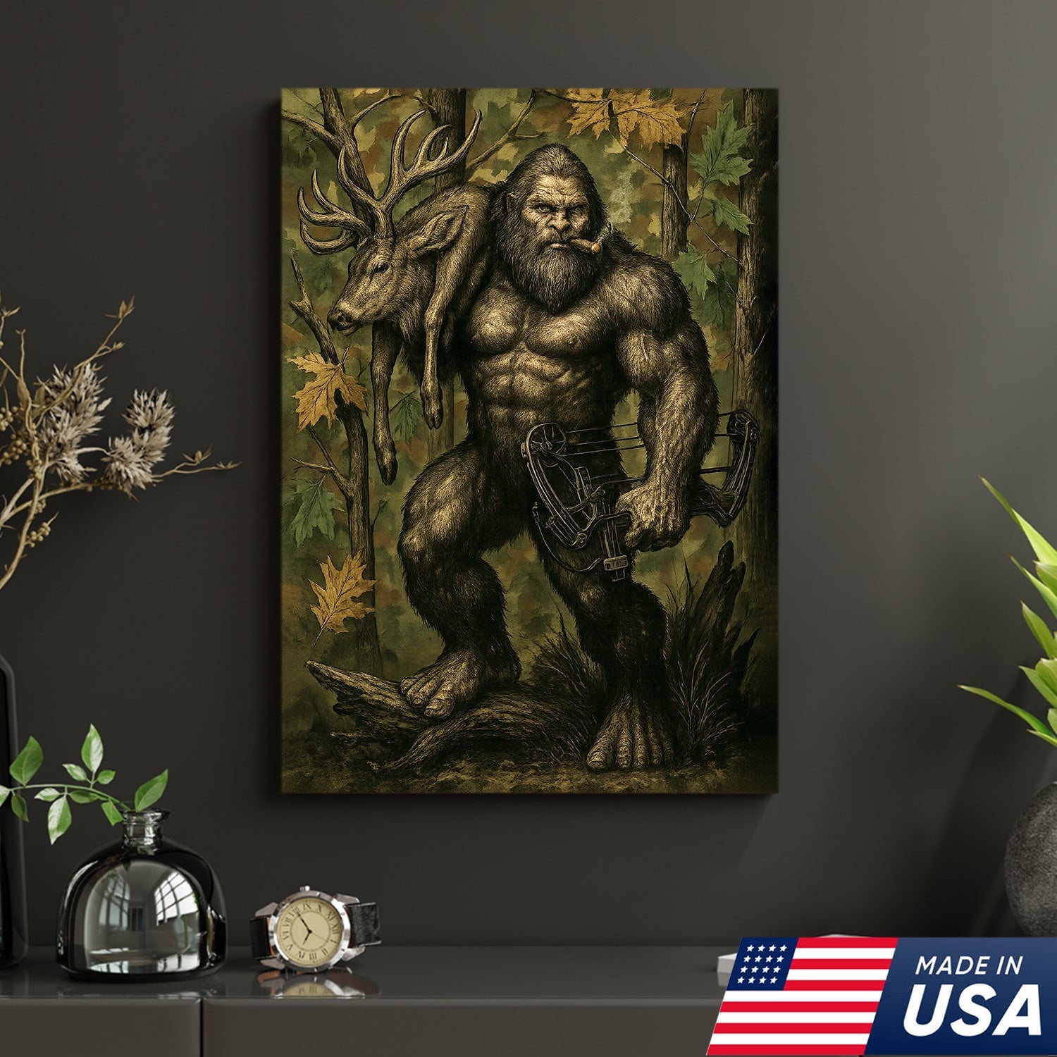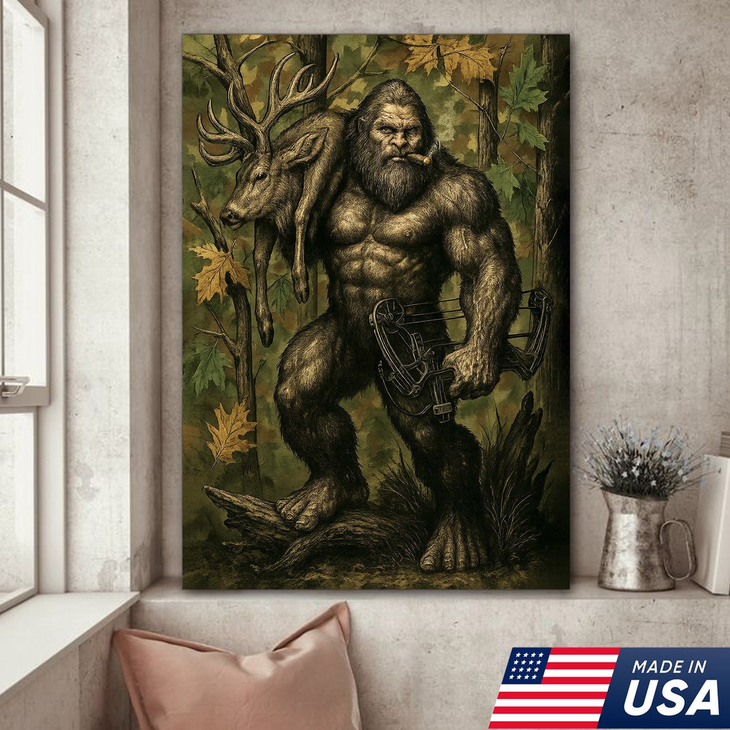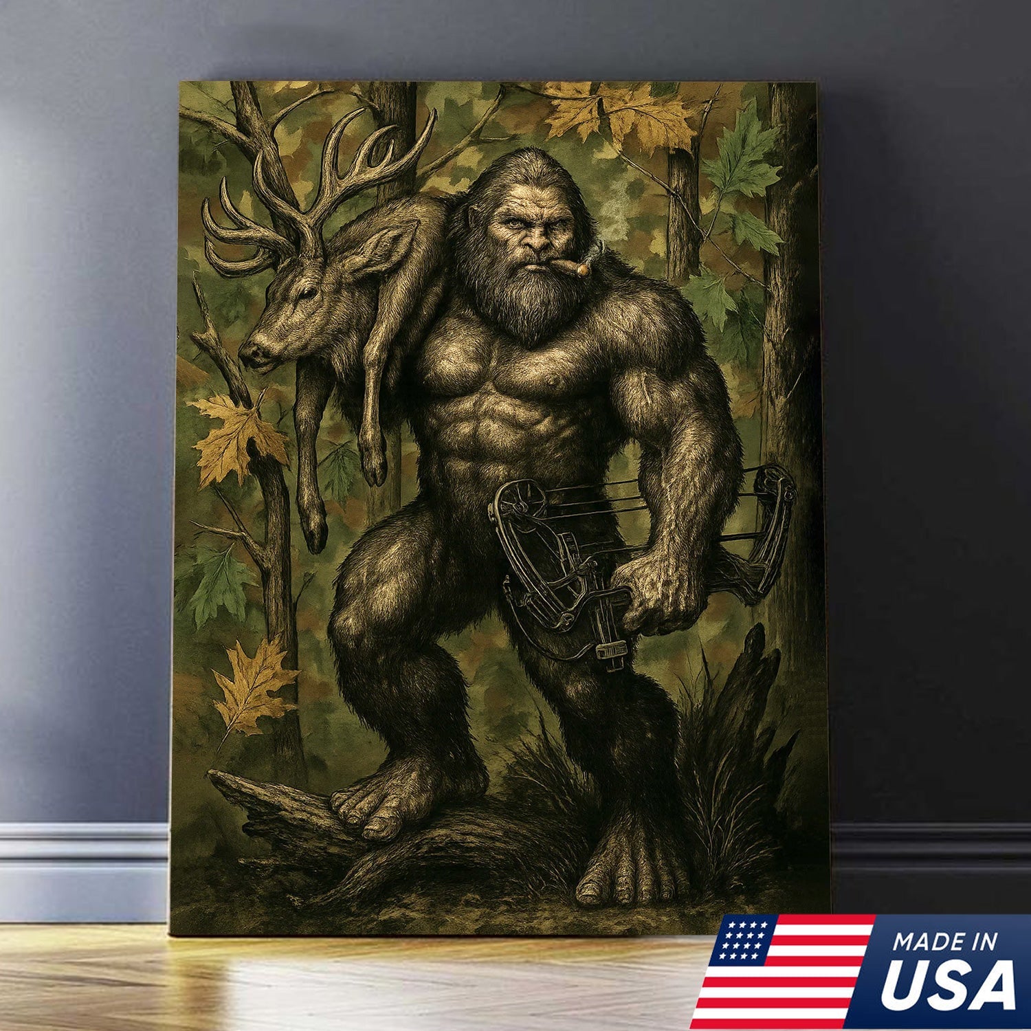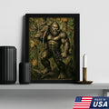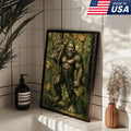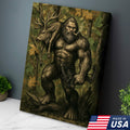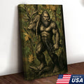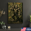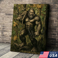 Bigfoot Hunter Canvas Wall Art, Mythical Sasquatch Bowhunting Deer Artwork, Rustic Woodland Decor for Hunters and Outdoor Lovers