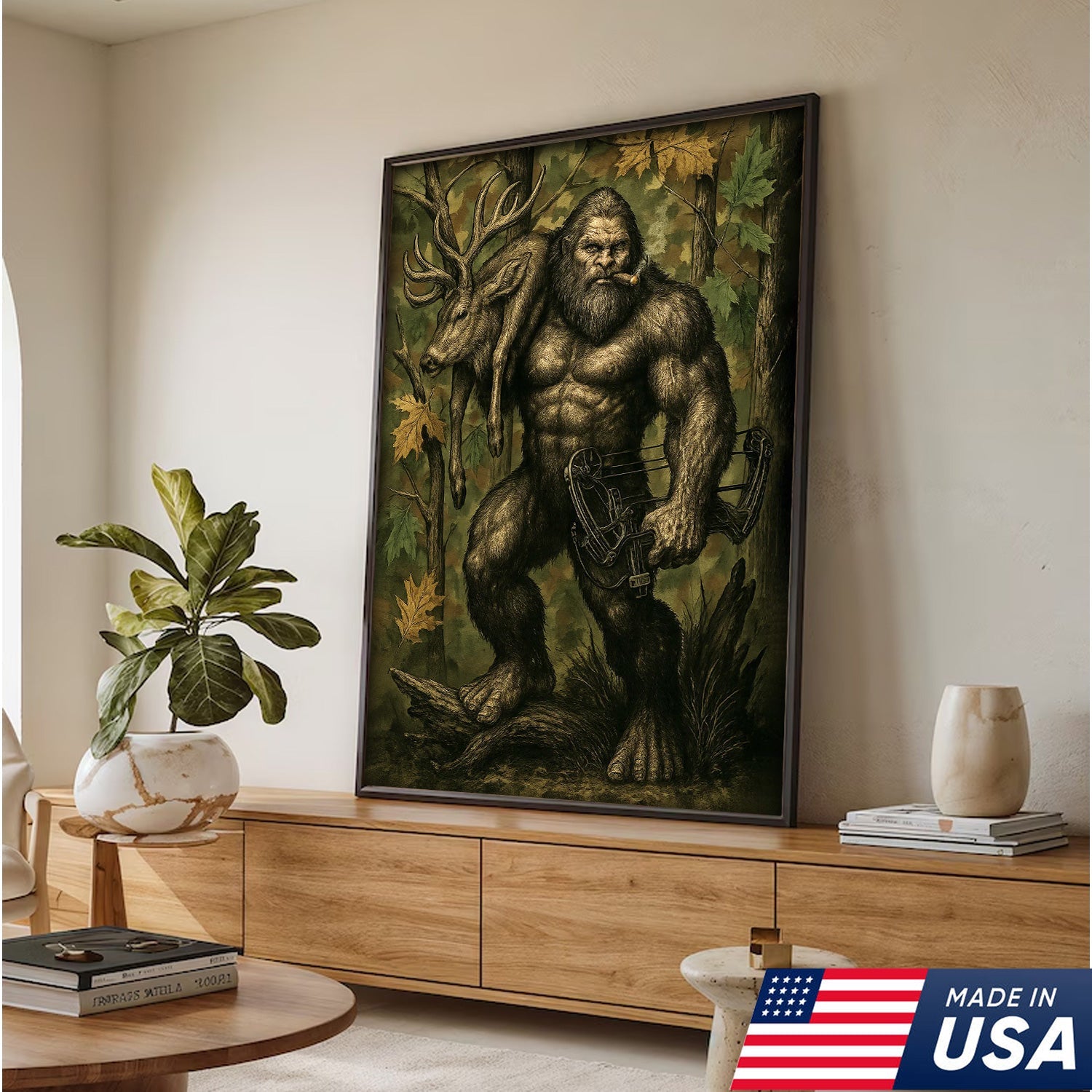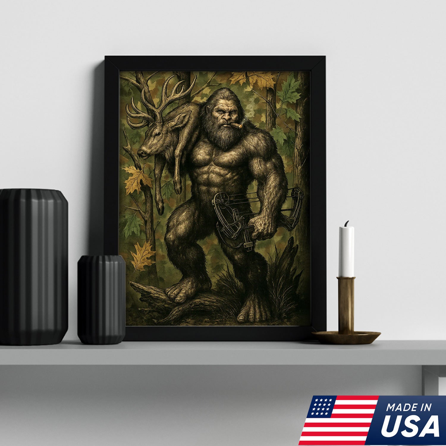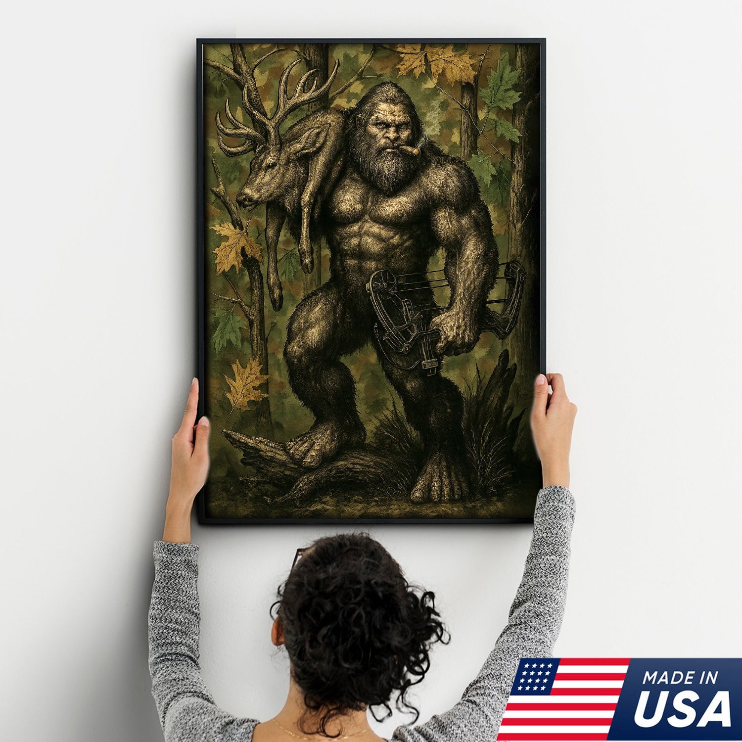 Bigfoot Hunter Canvas Wall Art, Mythical Sasquatch Bowhunting Deer Artwork, Rustic Woodland Decor for Hunters and Outdoor Lovers