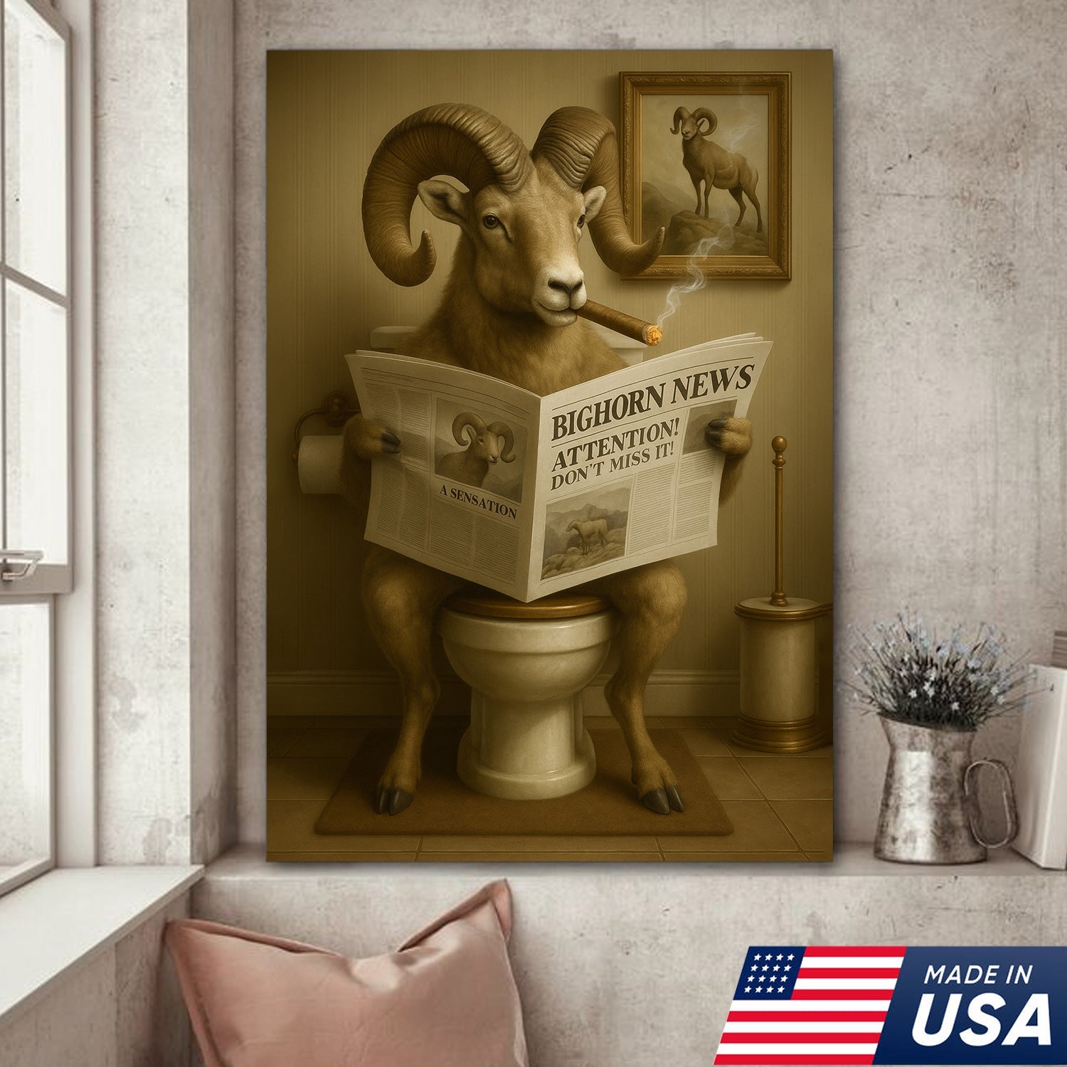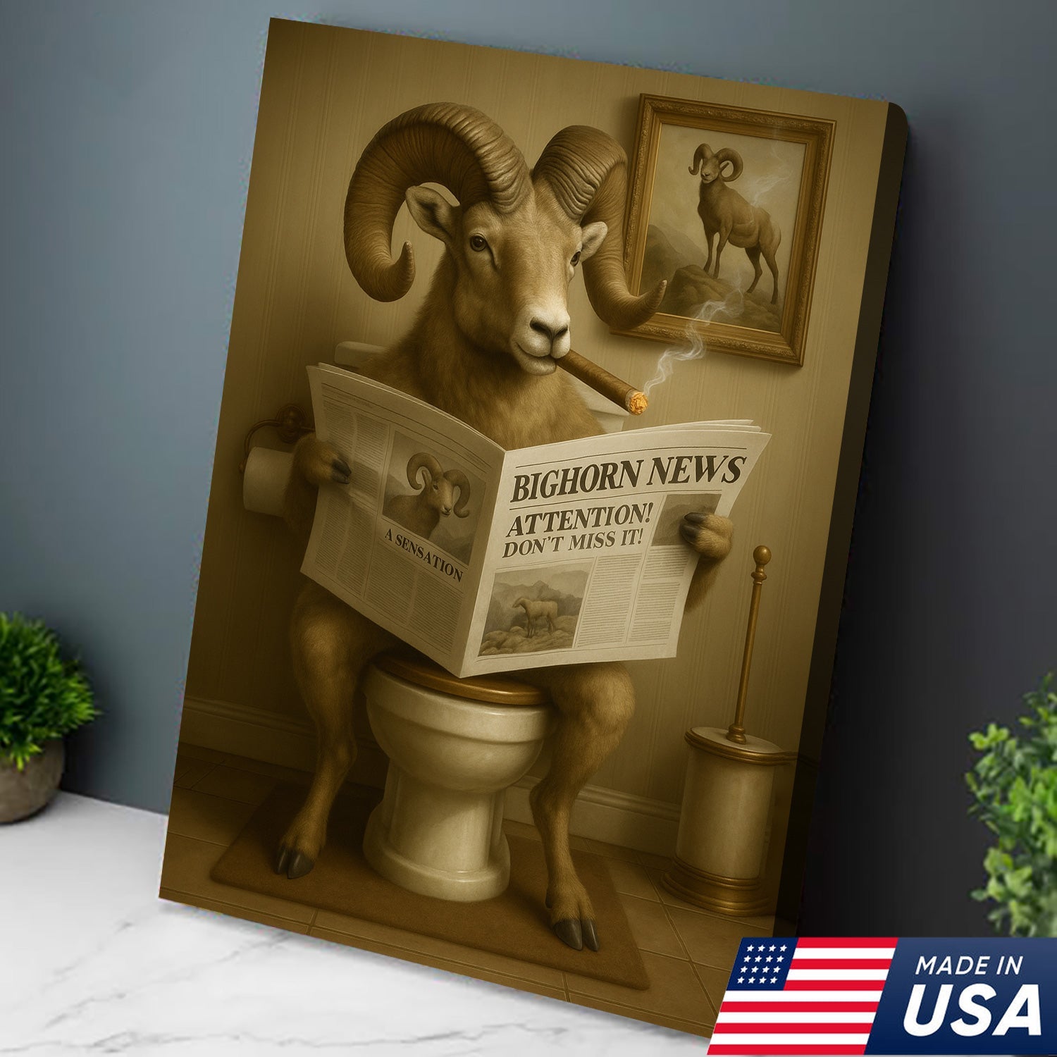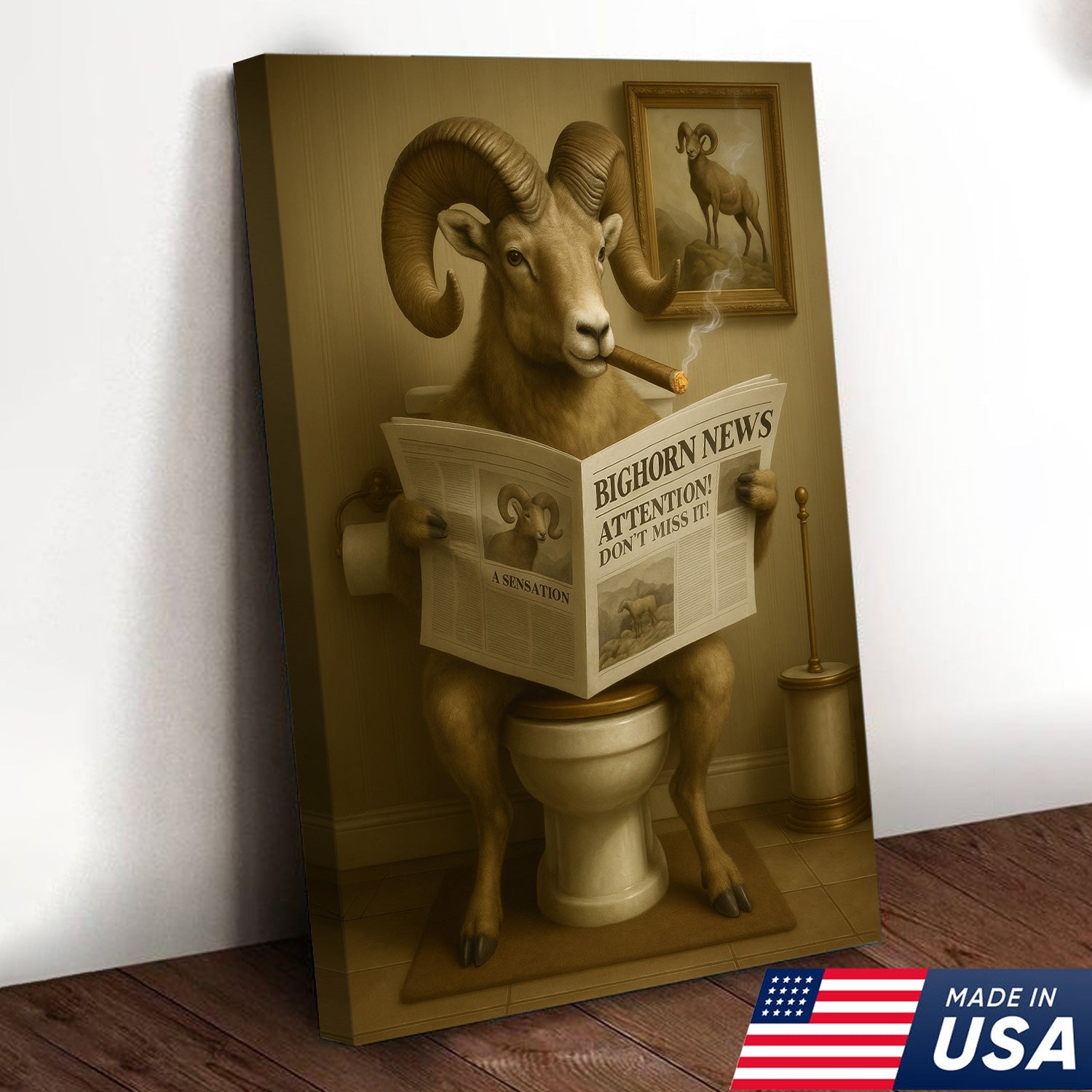 Bighorn Sheep Reading Newspaper Canvas – Funny Bathroom Wall Art for Rustic Cabin, Lodge & Man Cave Gift