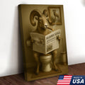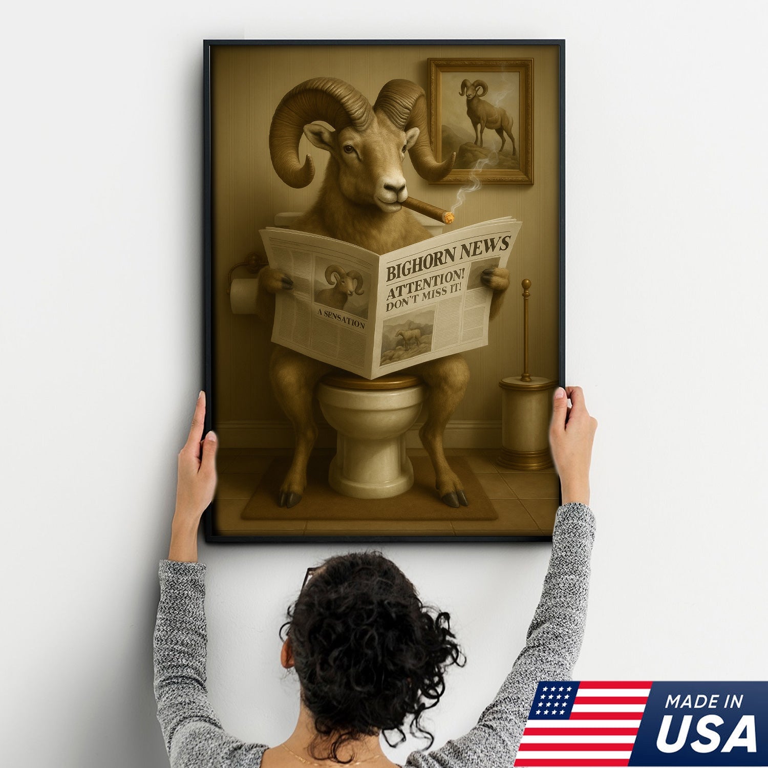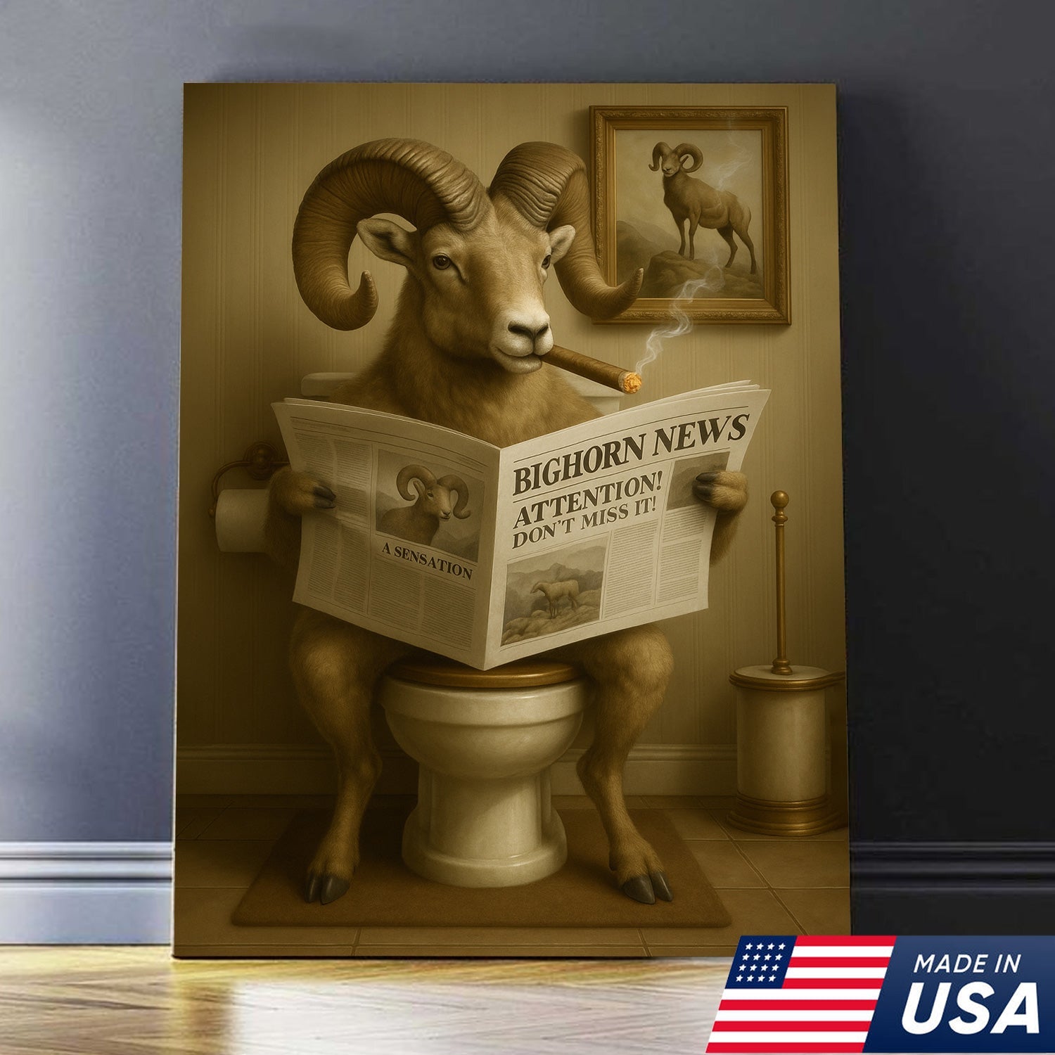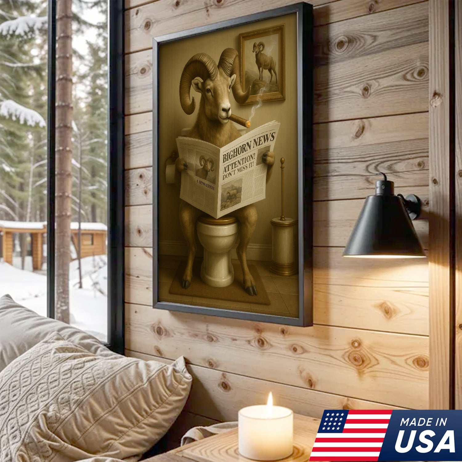 Bighorn Sheep Reading Newspaper Canvas – Funny Bathroom Wall Art for Rustic Cabin, Lodge & Man Cave Gift