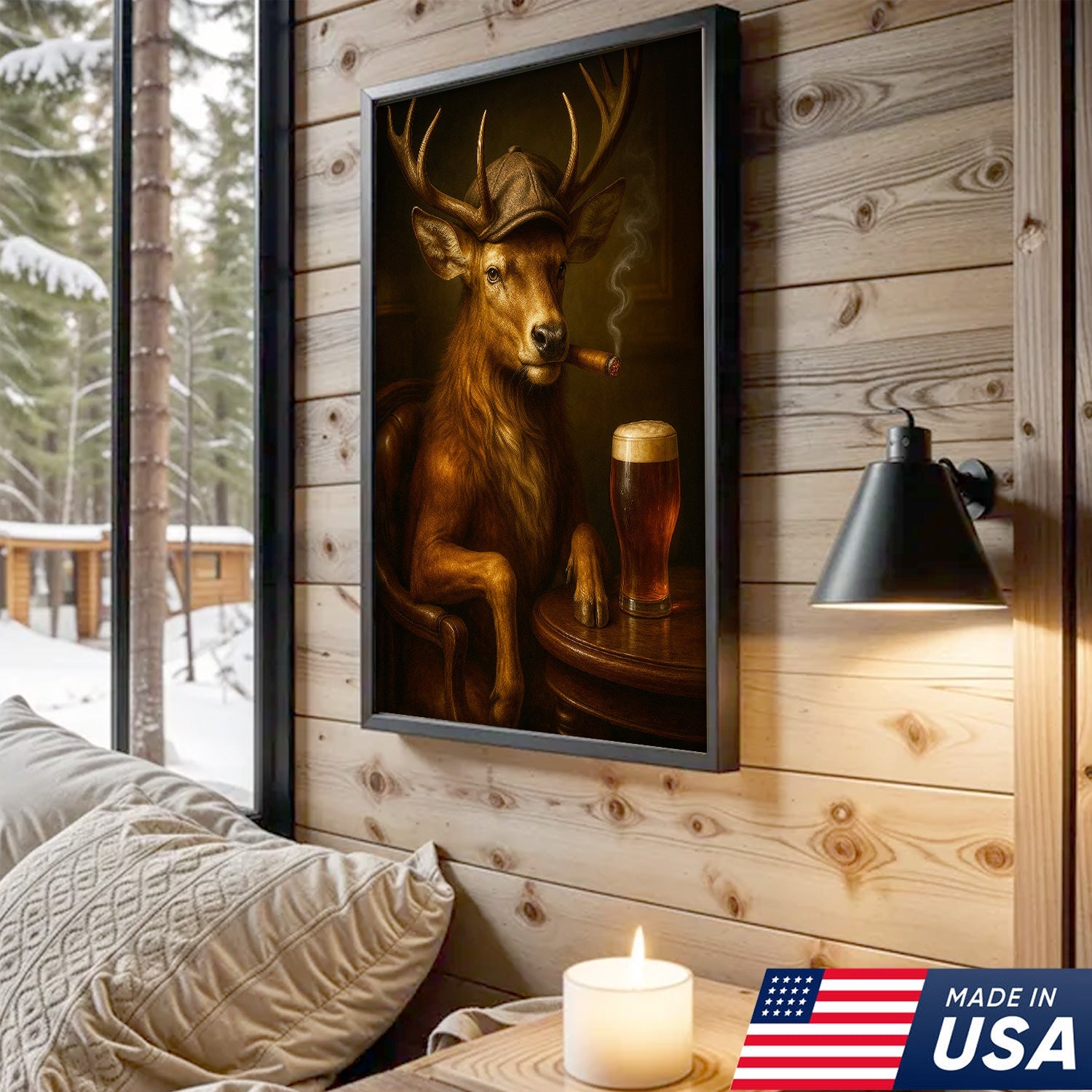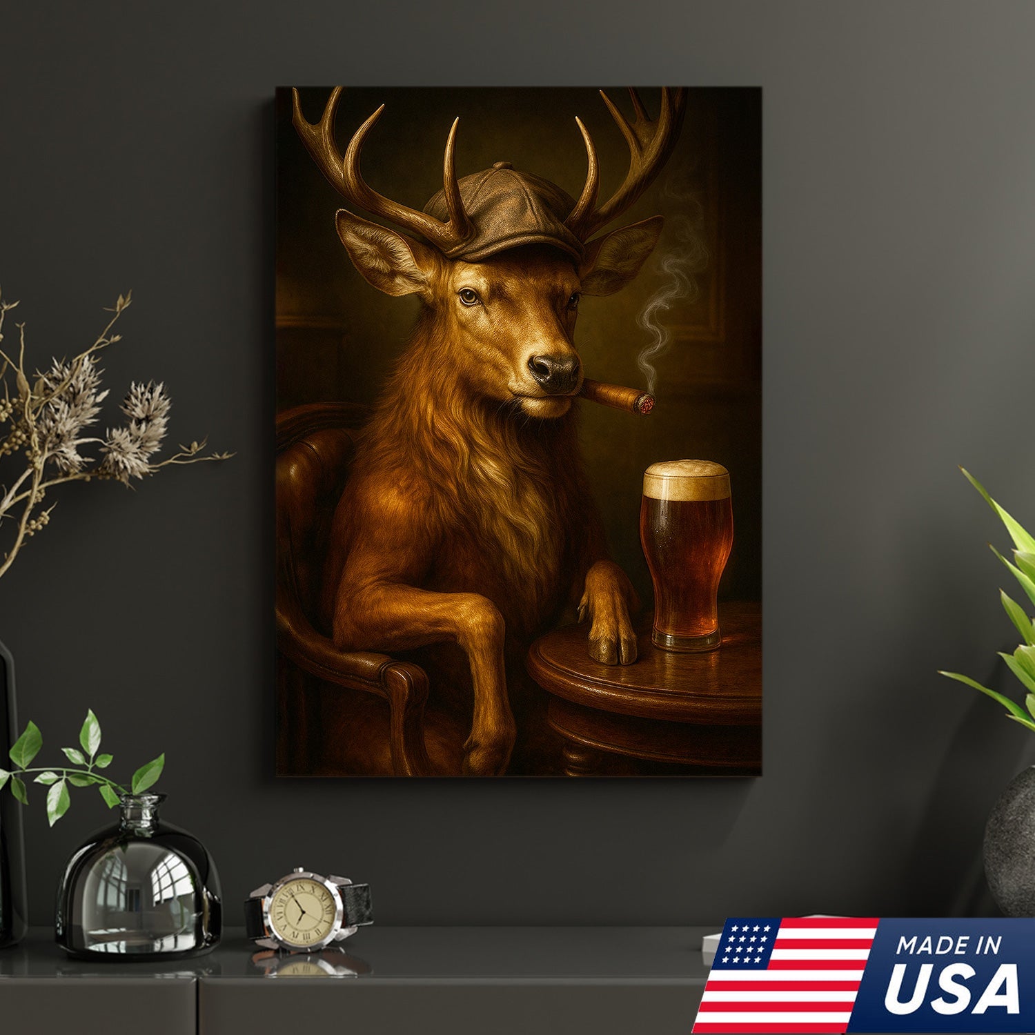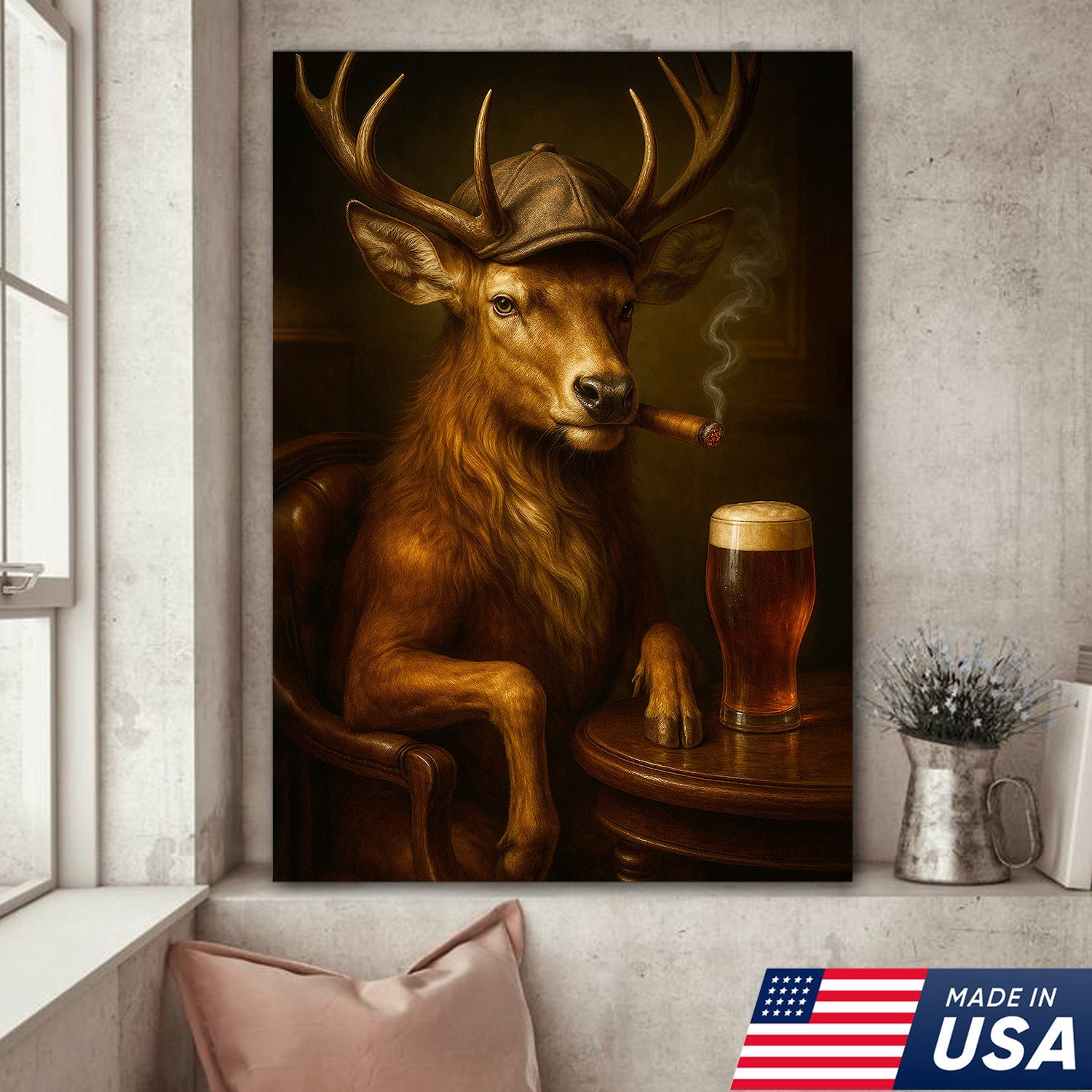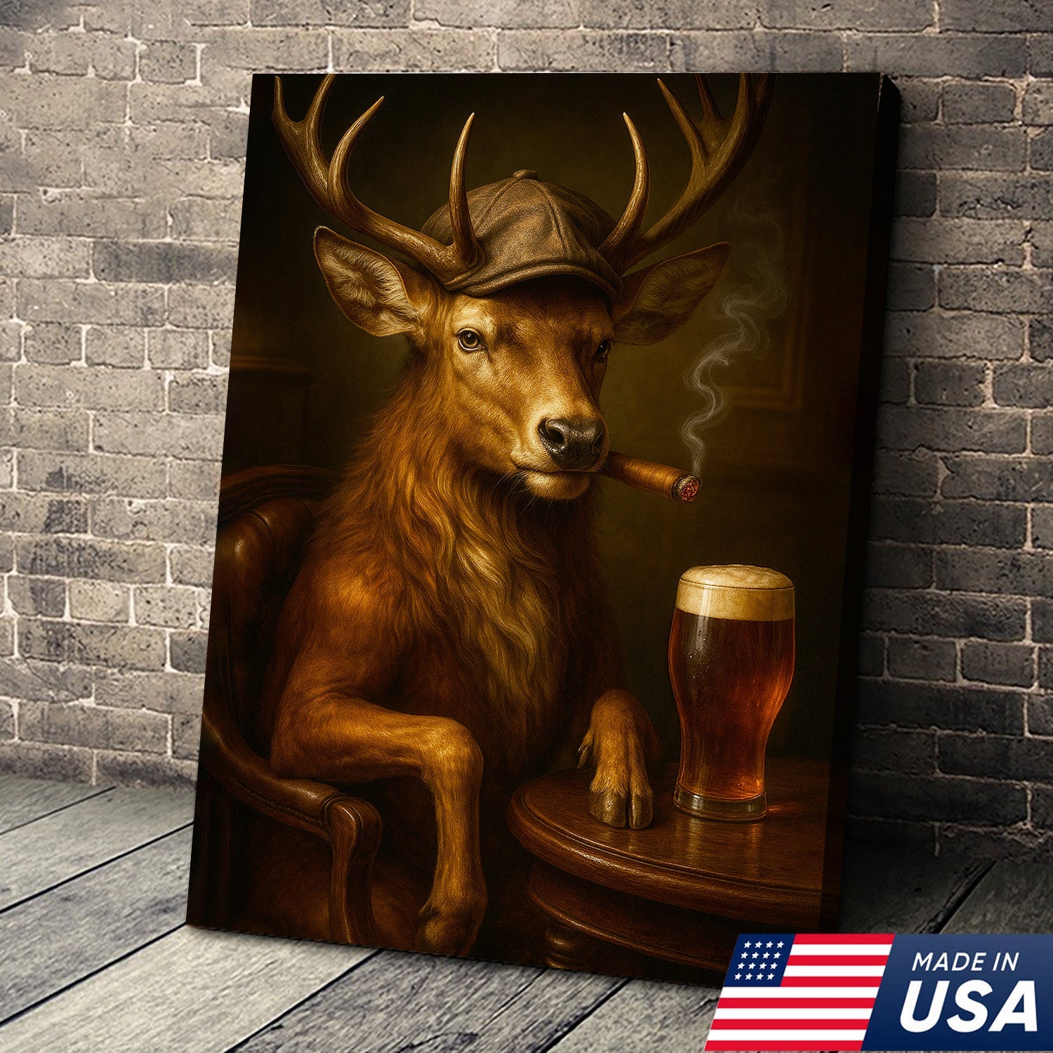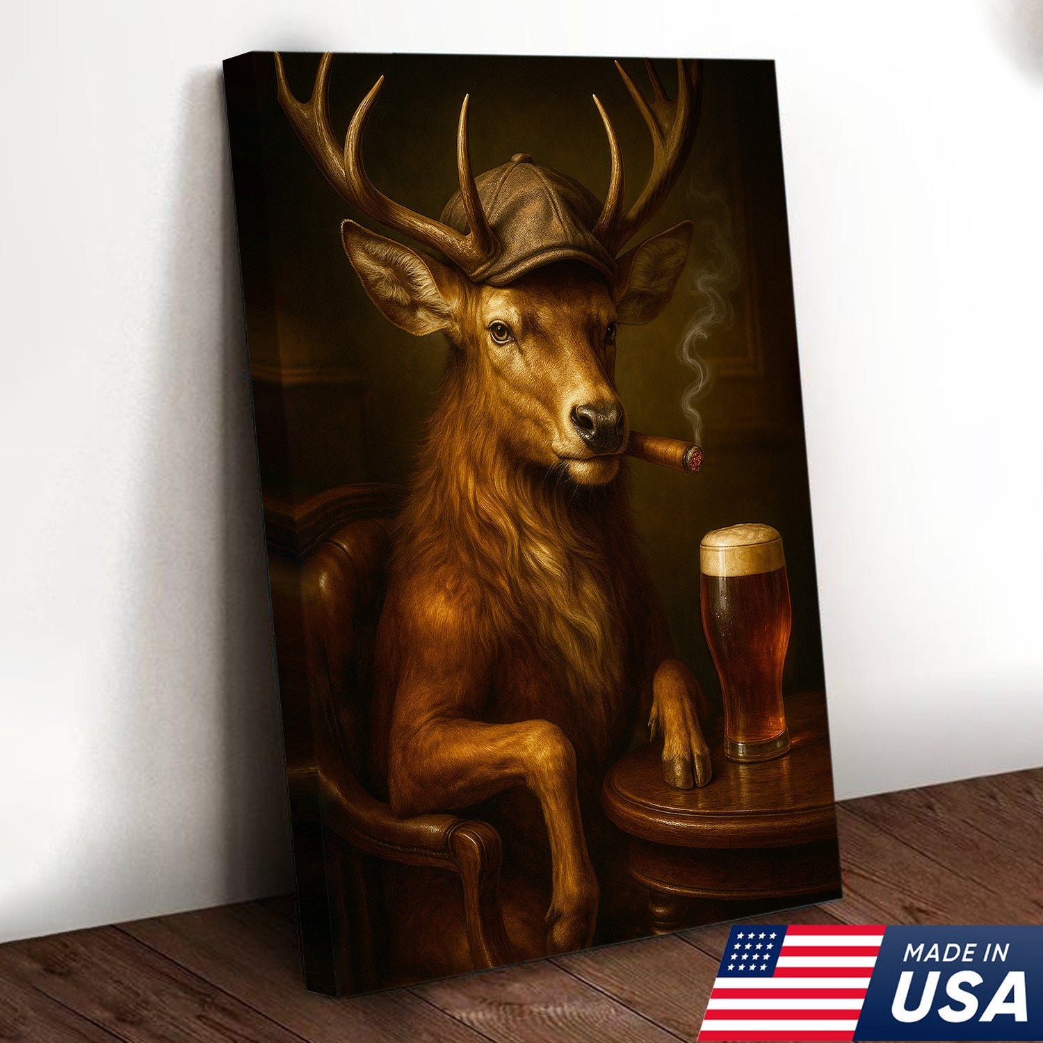 Classy Deer Smoking Cigar Canvas – Rustic Beer Lover Wall Art for Cabin & Man Cave