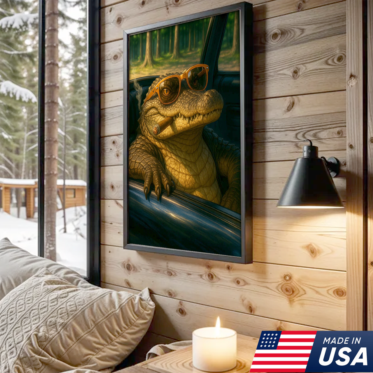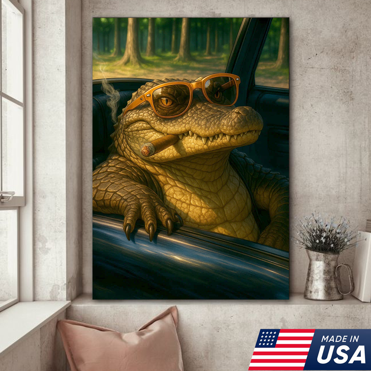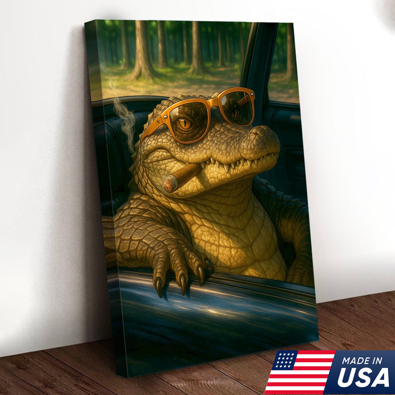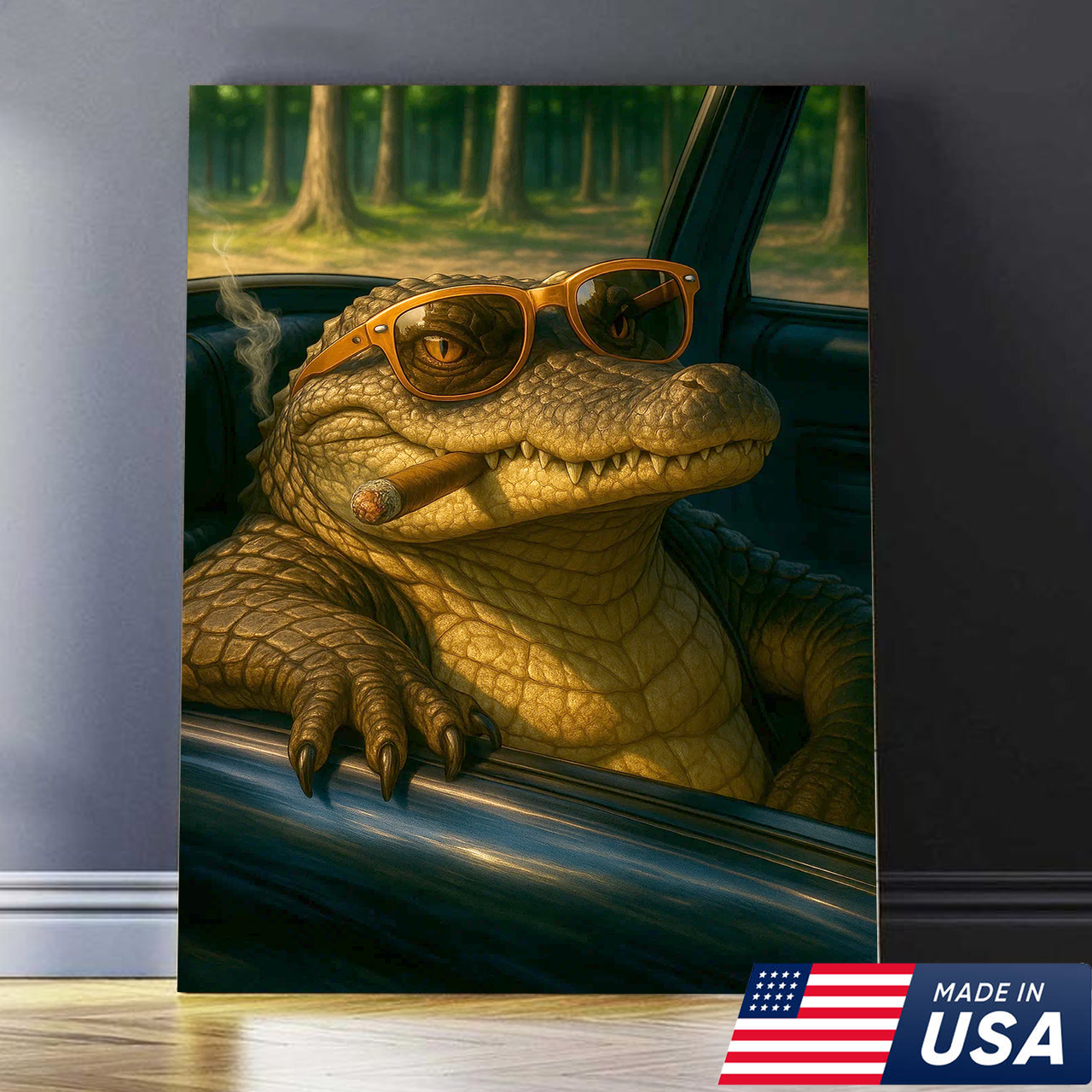 Cool Alligator Canvas Wall Art, Retro Sunglasses Gator in Car Portrait, Funny Swamp Reptile Decor for Men