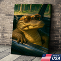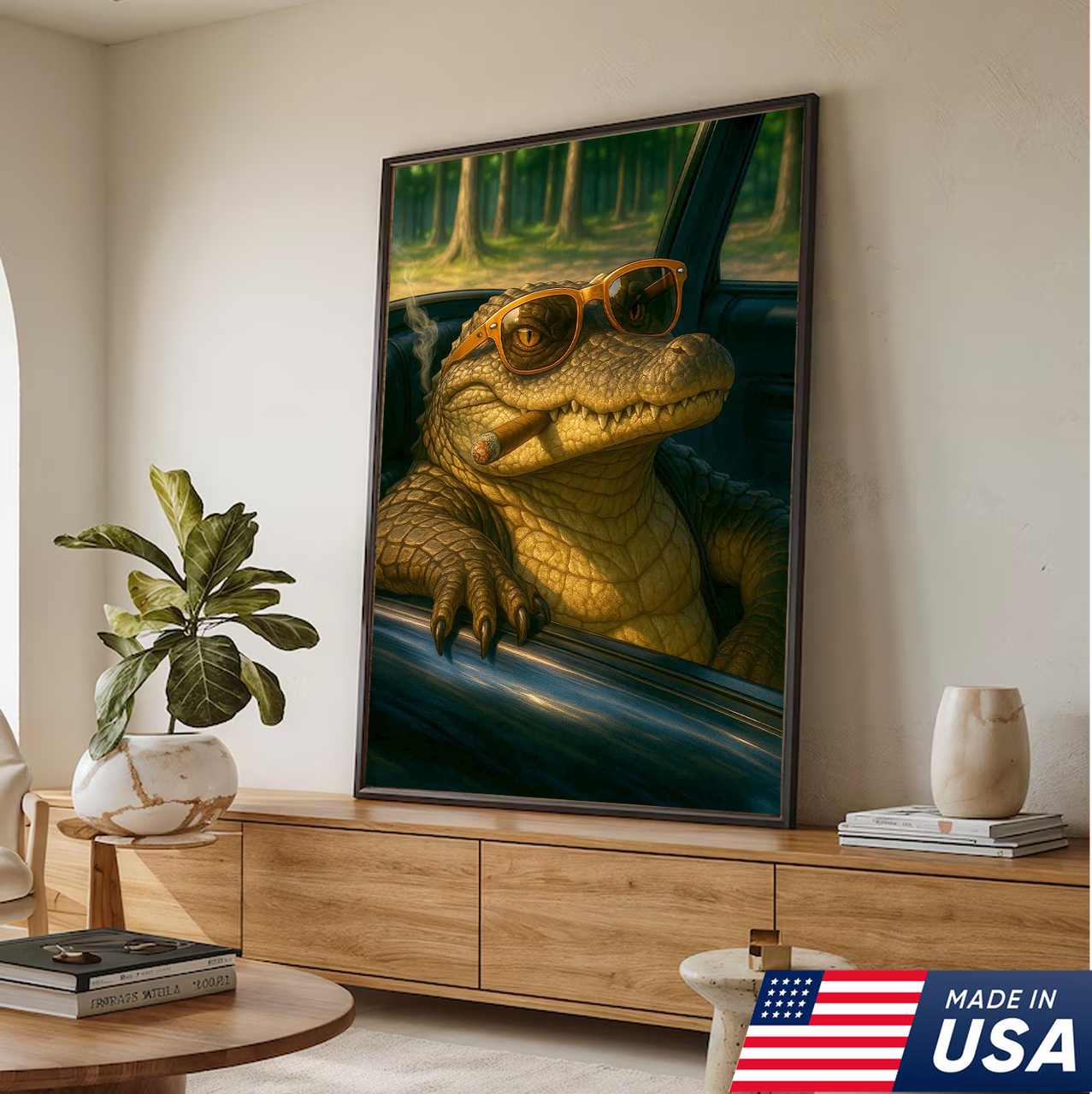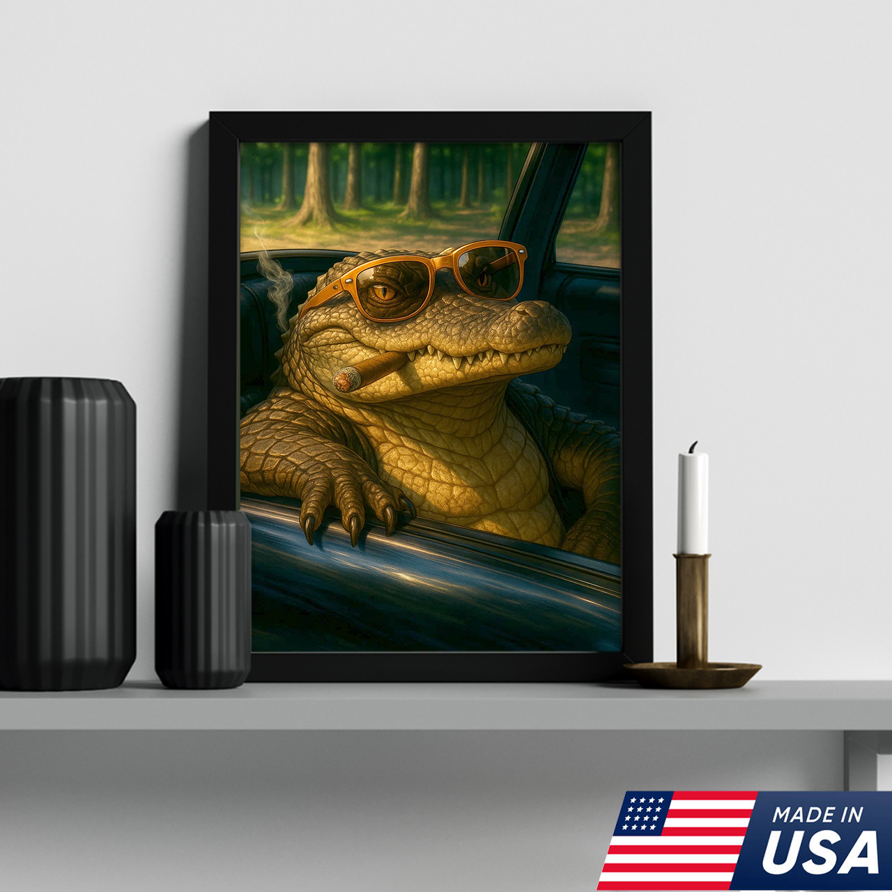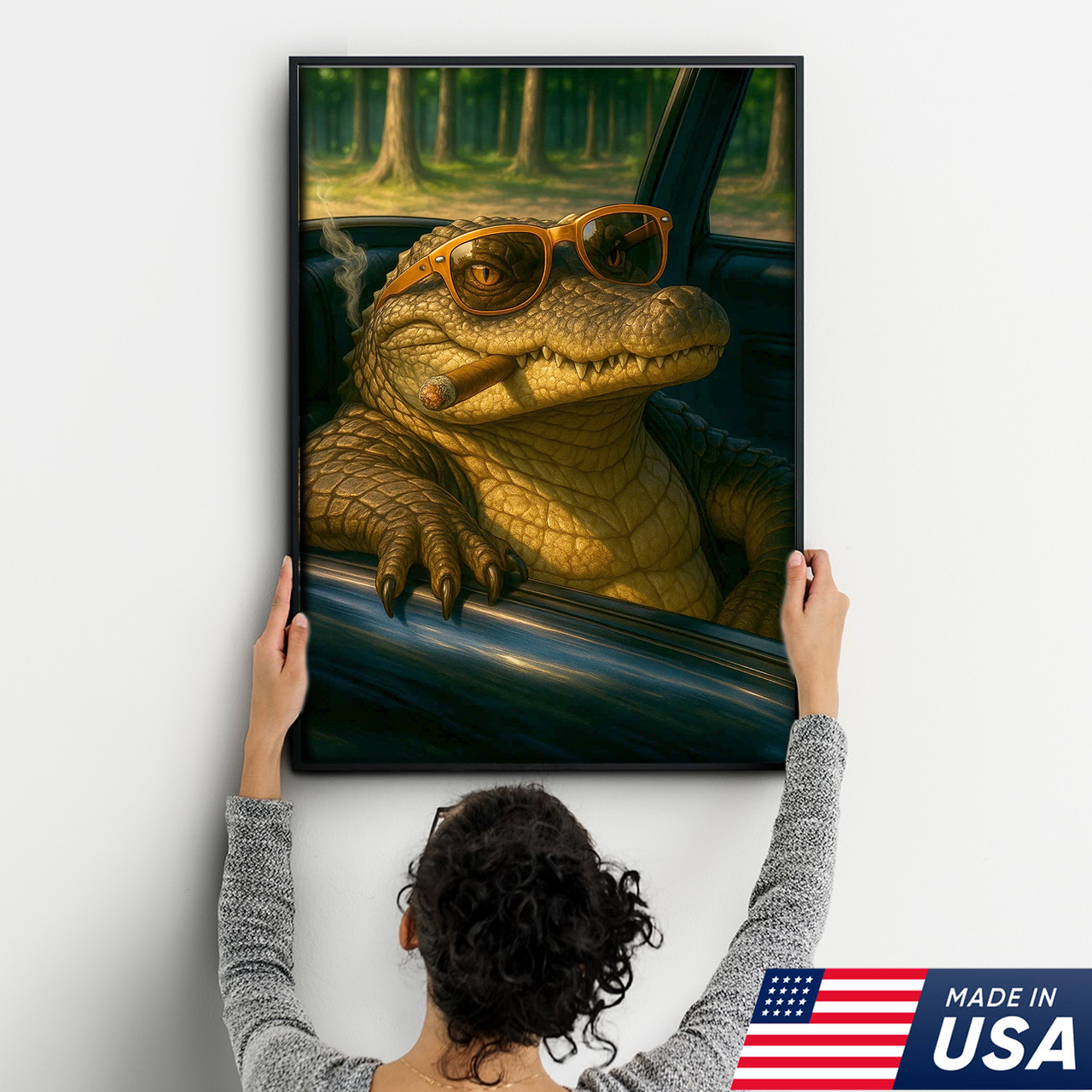 Cool Alligator Canvas Wall Art, Retro Sunglasses Gator in Car Portrait, Funny Swamp Reptile Decor for Men