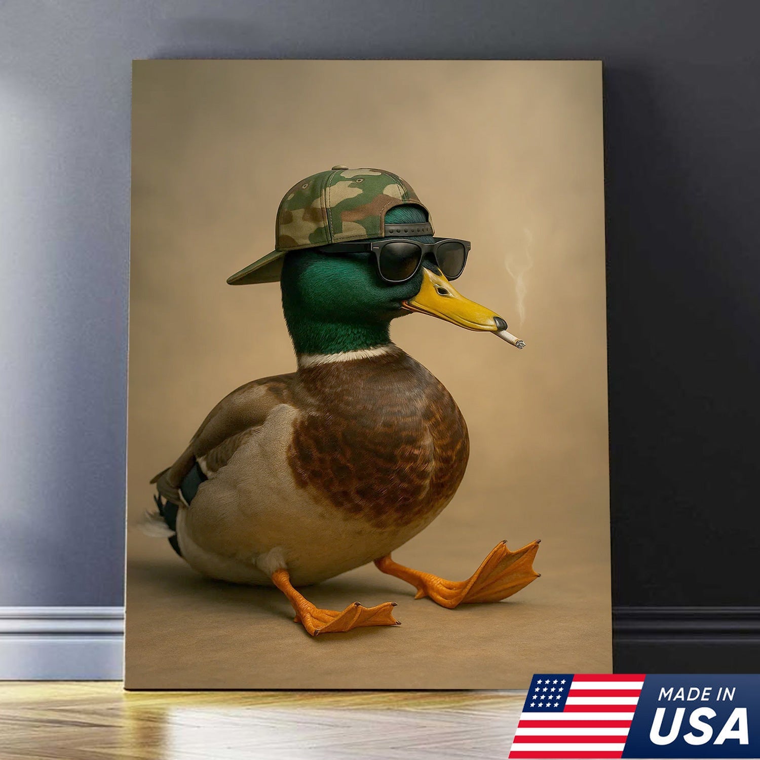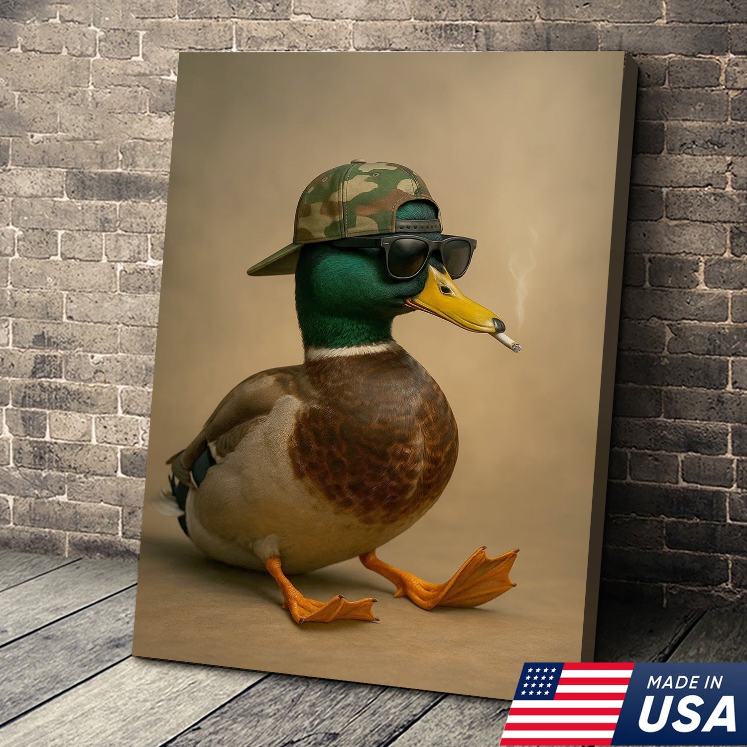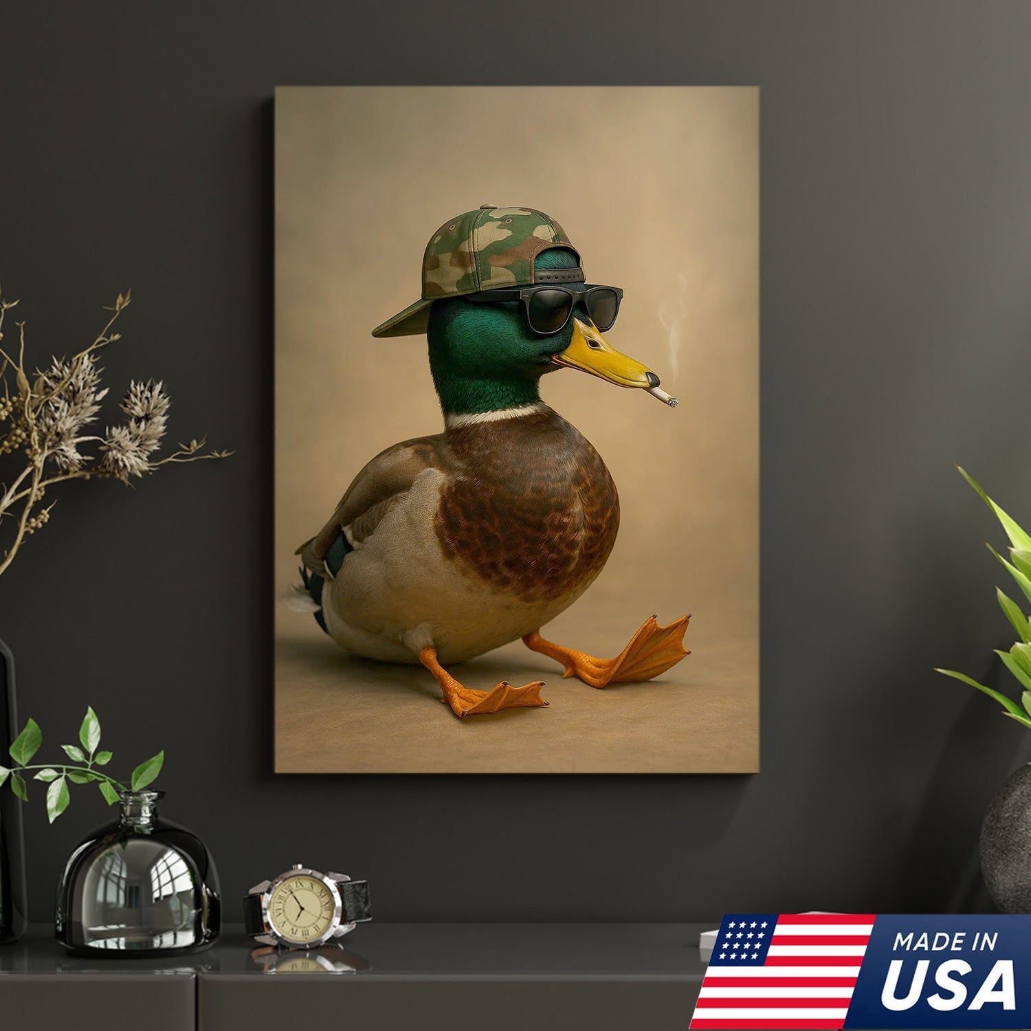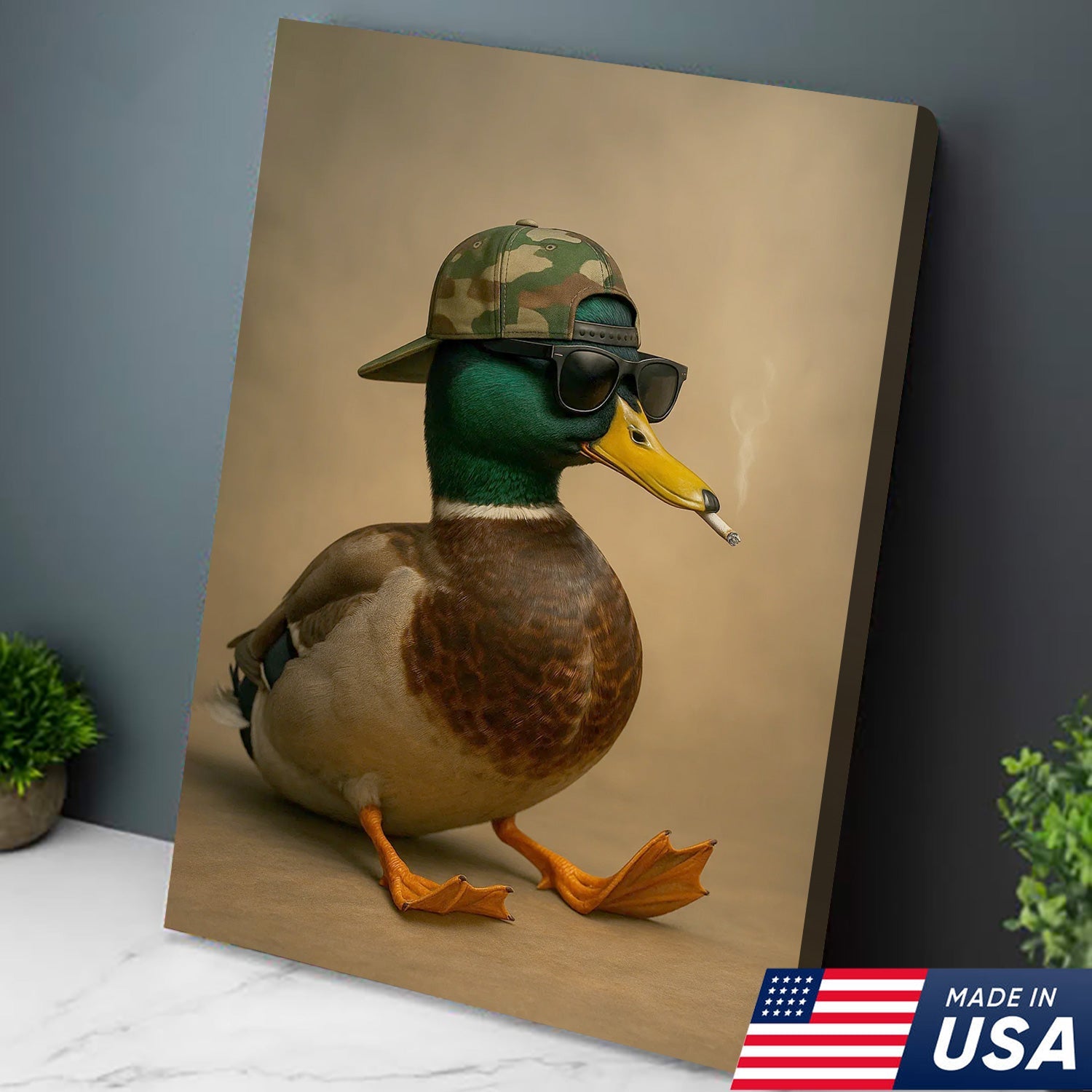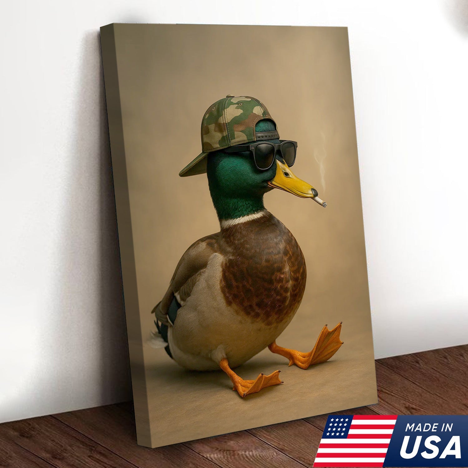 Cool Mallard Duck with Camo Hat Wall Art – Funny Hunting Canvas Print for Cabin, Lodge & Man Cave Decor