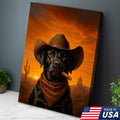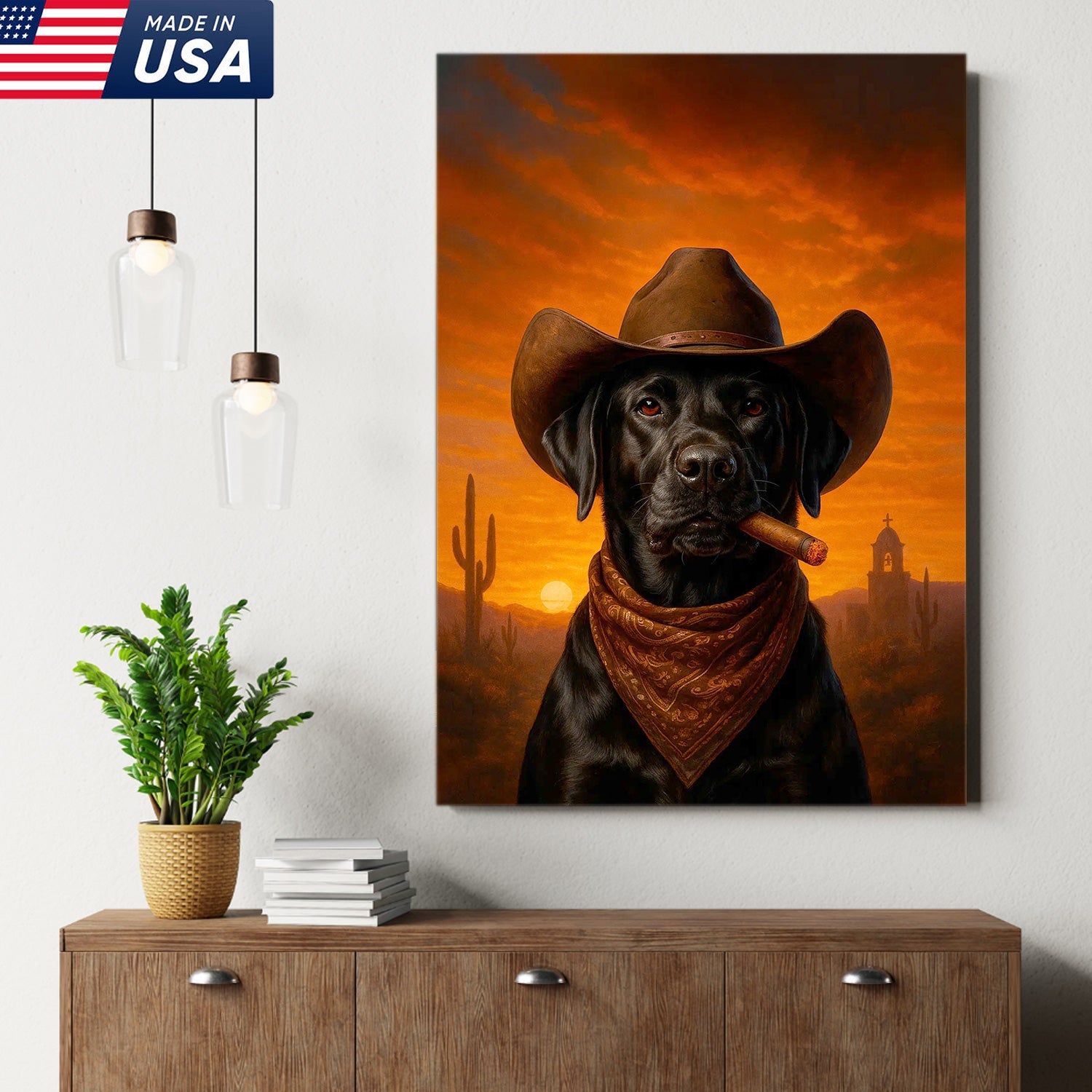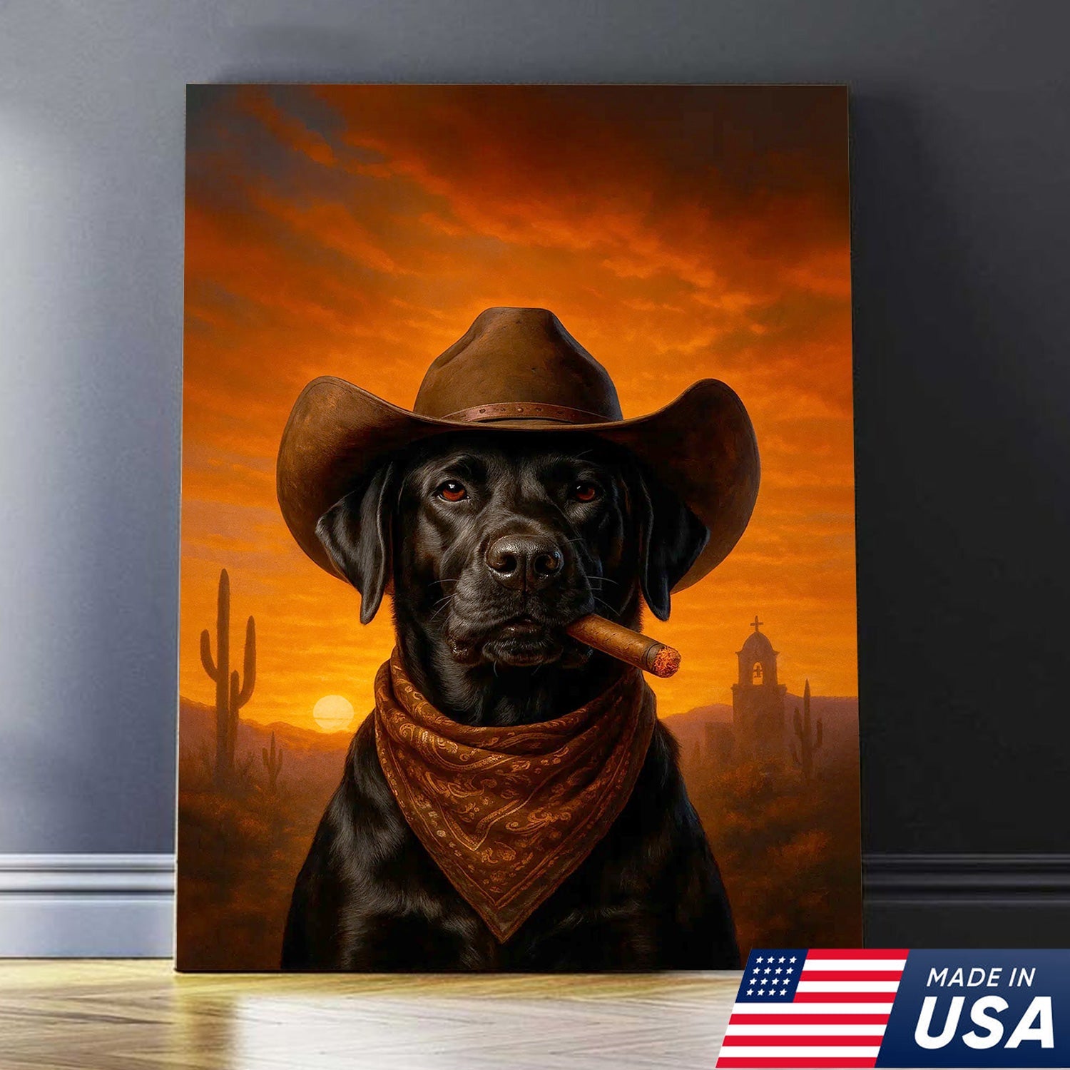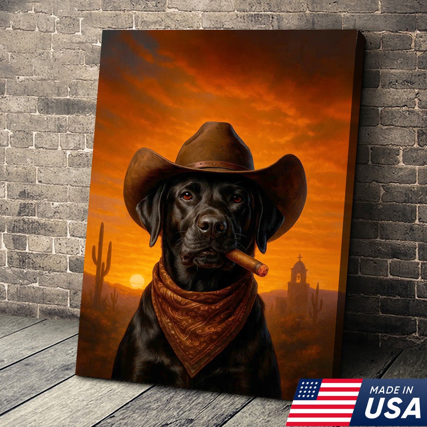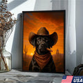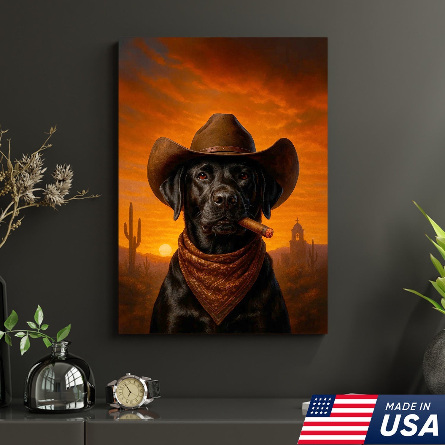 Cowboy Dog Canvas Wall Art – Rustic Western Decor – Black Labrador with Hat and Bandana Print