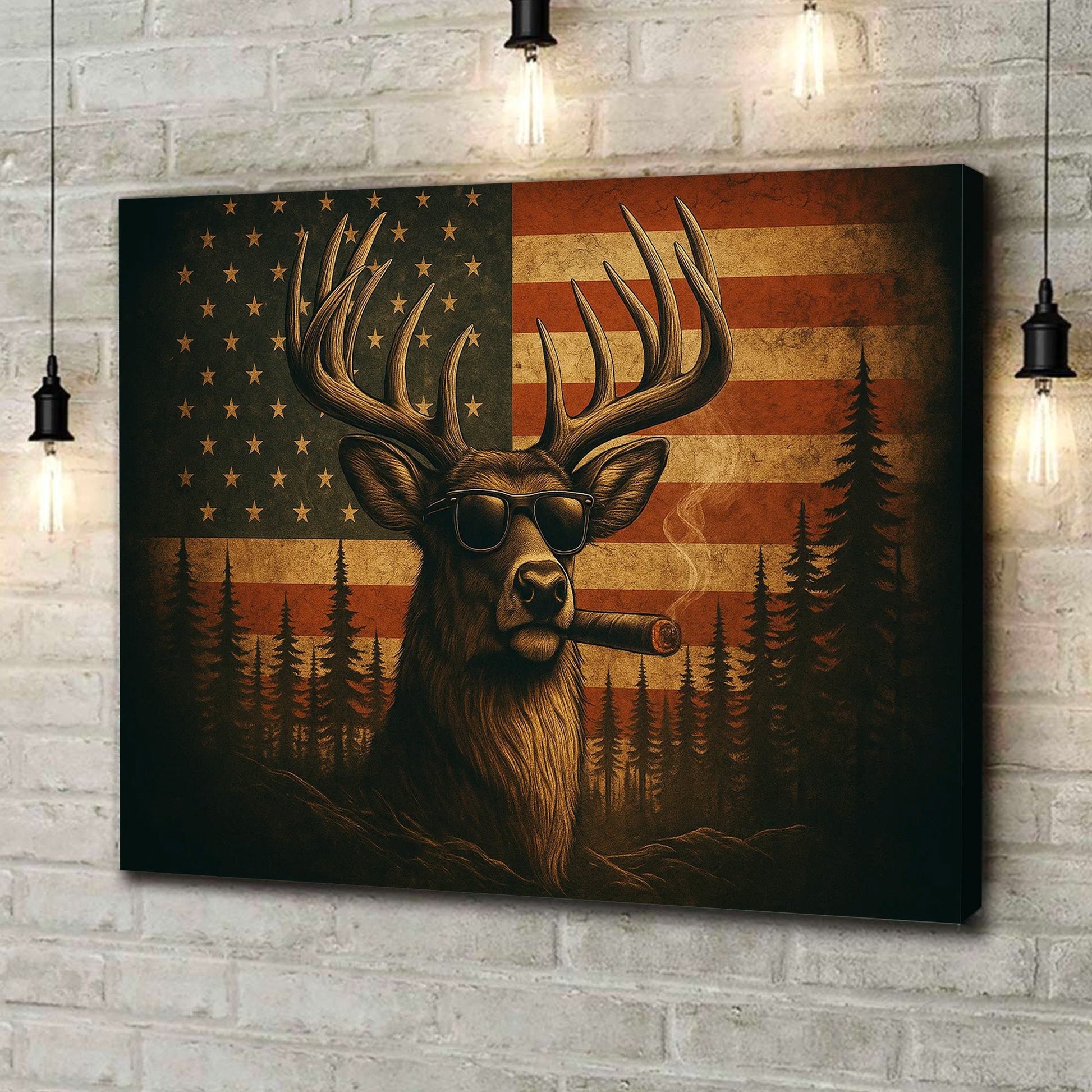 Deer Canvas Wall Art – Cool Buck with Sunglasses and USA Flag Rustic Hunting Lodge Decor