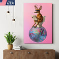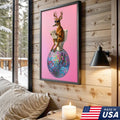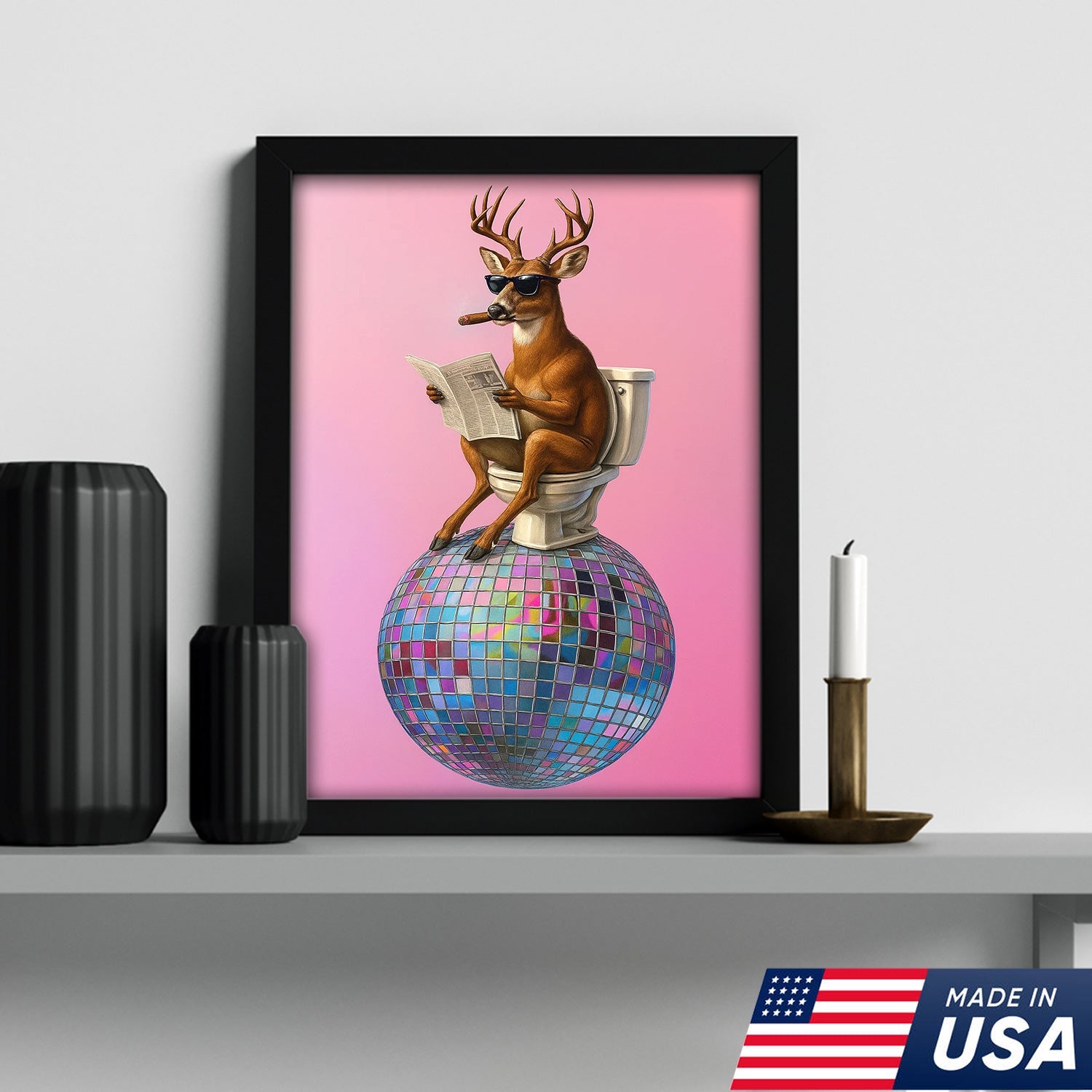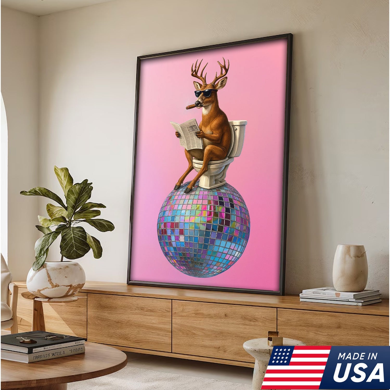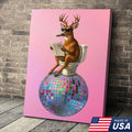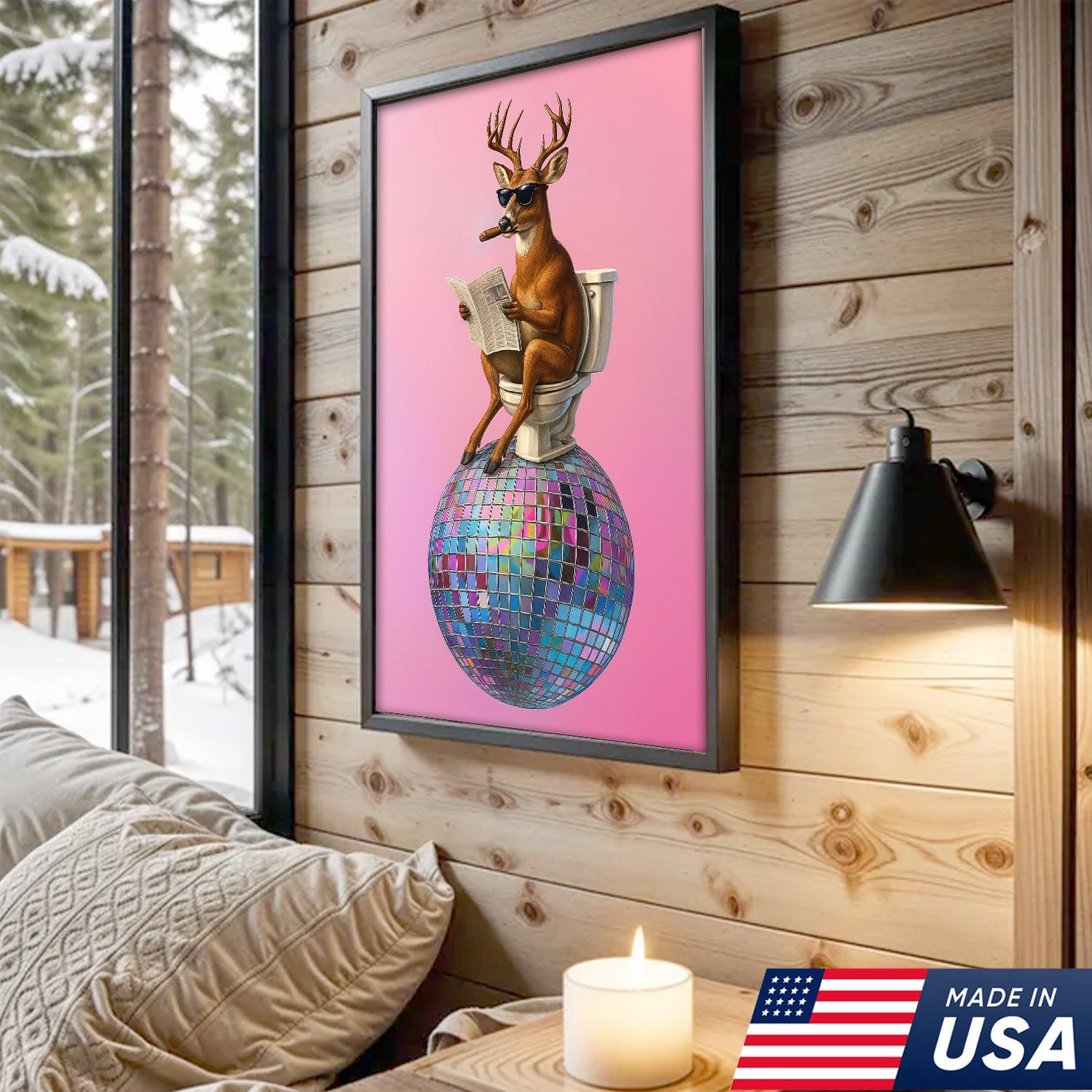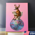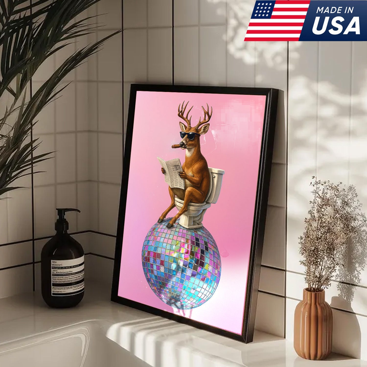 Deer Canvas Wall Art – Funny Buck Reading Newspaper on Toilet with Disco Ball Unique Bathroom Decor