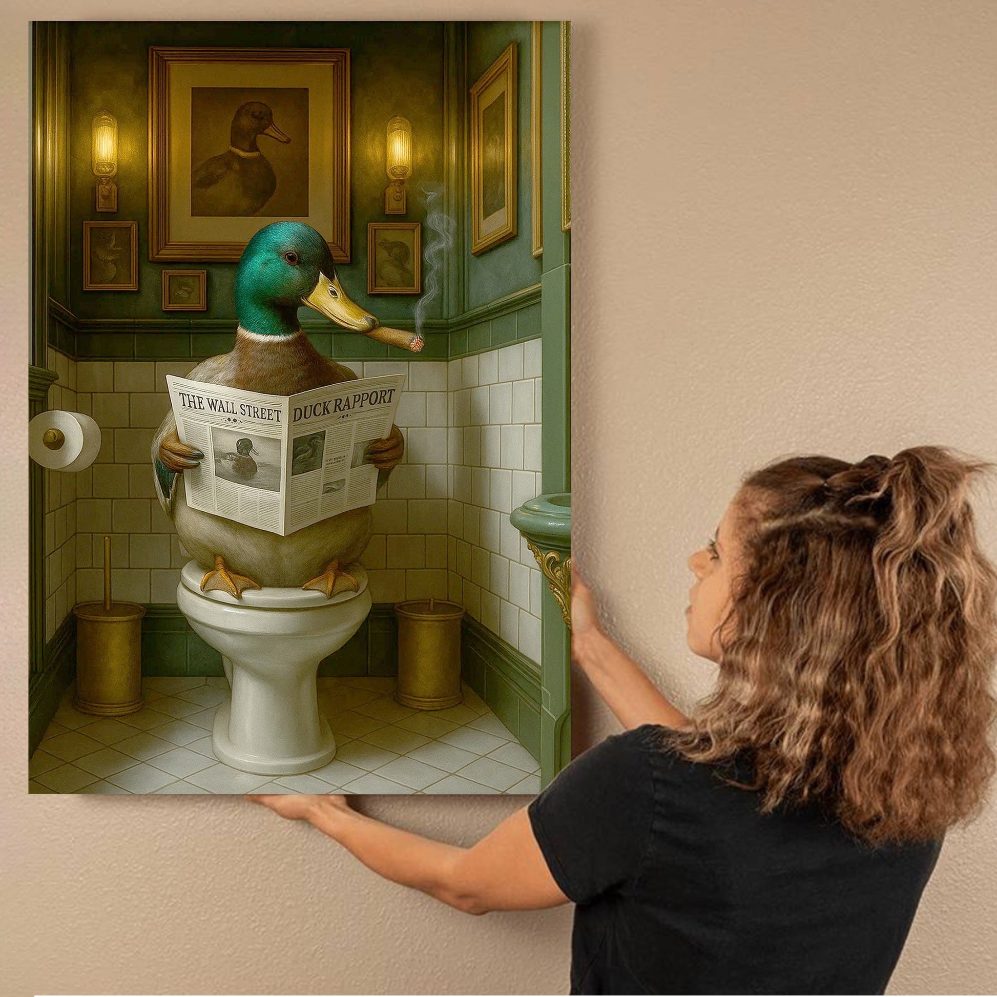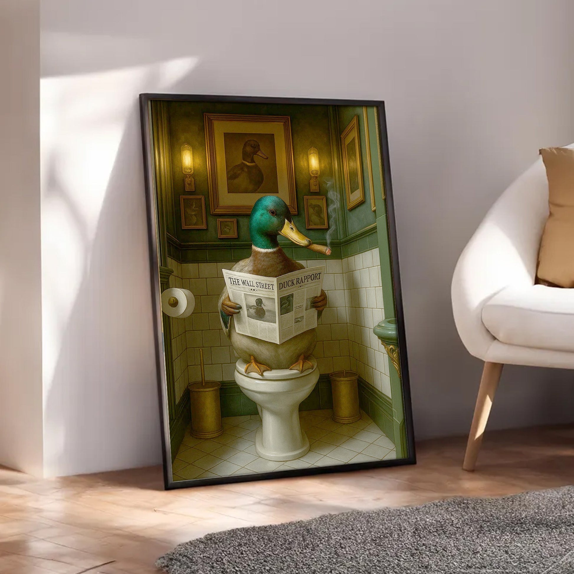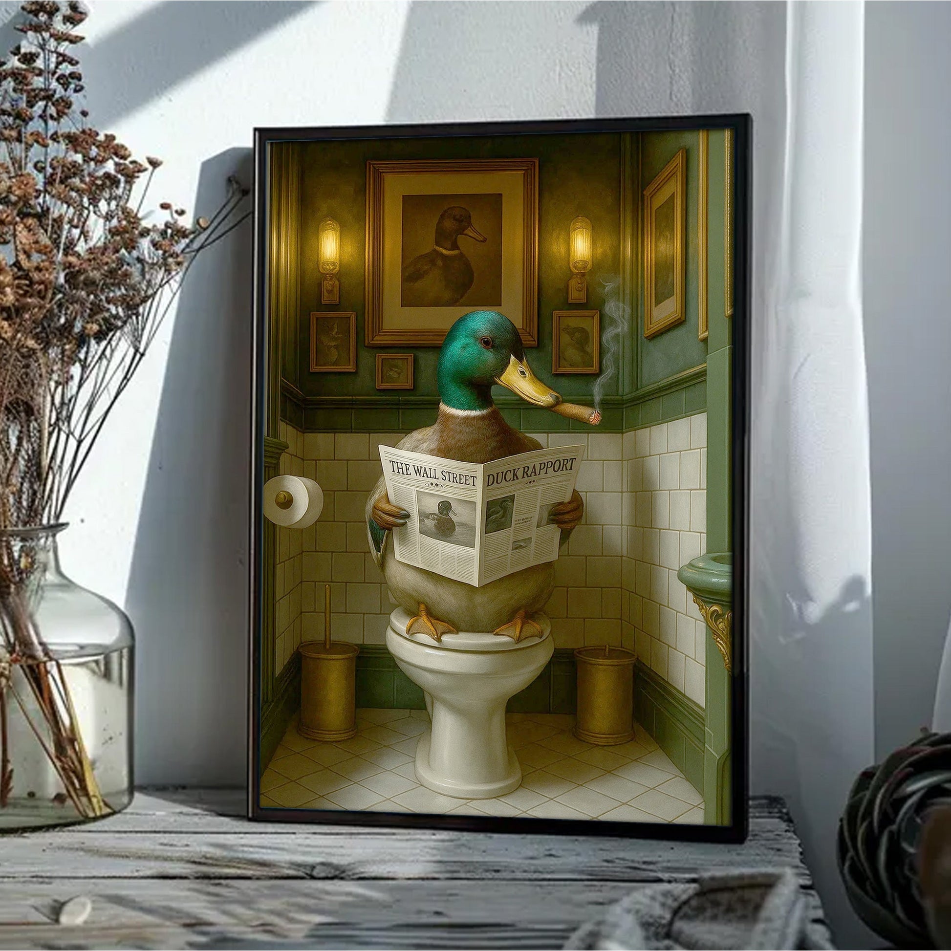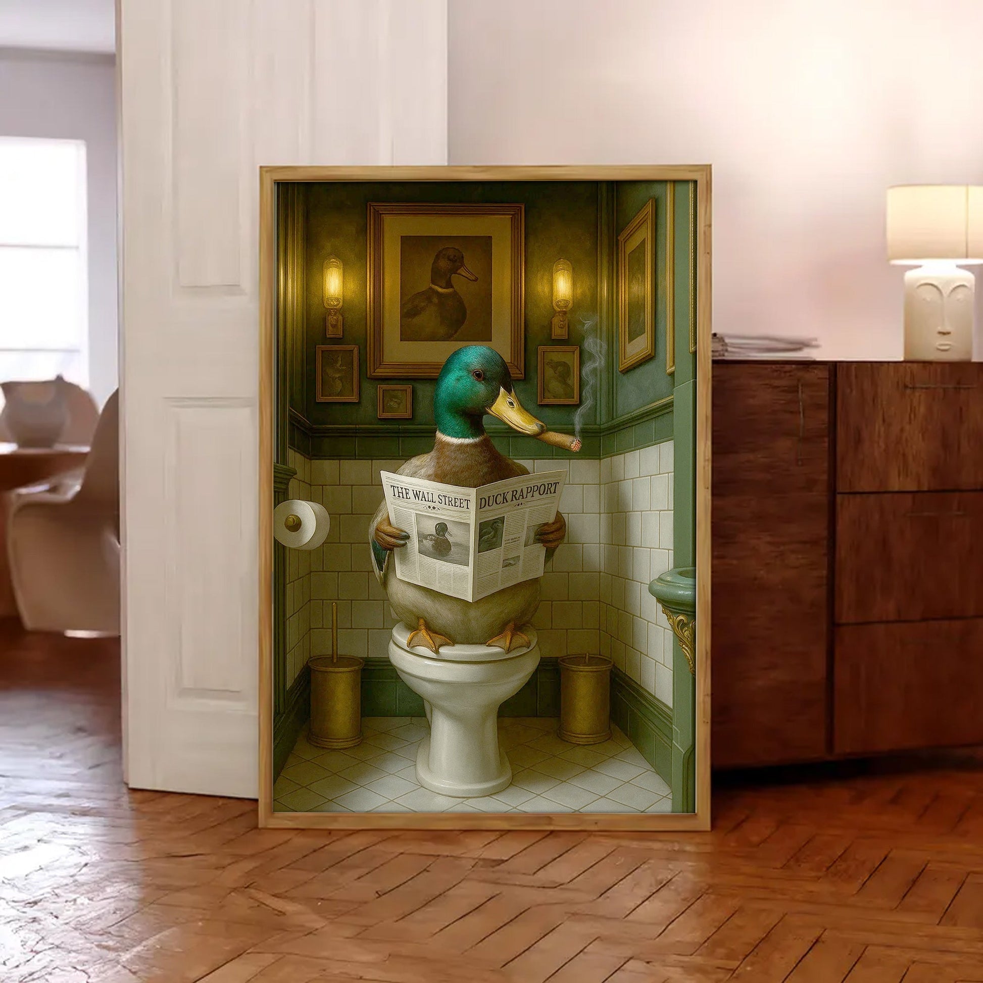 Duck Reading News Bathroom Wall Art – Rustic Decor for Men, Hunting Cabin Poster Hunters