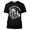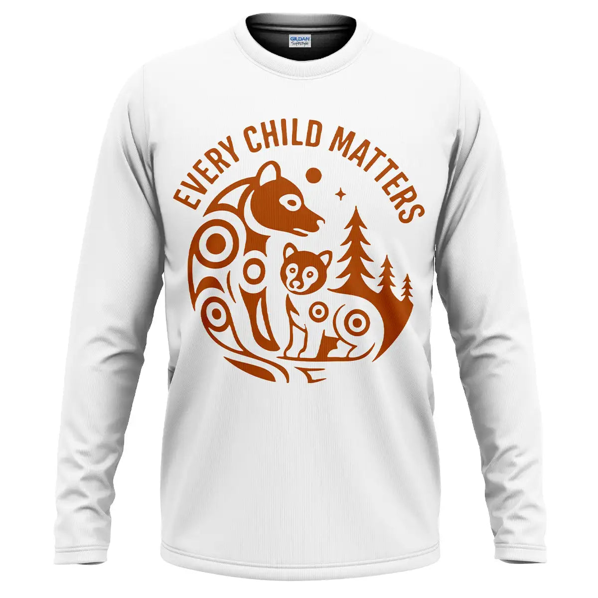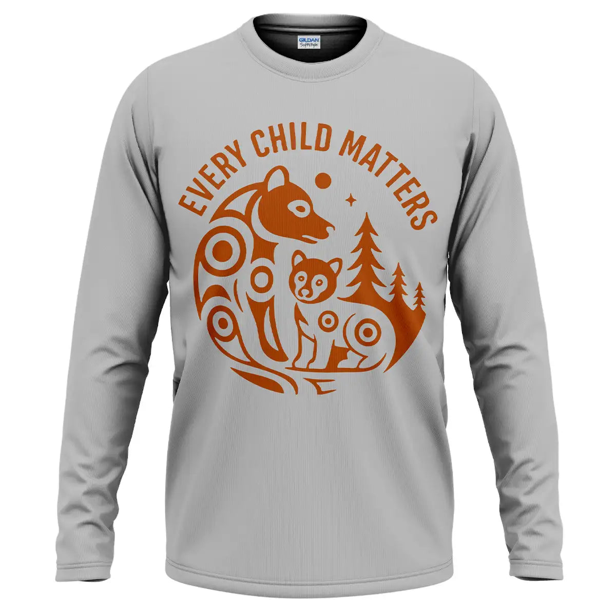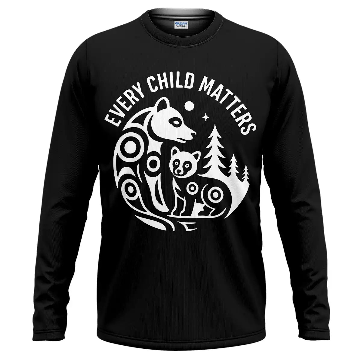 Along the Pacific Northwest coast, Haida and Tlingit families tell stories through flowing formline lines. This design circles a watchful bear and cub beneath moon and cedar, repeating the promise Every Child Matters. It is made for gentle days and hard conversations. The fabric feels soft, the fit stays true, and the print holds detail after many washes so you stop tugging and doubting sizes. Wear it for awareness walks, classroom programs, or quiet evenings. Let the bear keep children in view, invite care, and turn everyday clothing into a reminder that safety, learning, and love belong to every child.