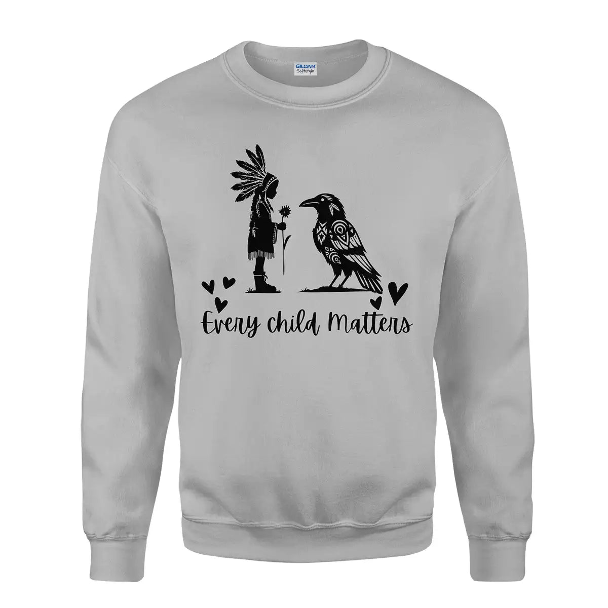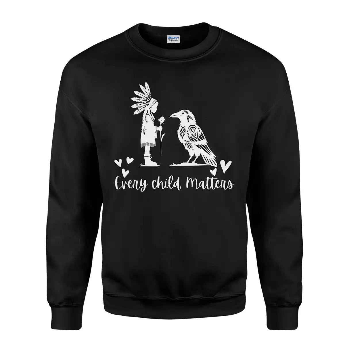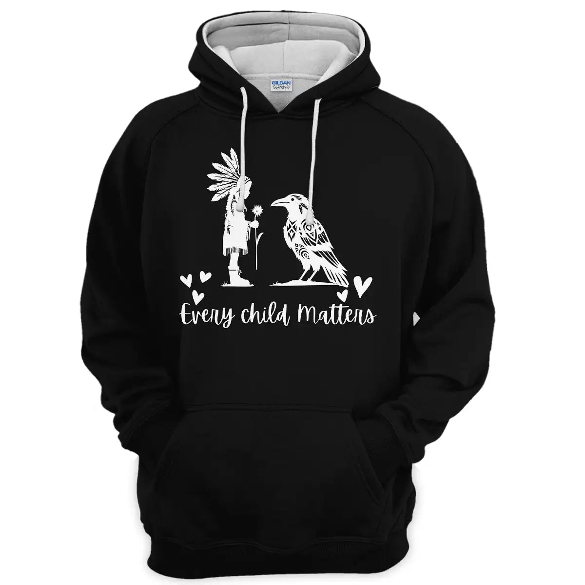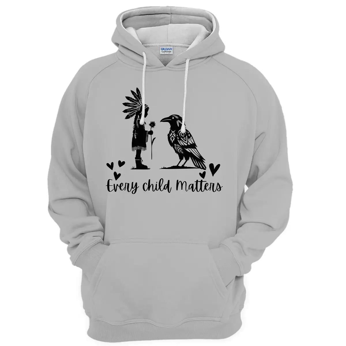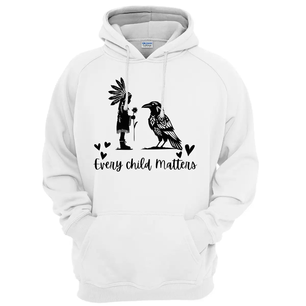 This hoodie features a powerful Native American-designed design that symbolizes unity and respect for every child. The artwork includes a tribal figure holding a flower and a stylized raven, with the words "Every Child Matters" beneath them. Drawing inspiration from indigenous cultures, this design represents the importance of acknowledging and honoring all children, regardless of their background. The black and white illustration captures a timeless connection between humanity and nature, making it a meaningful piece for anyone who values cultural heritage and social awareness. Perfect for those looking to make a statement with their fashion while showing support for Indigenous rights.