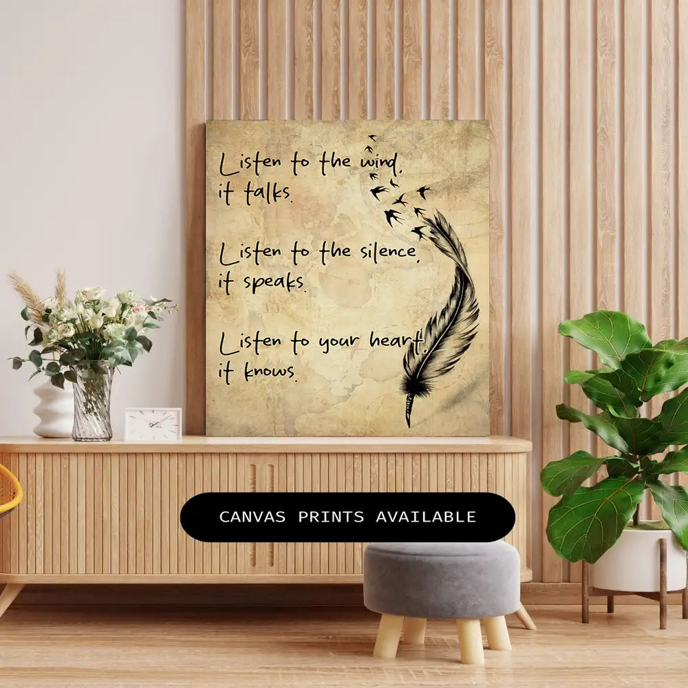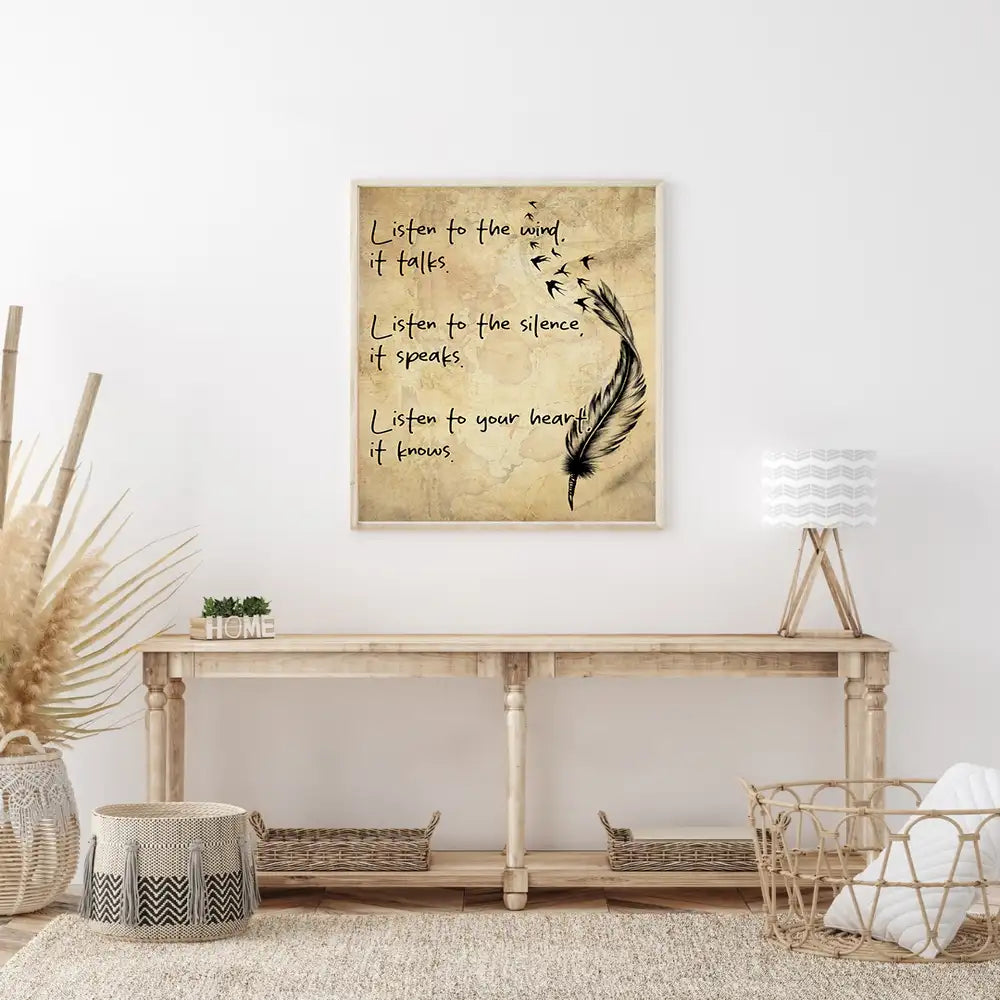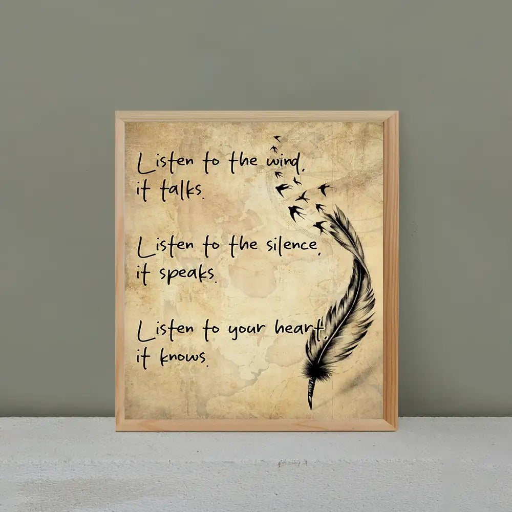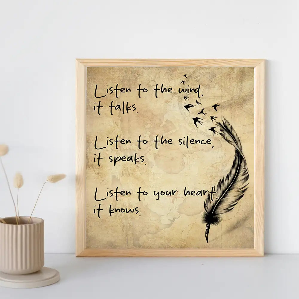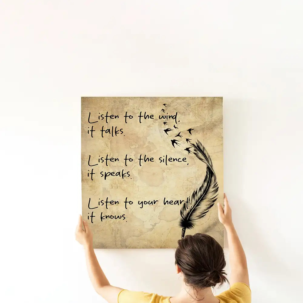 This beautiful canvas art piece draws inspiration from Native American culture, blending the power of nature with spiritual wisdom. Featuring the inspirational quote, "Listen to the wind, it talks. Listen to the silence, it speaks. Listen to your heart, it knows," it speaks to the importance of connecting with the natural world and trusting in inner guidance. The feather and bird imagery symbolize freedom and the wisdom of the wind, creating a calming and thoughtful addition to any space. This piece is perfect for anyone seeking peace, reflection, and a deeper connection to nature and their inner self.