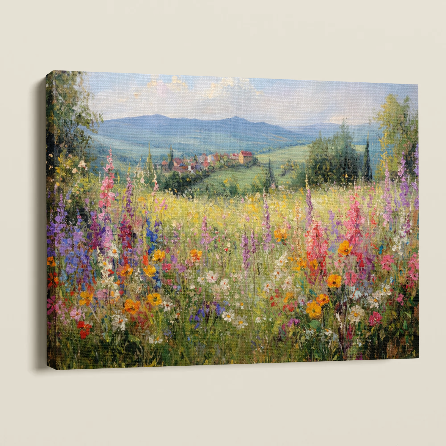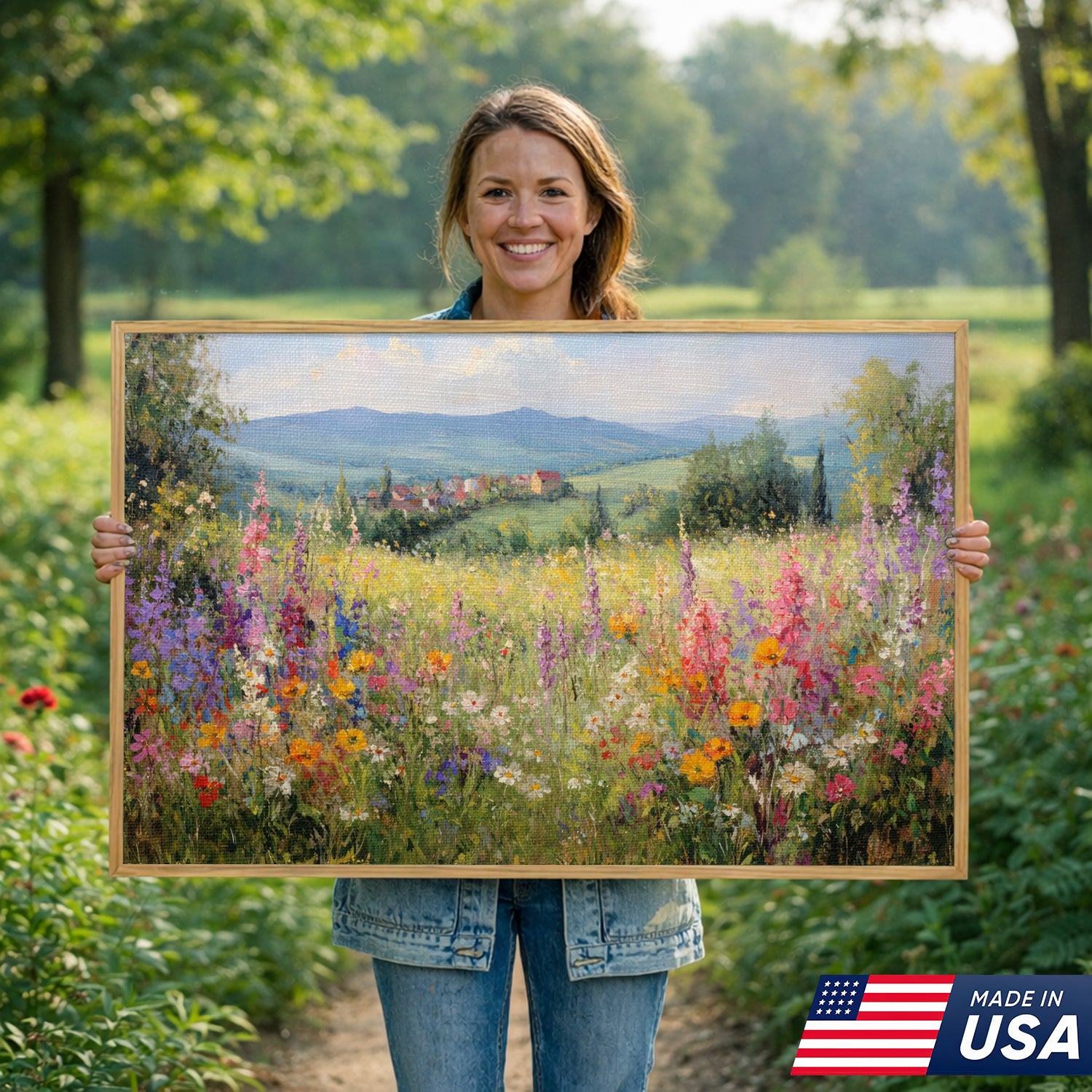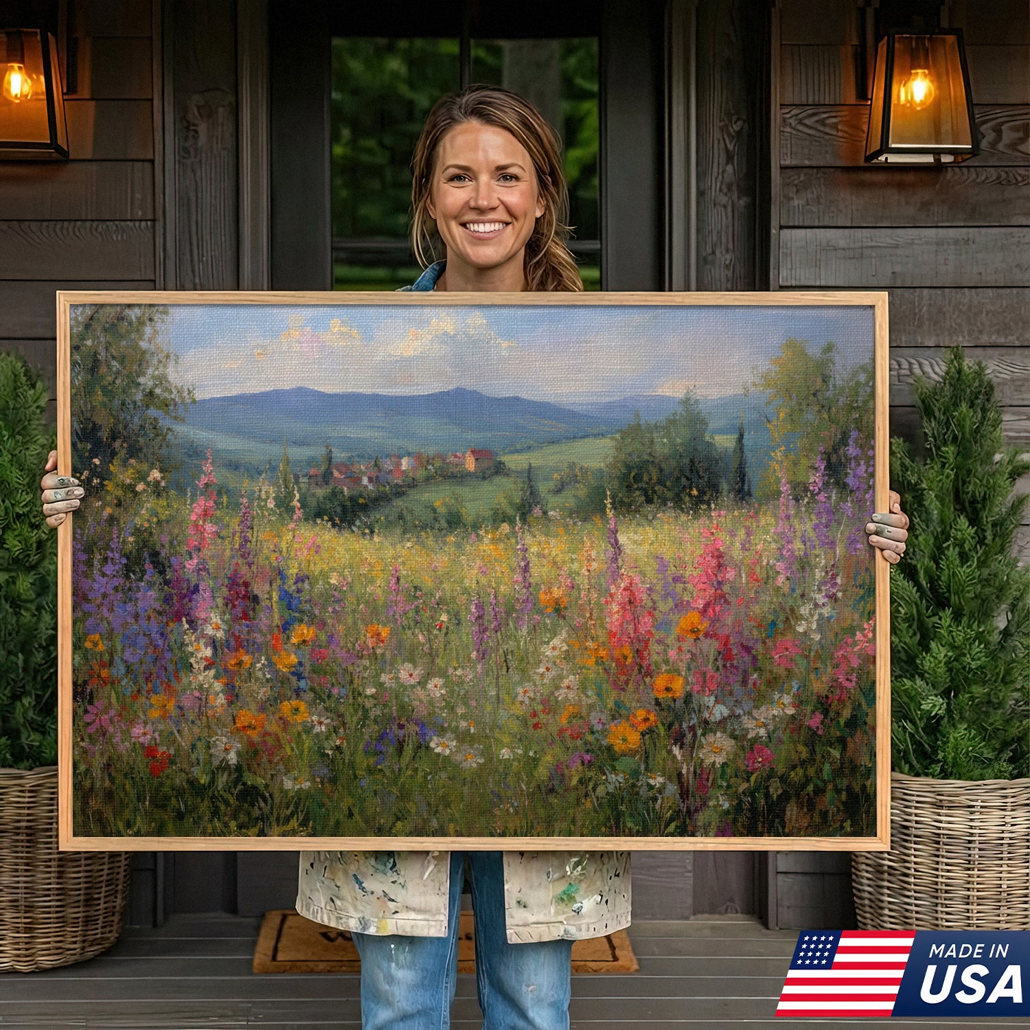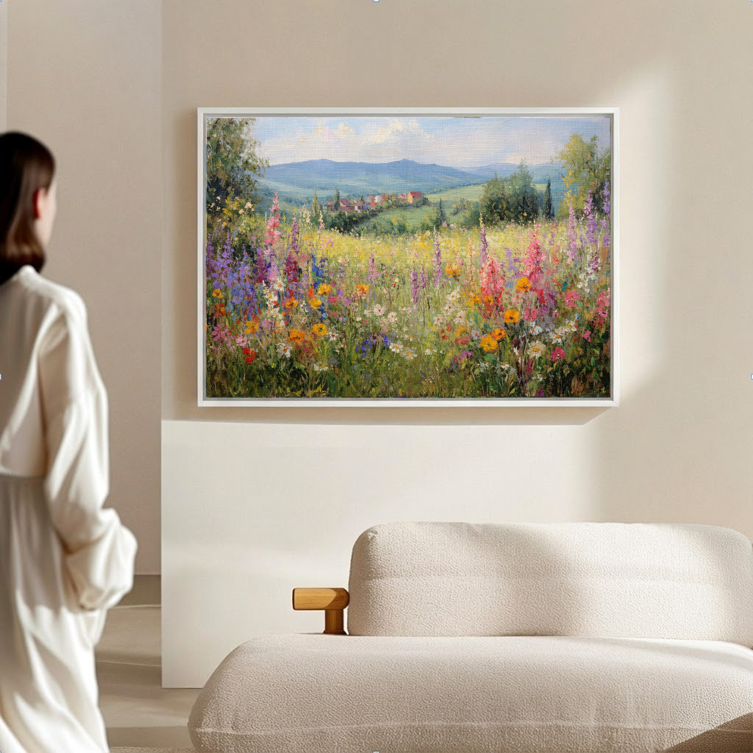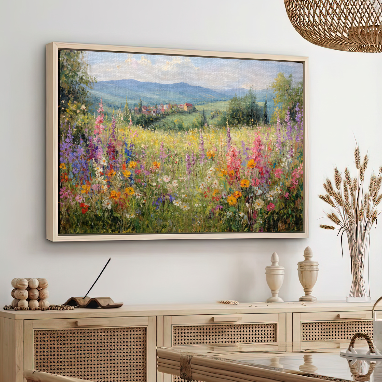 Flowering Hillside Framed Canvas – Abundant Village Landscape