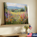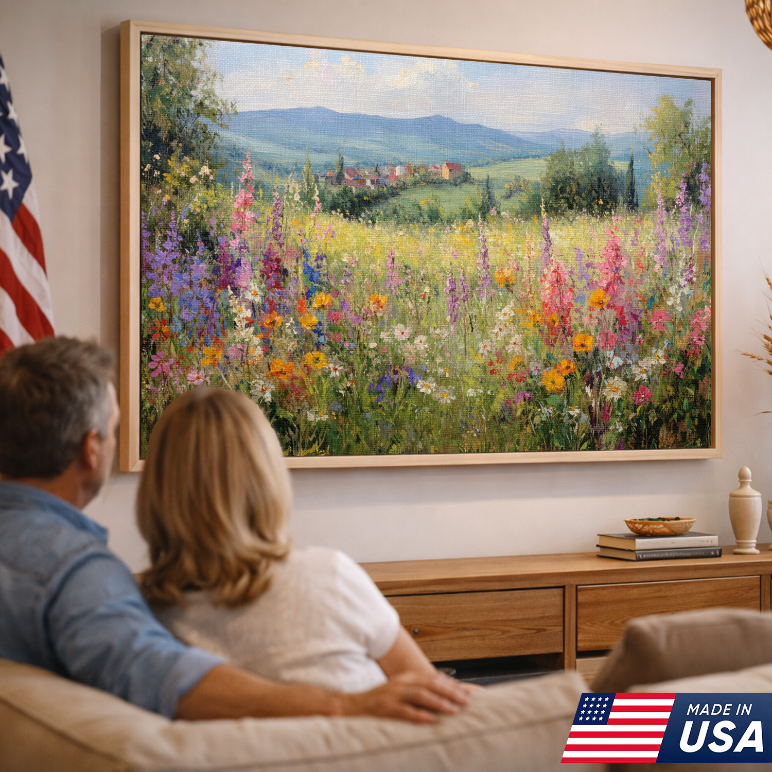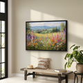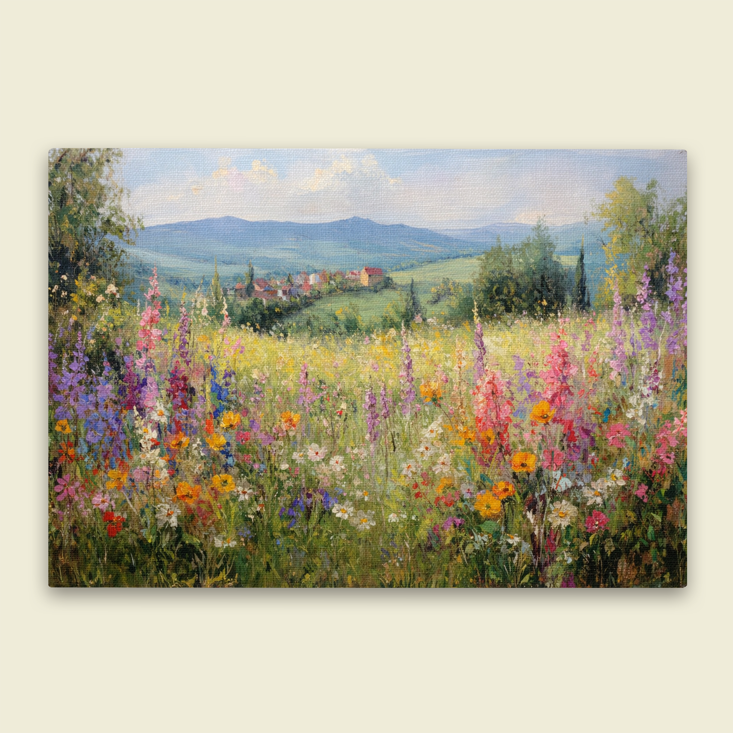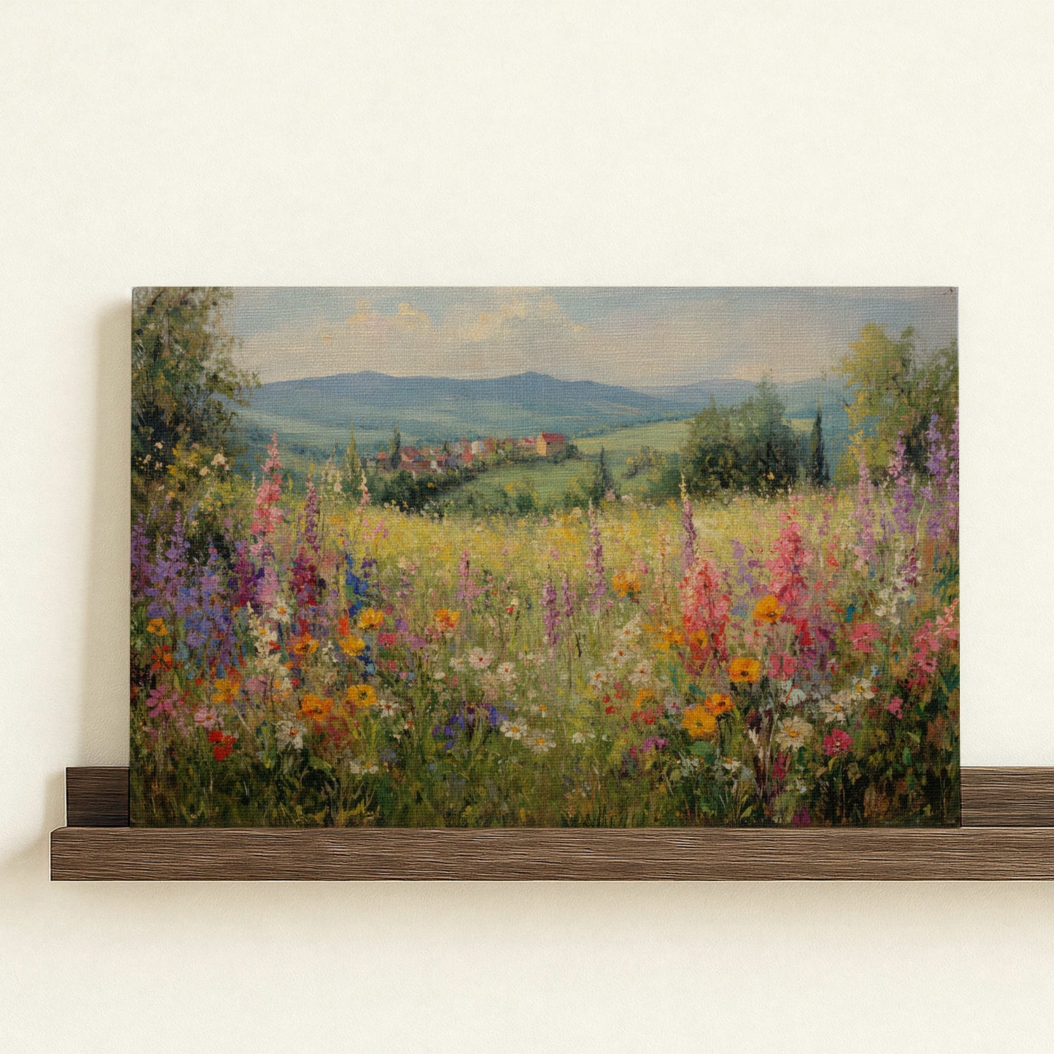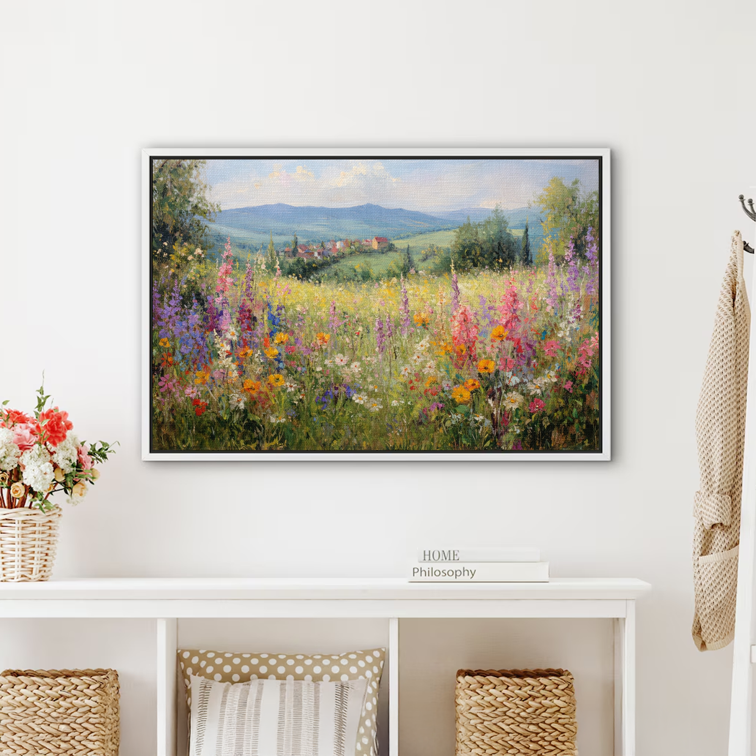Flowering Hillside Framed Canvas – Abundant Village Landscape