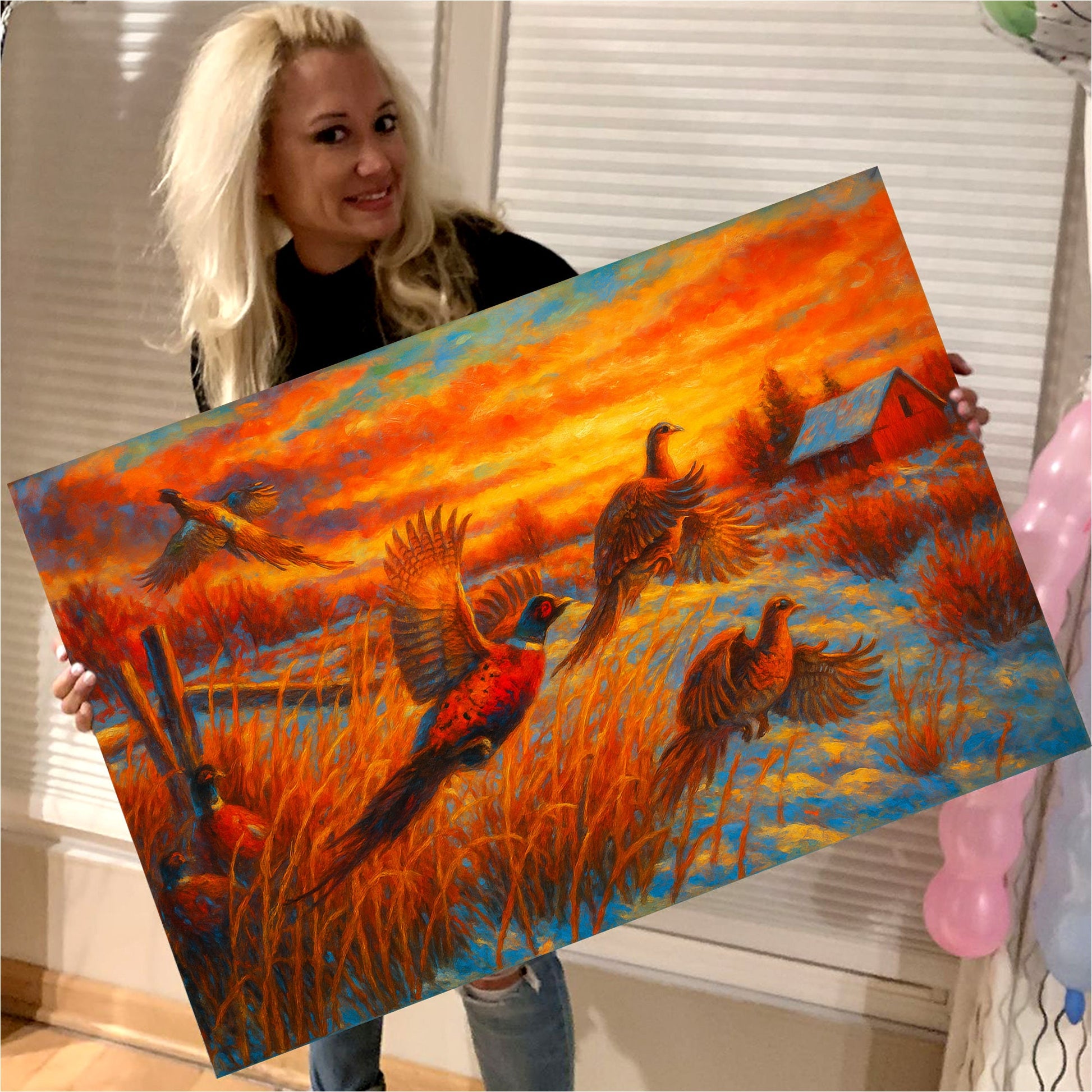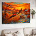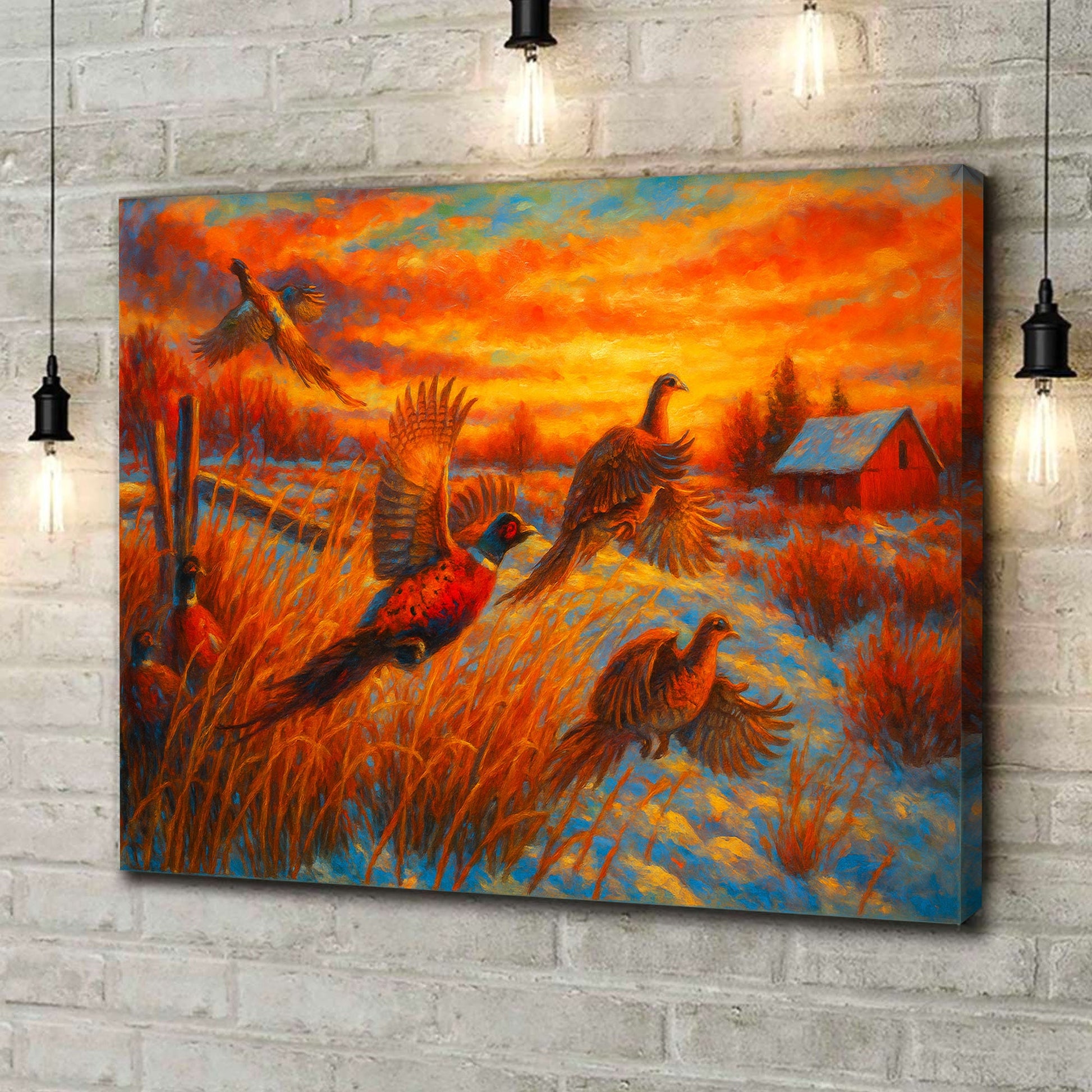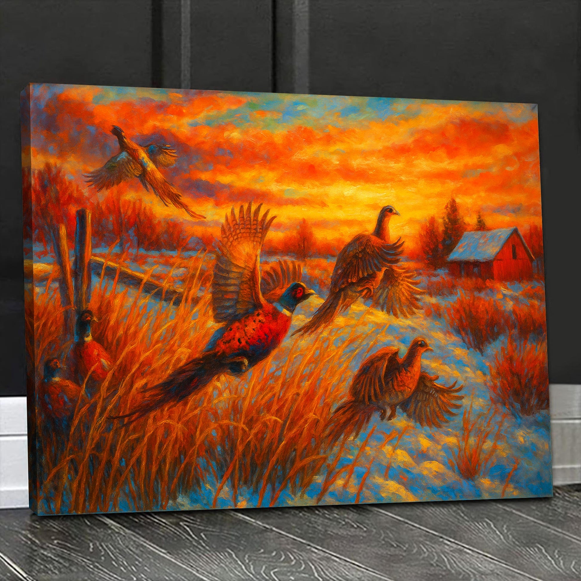 Flying Pheasants Sunset Canvas Wall Art – Rustic Hunting Cabin Decor for Nature Lovers