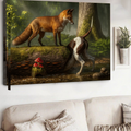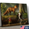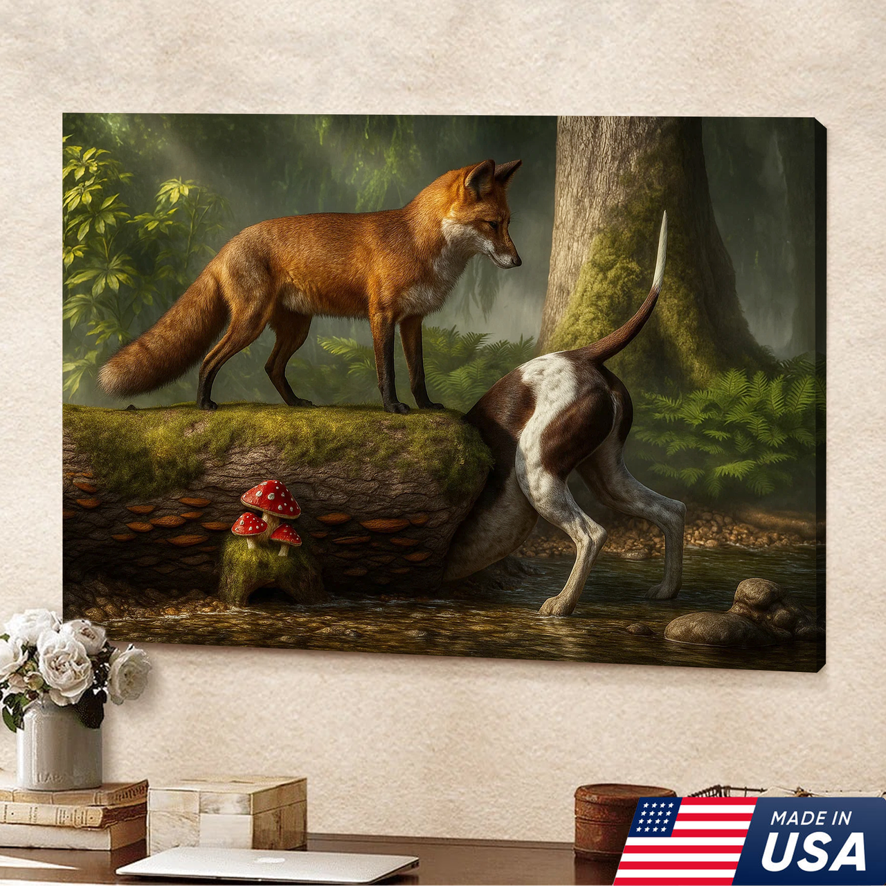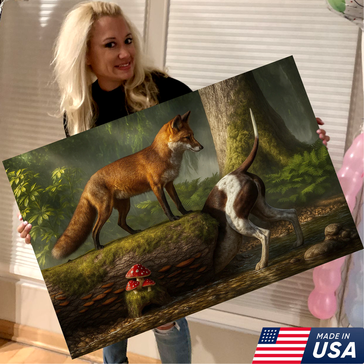 Fox and Hunting Dog Funny Canvas Wall Art – Rustic Wildlife Decor, Woodland Animal Painting, Nature Lodge Artwork