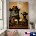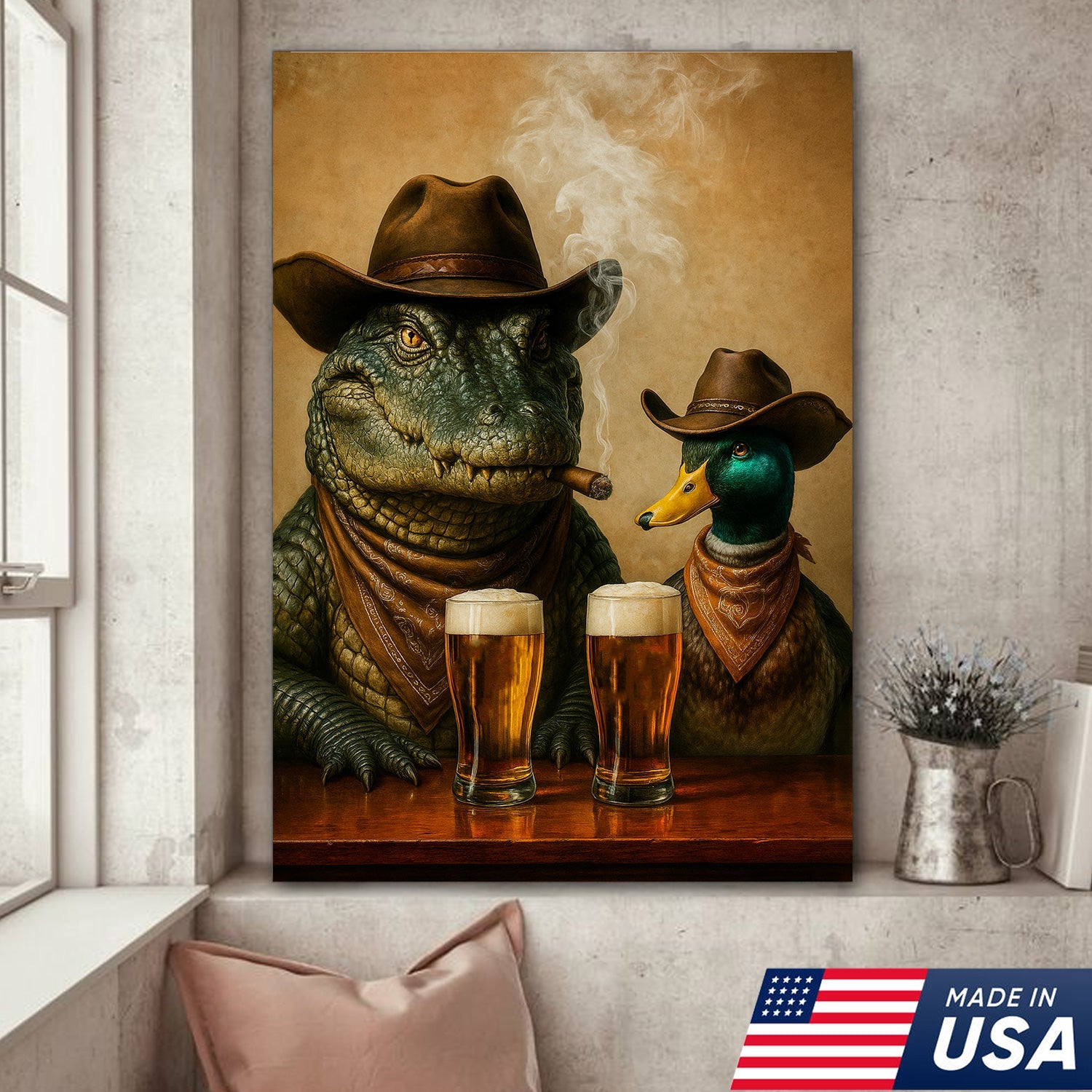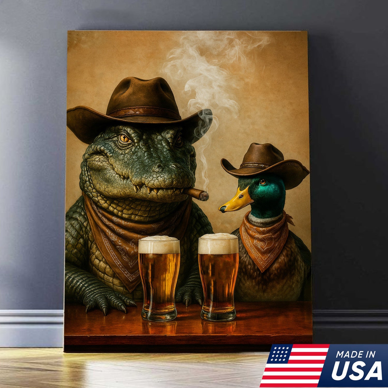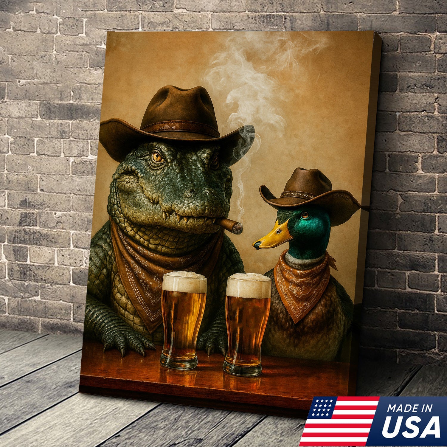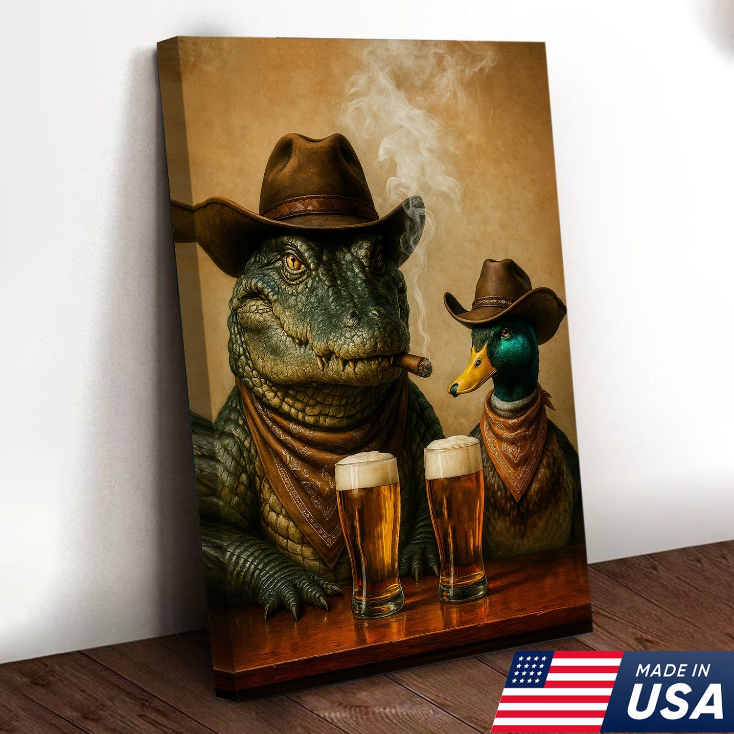 Funny Alligator and Duck Cowboy Canvas – Rustic Wildlife Bar Wall Art Gift for Hunters and Lodge