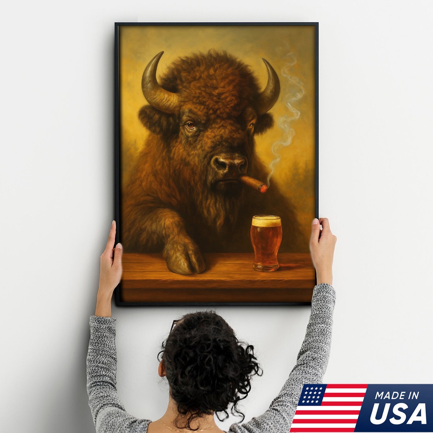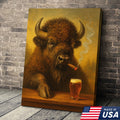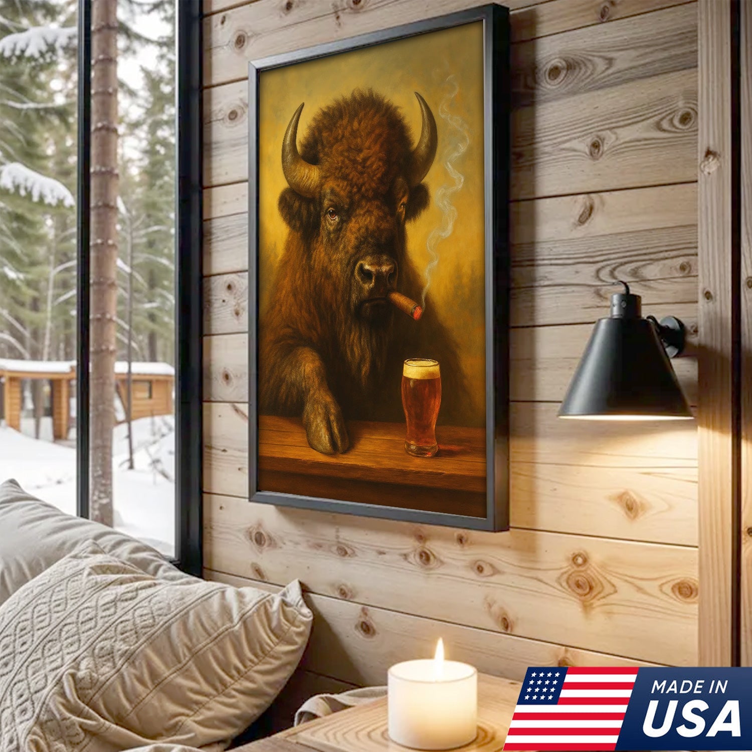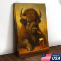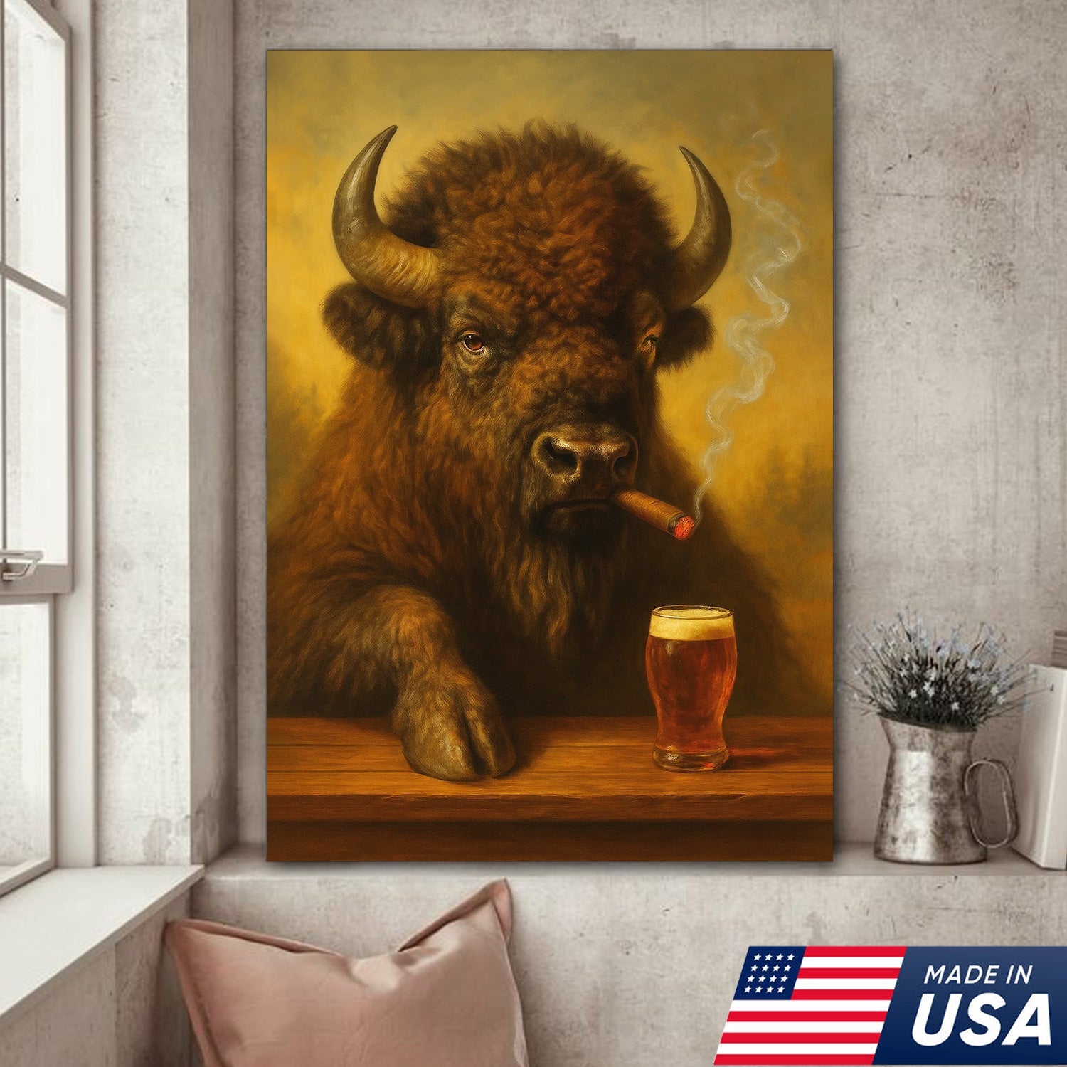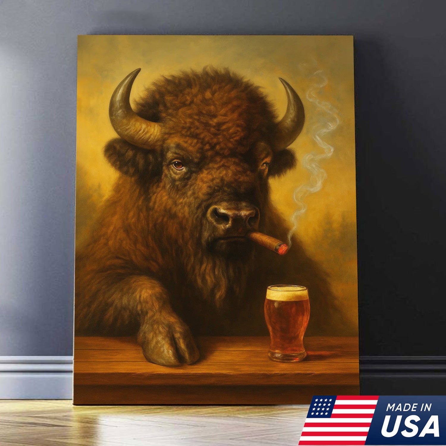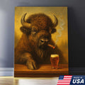 Funny Bison Smoking & Drinking Canvas Wall Art - Rustic Bar & Hunting Lodge Decor