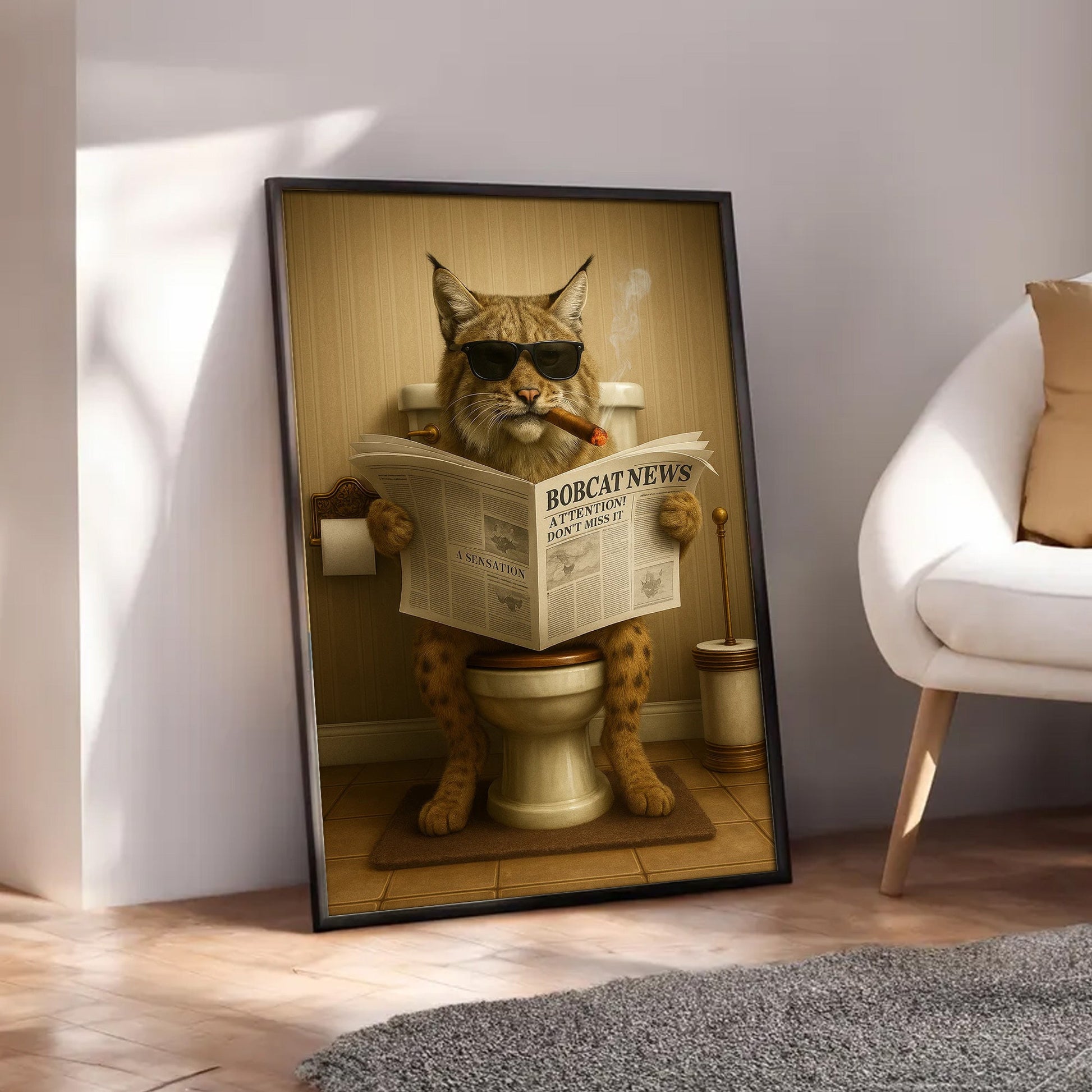 Funny Bobcat Bathroom Wall Art – Rustic Wildlife Decor for Men, Hunting Cabin Poster, Hilarious Gift for Dad